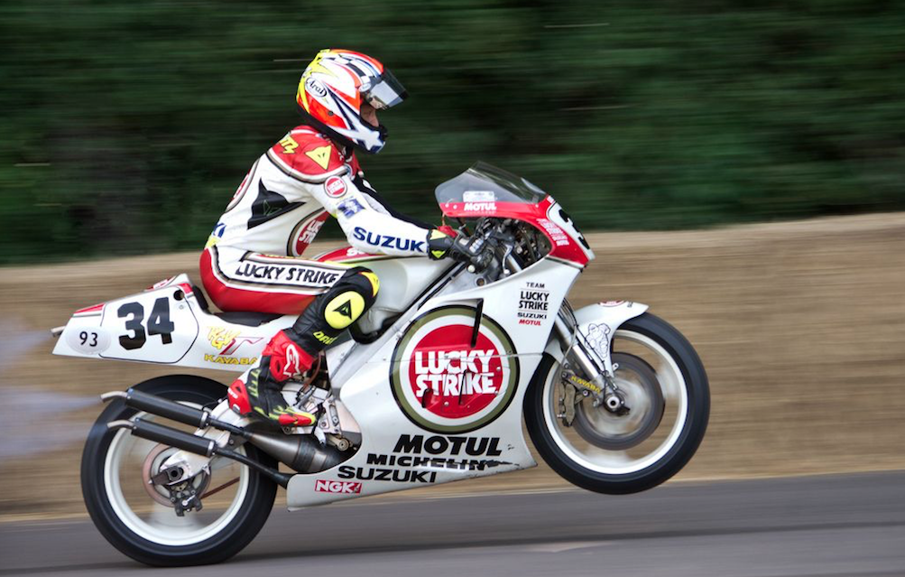 The famous American brand, present in several films and songs, sponsored Team Suzuki from 1992 to 1997 in the 500 class, with white livery that featured the iconic red circle on the side: the most important success was the 1993 world championship won by American Kevin Schwanz.