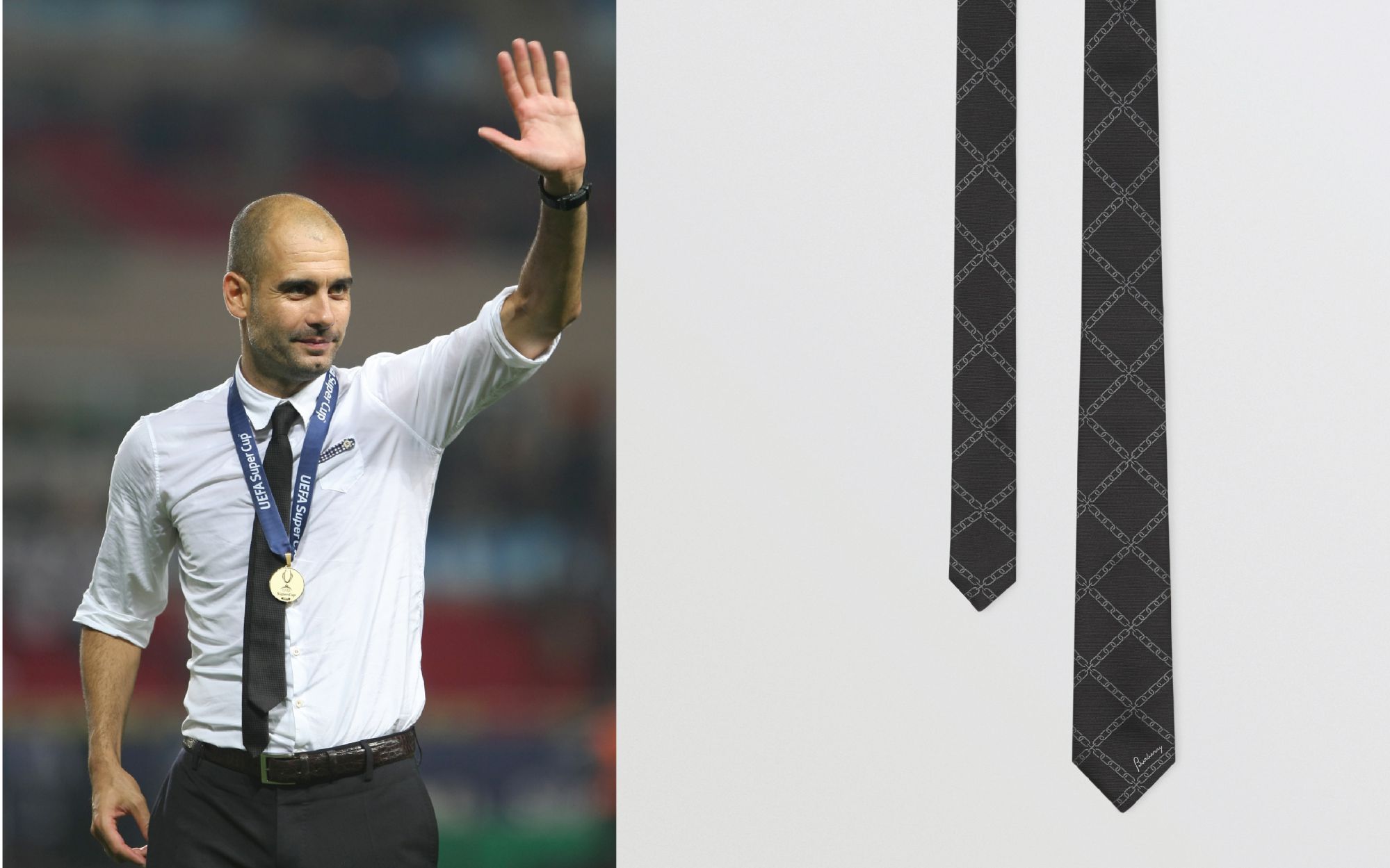 When he was at Barça Guardiola he used to wear the suit. Gray jacket and trousers and a strictly thin tie. The last item to complete an ideal outfit is a tight silk tie with Burberry chain print.