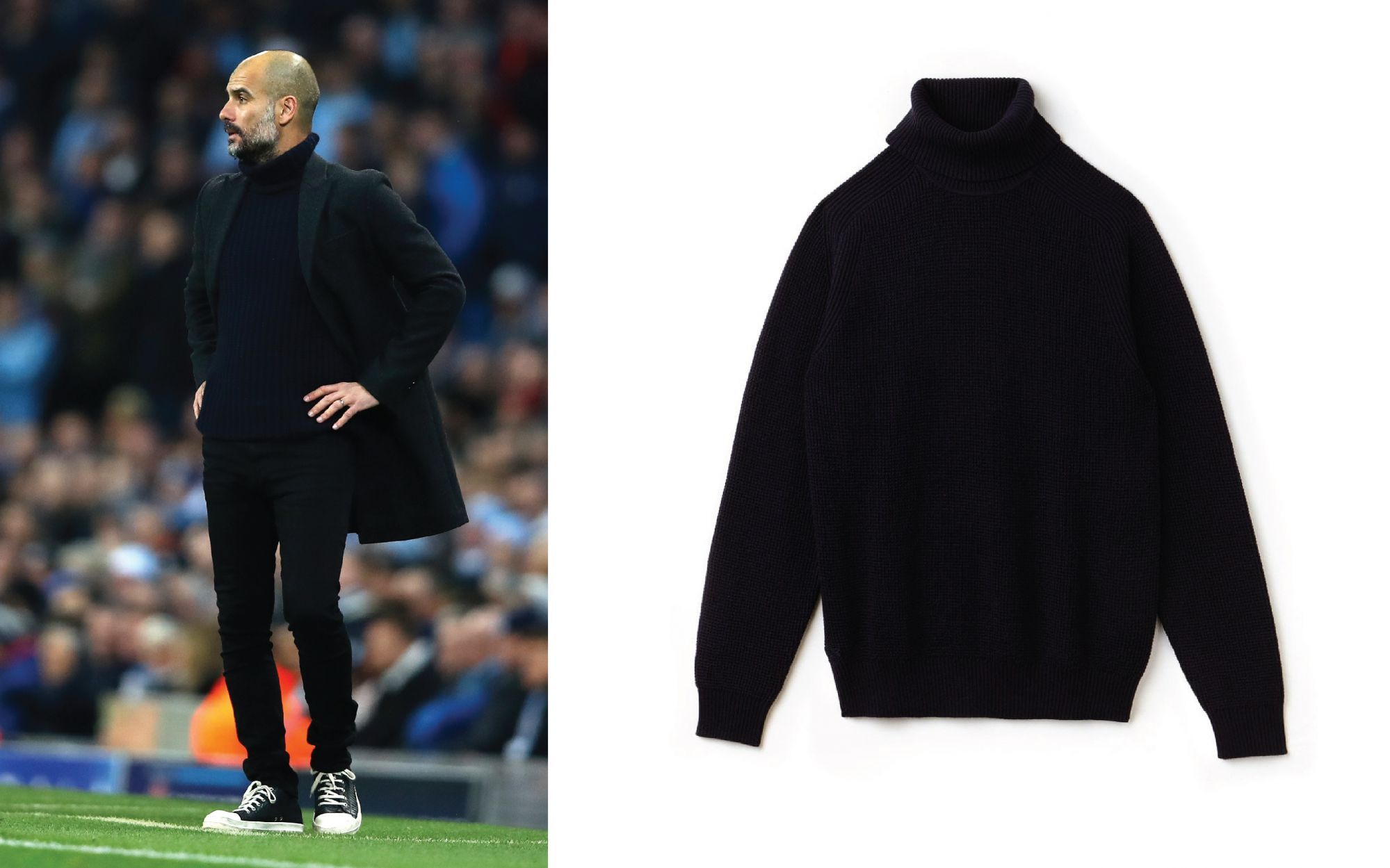 If the blue turtleneck sweater is not a classic then there is no classic. In this case, Pep puts a wide ribbed one combined with a gray coat. The item to have in this case is a nice pullover with high collar in wool and embossed Lacoste cotton, perfect.