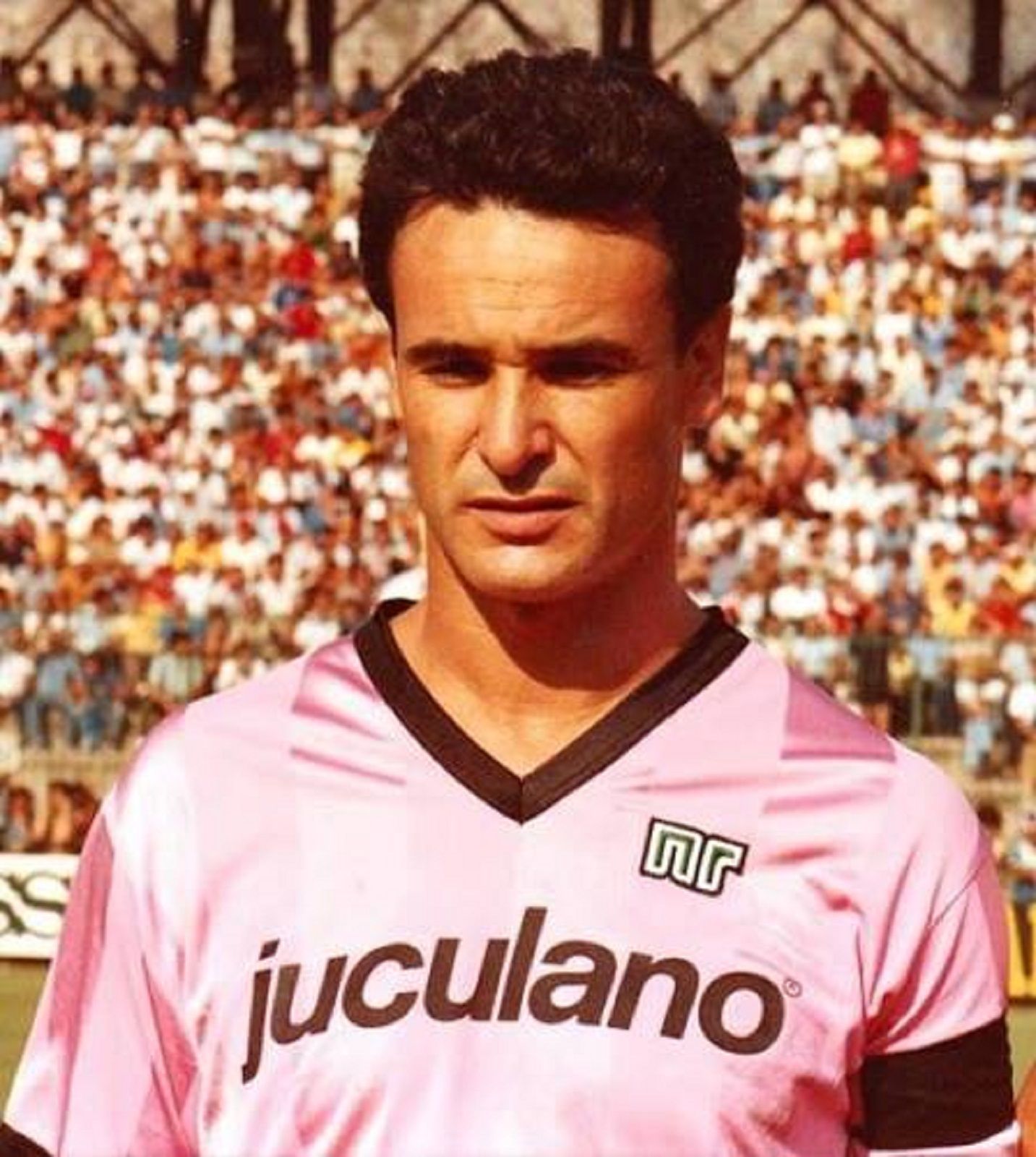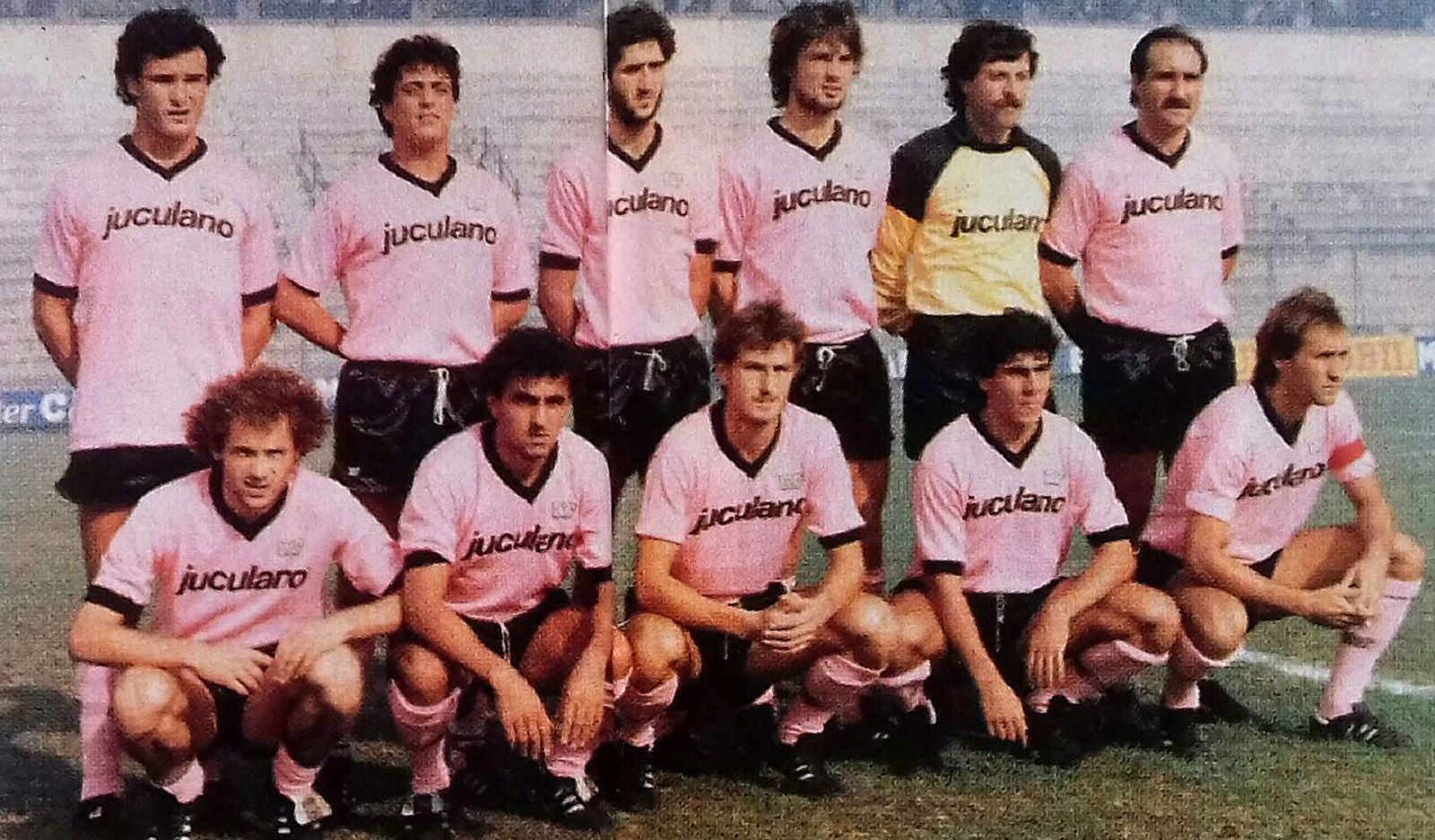 The rosanero, part of the Serie C and Ennerre signed on the jerseys, had a positive season that year, ending promoted in Serie B from Serie C. Palermo home jersey for that season was simpler than you might think: pink wool, classic black V collar and borders of the same colour on the extremities of the sleeves. By the way, there is no crest on the jersey; the main sponsor was Juculano. The kit was completed by black shorts and pink socks. And that one in the photo that you can see is Claudio Ranieri at the ending of his career.