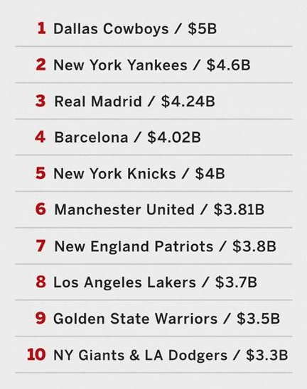The World's 10 most valuable sports teams 2019, according to Forbes Also this time the ranking is dominated by American sports and at the top there are the NFL giants from Texas