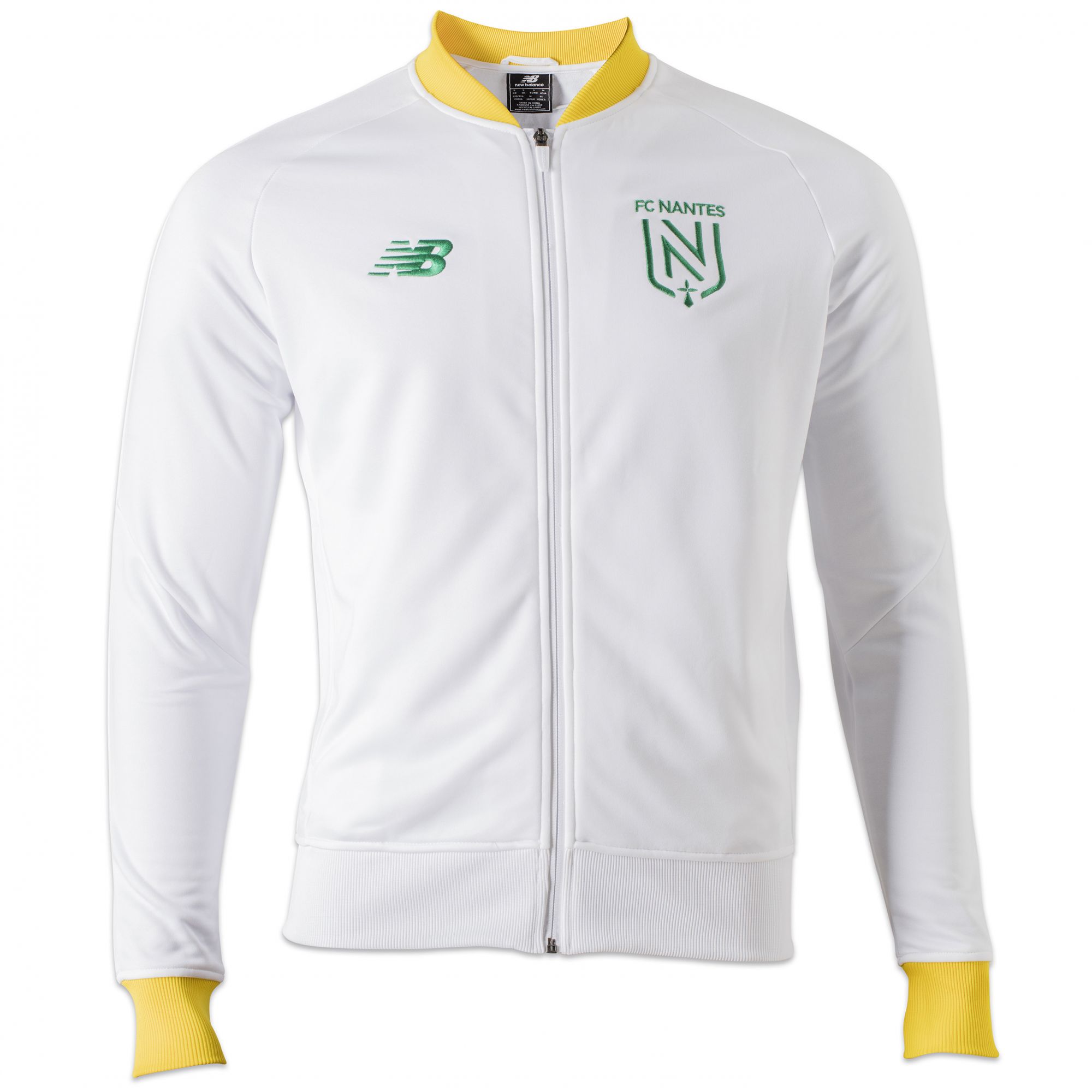 Maybe it's simply because of the American technical supplier that the Nantes anthem jacket, the big surprise of these first two months of Ligue 1, is part of that category of pre-match jackets that clearly take a cue from the US bomber jackets. White with yellow collar and cuffs, the jacket presents the American brand logo and the club crest dyed green on the sides of the chest.