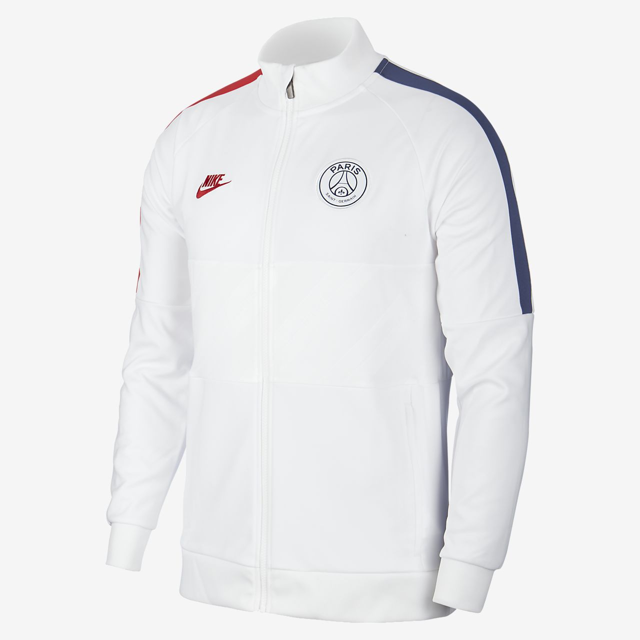 Used with the new third kit, PSG's pre-match jacket deserved a place in the Top 8. Dyed cream white, the jacket contains a few details, but remarkable: two stripes on the shoulders (red to the left, blue to the right), the PSG crest in relief black on white on the top left and the Nike Sportswear logo dyed red on the opposite side.