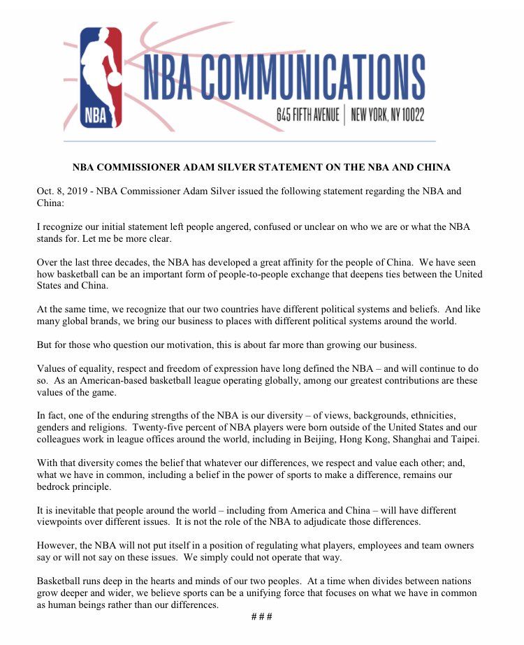 "I want to be extremely clear on this point: we do not want to apologize because Daryl Morey has exercised his right to have an opinion. What I regret is that there are so many disappointed people for what he said, including millions of our fans. It is incongruent to defend freedom of expression, which we consider one of the founding values of our league, and at the same time understand what our partners feel: I hope our Chinese friends will remember our thirty-year relationship, all we did in China to help the spread of this sport The values of equality, respect and freedom of expression have long defined the NBA and will continue to do so. As a basketball league with an American base that operates globally, among our major contributions are these values of the game. People around the world will inevitably have different points of view. It is not the job of the NBA to judge these differences or regulate raise what the people of the league choose to say."
