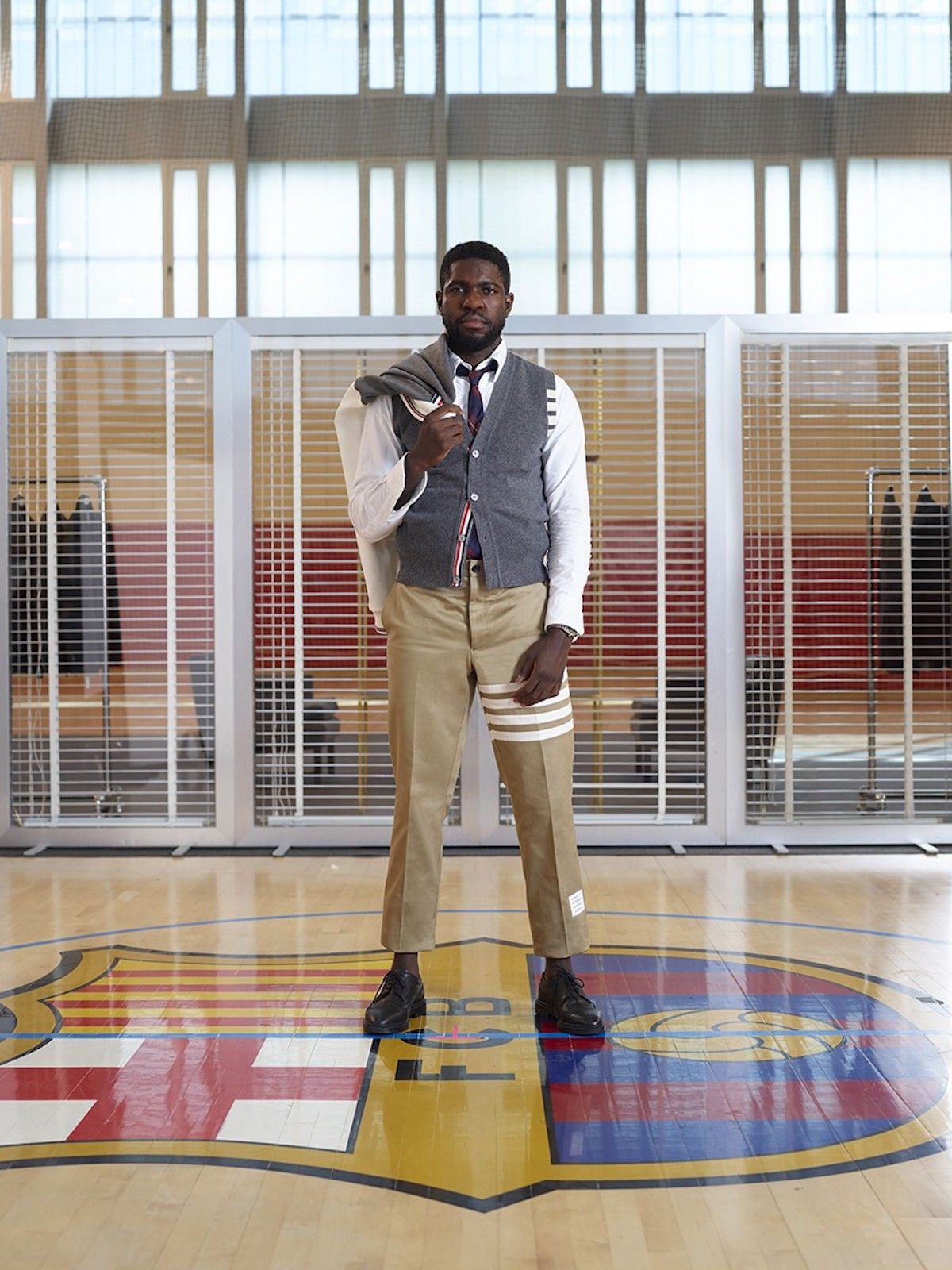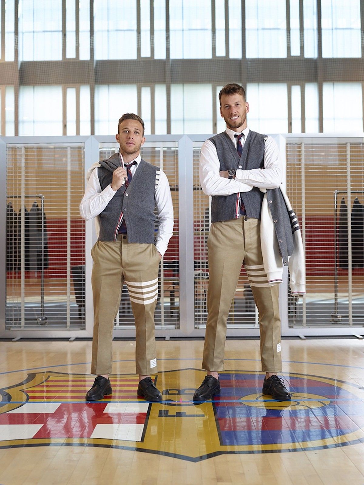 Last season the arrivals of FC Barcelona players at the airport during the away games were one of the highest moments of football-fashion, thanks to the very elegant Thom Browne suits. For the second consecutive year, FC Barcelona collaborates with the New York brand, which will be the formal partner of the Blaugrana, with a collection inspired by collegial uniforms, as shown by the varsity jacket and the campaign images, taken inside a gym.