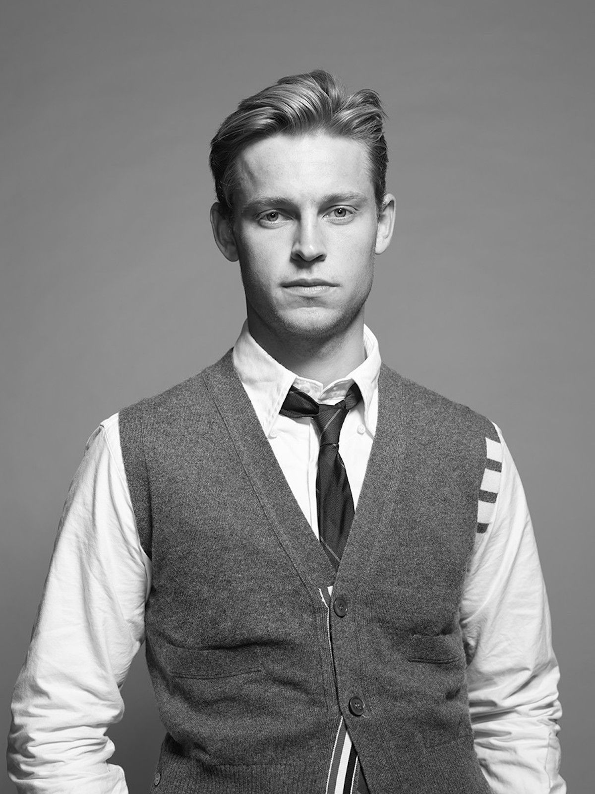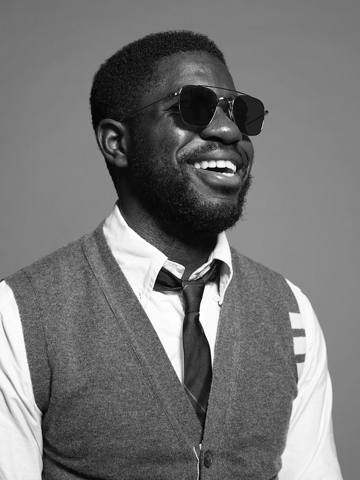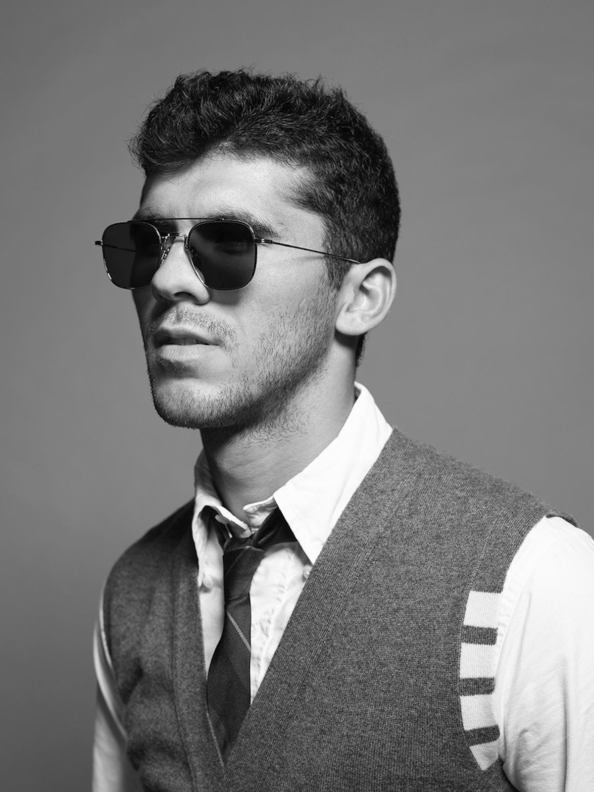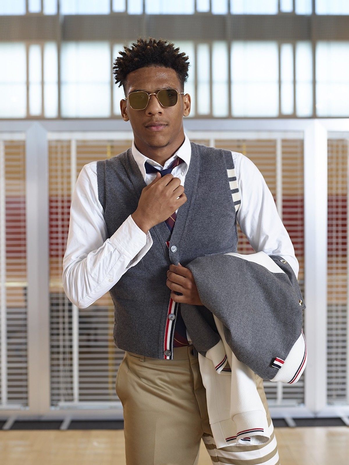 The Barcelona official looks consists of chino pants, a white oxford shirt, a gray cashmere cardigan, a blue-red-yellow tie and a gray varsity jacket with white sleeves. Part of the shots is also a collection of aviator glasses with brown lenses.