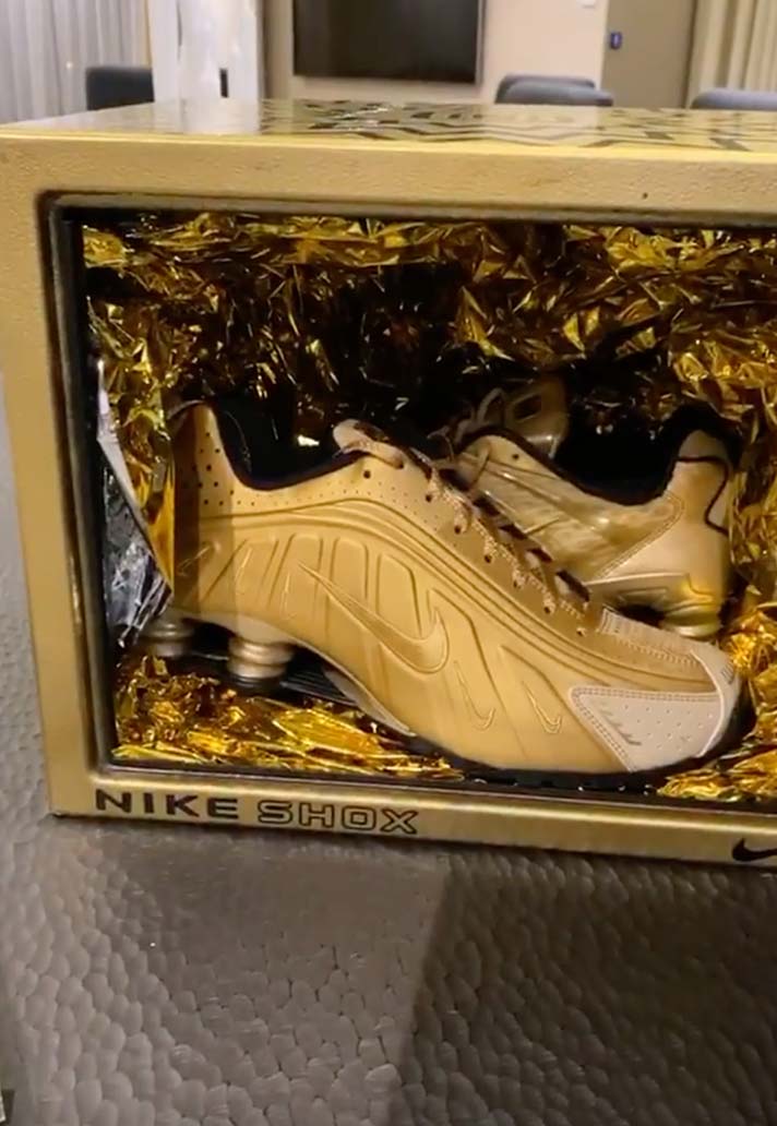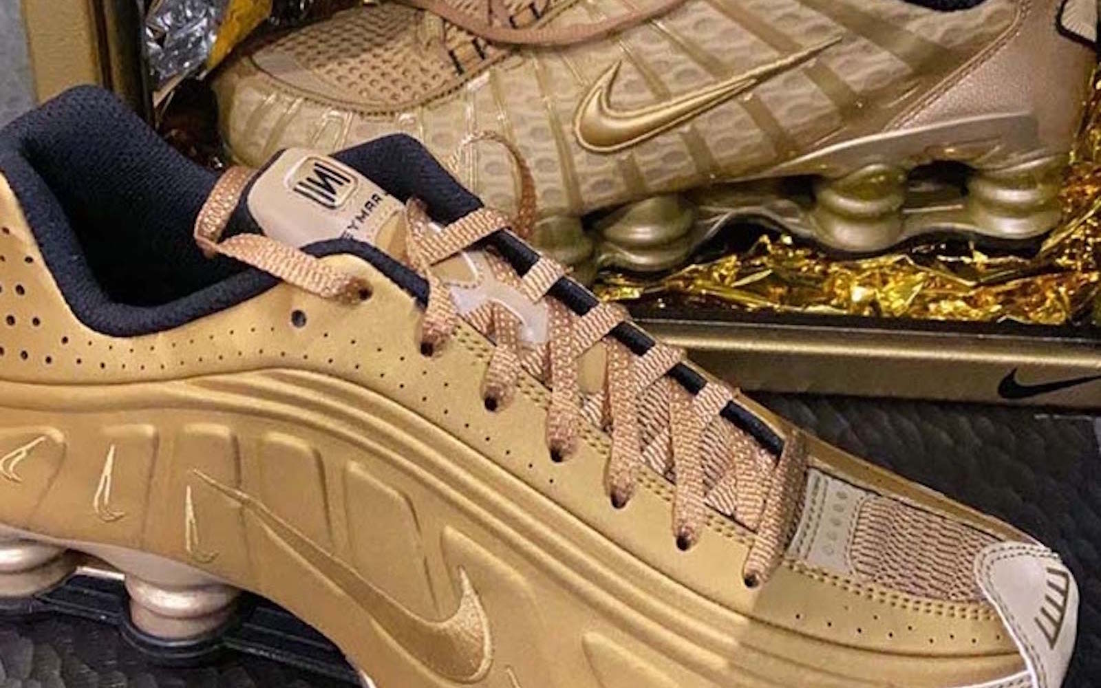 After the Shox R4 released in two different colors in May and the TL presented in July, Neymar showed on Instagram both the R4 and TL model, in a new golden edition, arrived under lock and combination, that Neymar opened documenting everything in a story. At the moment it's not clear if the new Shox will be part of a wider release or if it's just a Christmas gift from Nike.
