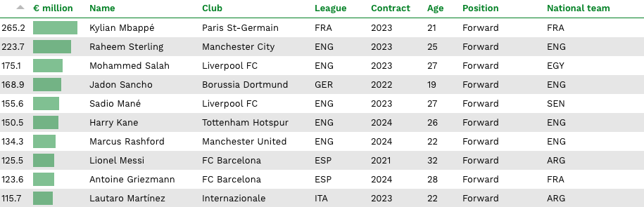 The 10 most valuable footballers in the world, according to CIES The number 1 is Mbappé, and in the Top 20 there are 11 players from Premier League