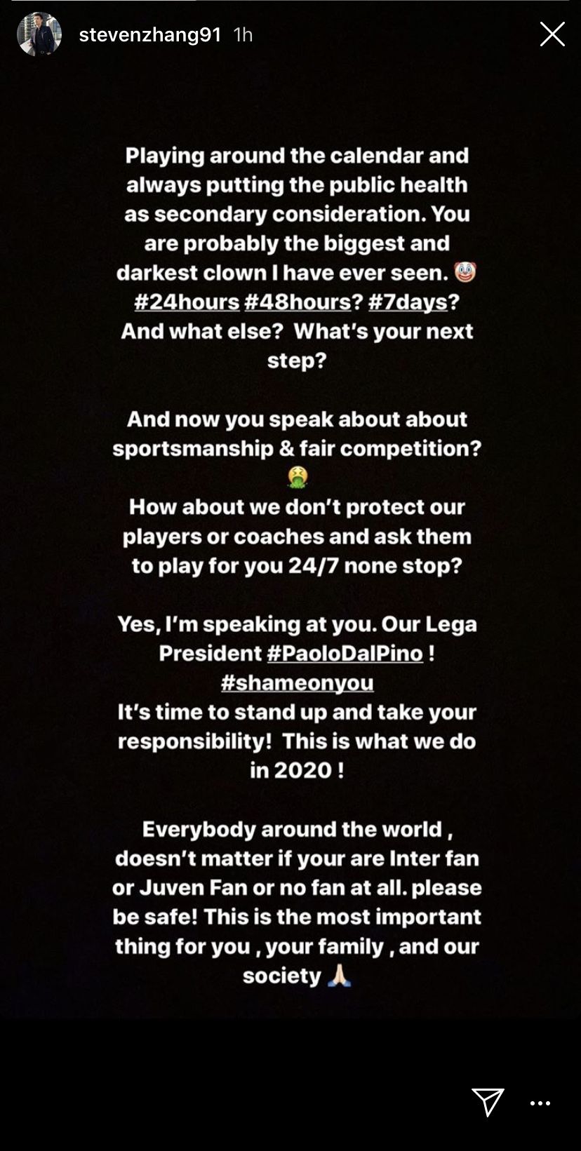Playing around the calendar and always putting the public health as a secondary consideration. You are probably the biggest and darkest clown I have ever seen. #24hours #48hours? #7days? And what else? What's your next step? And now you speak about sportsmanship & fair competition? How about we don't protect our players or coaches and ask them to play for you 24/7 none stop? Yes, I'm speaking at you. Our Lega President #PaoloDalPino! #ShameOnYou. It's time to stand up and take your responsibility! This is what we do in 2020! Everybody around the world, doesn't matter if you are Inter fan or Juve Fan or no fan at all. Please be safe! This is the most important thing for you, your family and our society.