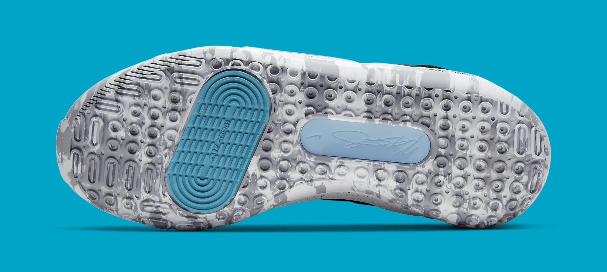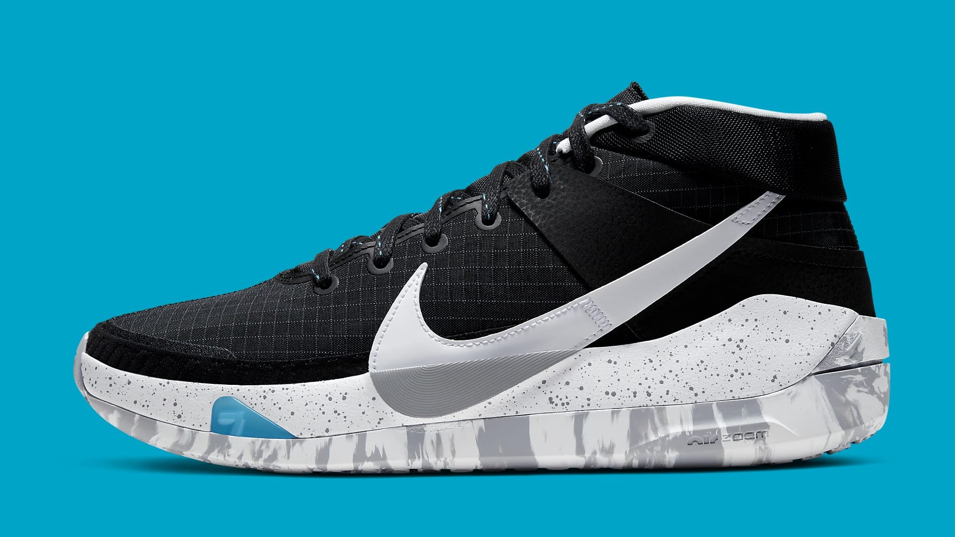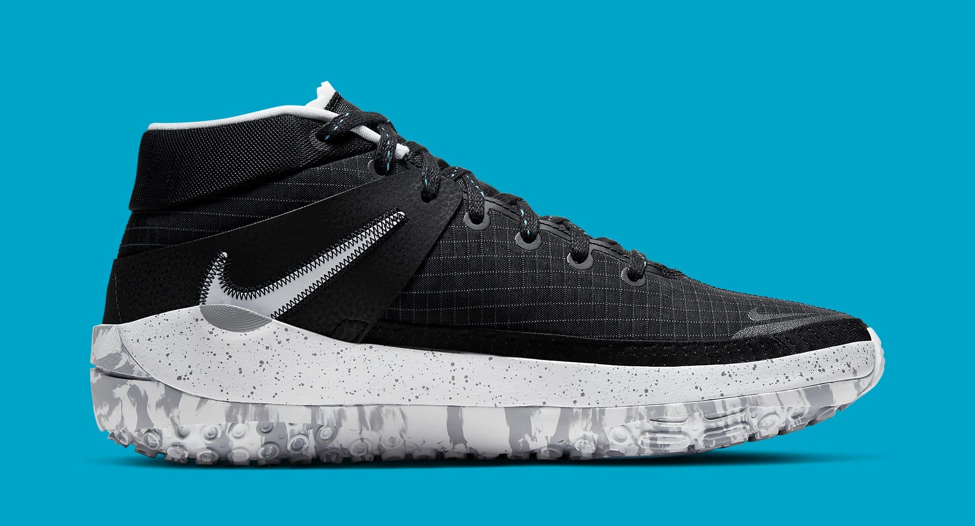 The line is very reminiscent of that of the KD12, although it can be immediately recognized that the materials used are less translucent and much more targeted to the performace, with few Nike details and technologies more present: a black fabric upper with a grid pattern and overlapping materials in the central part of the support while a large lateral white Swoosh descends towards the white and gray spotted midsole. The branding is kept thinner on the medial side, with a small white Swoosh stitched backwards. From the cushioning point of view, the KD13 uses a double layer of Air Zoom technology under the sole of the foot and a full-length Zoom footbed, offering a feeling of support and reactivity that brings with it the Zoom Strobel technology of the KD12.
