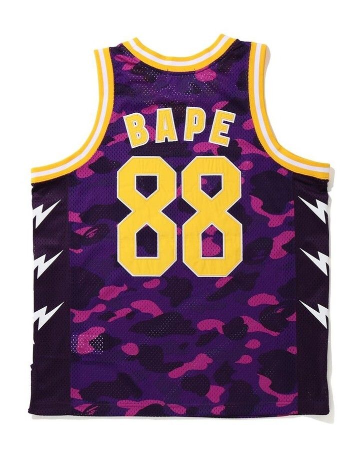 It is a COLOR CAMO BAPE®️ BASKETBALL TANK TOP and a COLOR CAMO BAPE®️ BASKETBALL SHORTS, both in three colors: one red with white and red details, one purple with yellow details and the last blue with orange details.