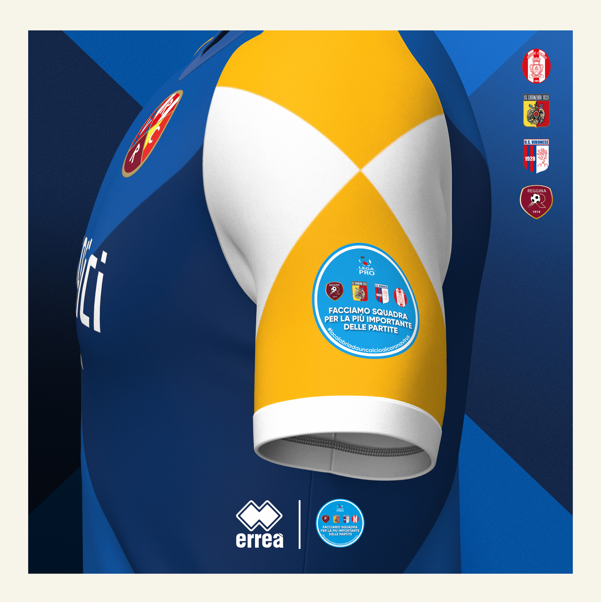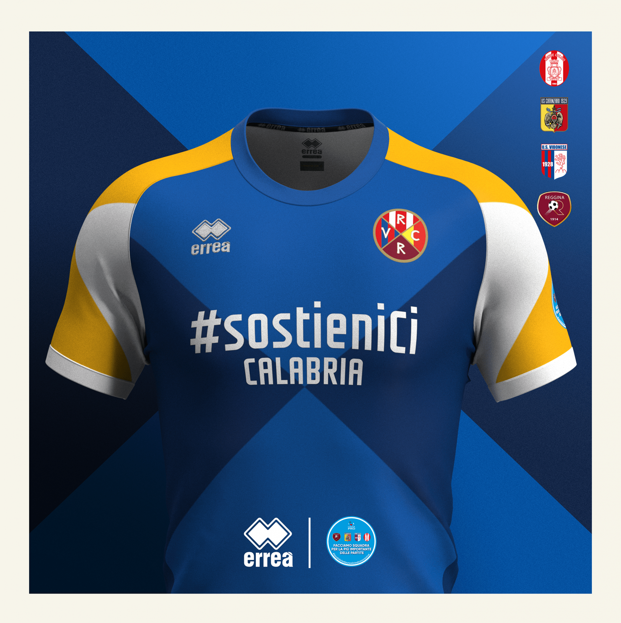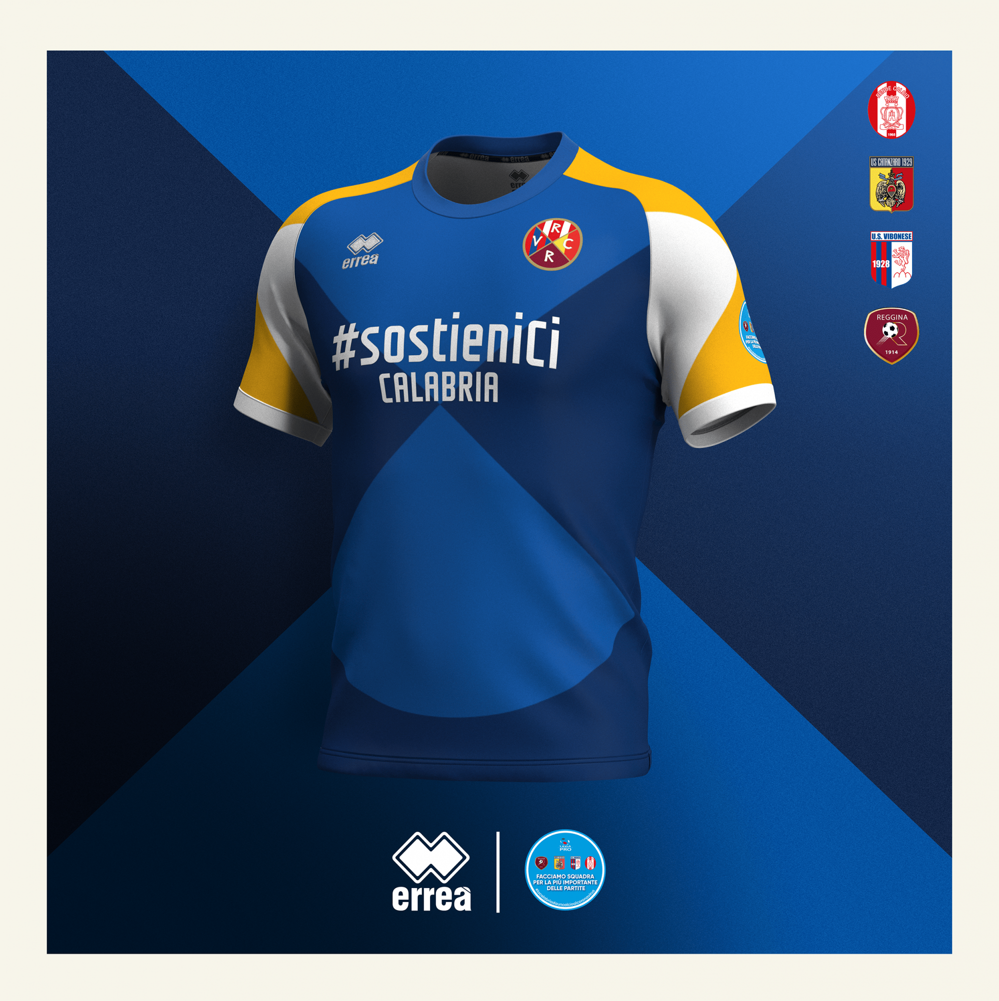 Erreà Sport, former technical sponsor of Lega Pro, U.S. Catanzaro and Rende Calcio, proudly joined the project by creating a special shirt inspired by the yellow-blue colors of the Calabria Region, whose stylized image stands out in the center of the uniform along with the official hashtag of the #sostieniCi campaign.