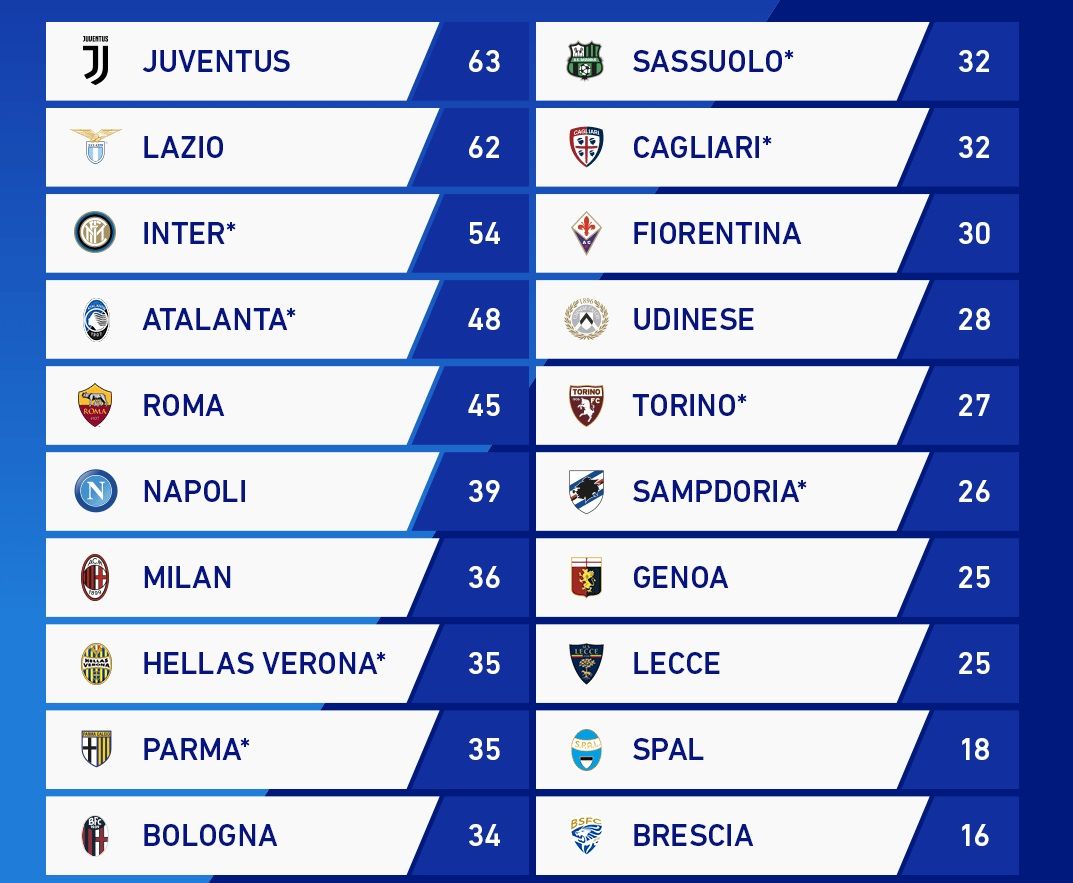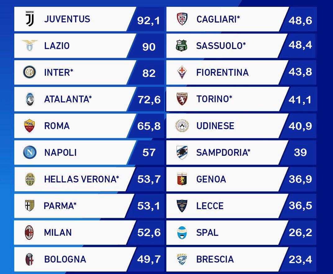 If today, for example, the championship were forced to stop, applying the above formula, the final classification would be the following: