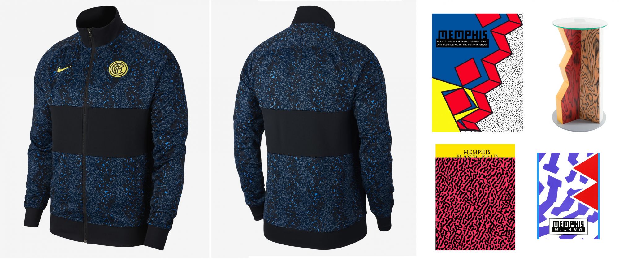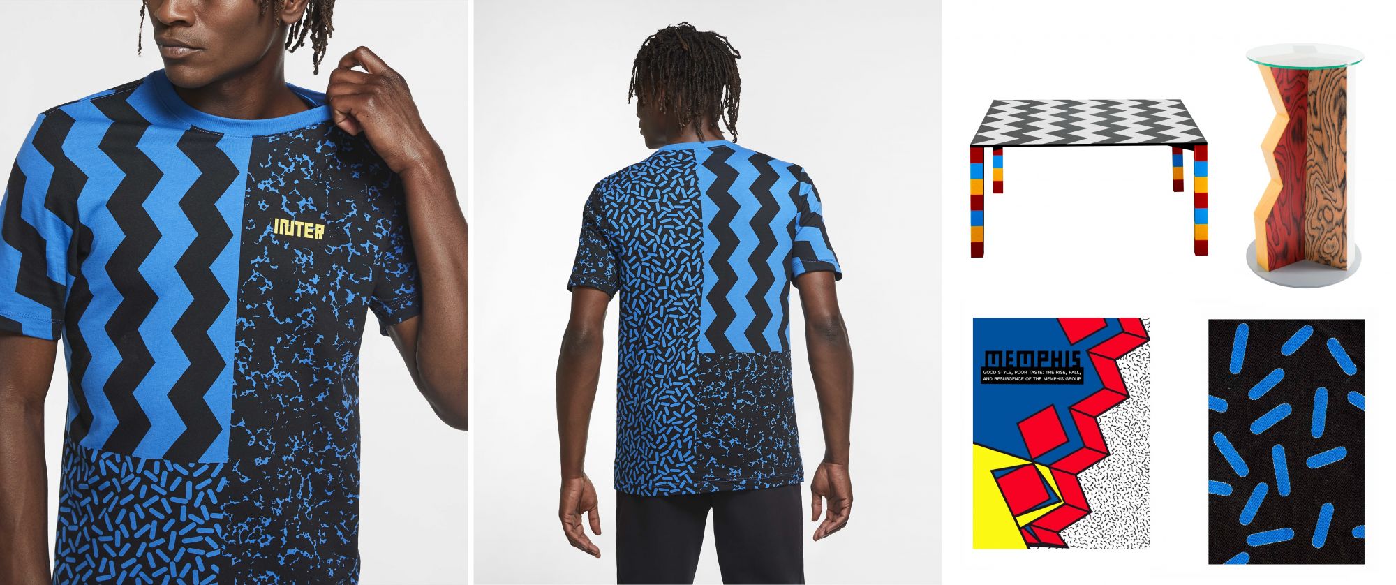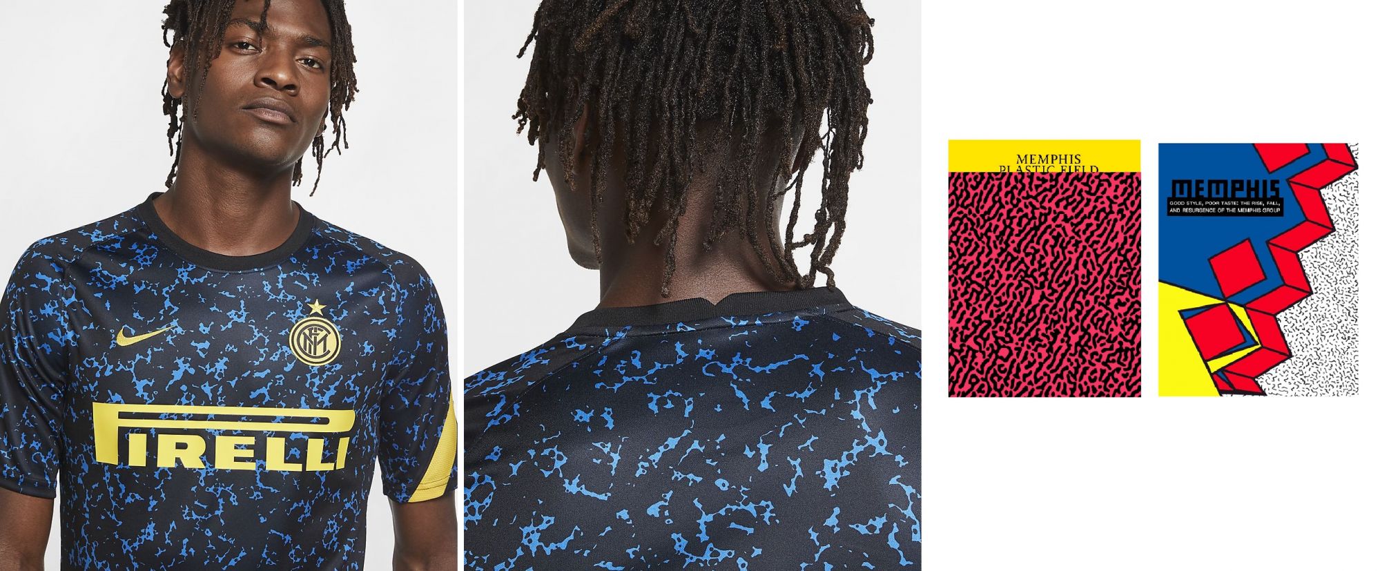 This is precisely the case of the new Inter shirt (which has a much more impactful effect than the photographs) and of the entire dedicated collection, which for the first time stand out as a cultural element detached from the green rectangle. Taking into consideration the jerseys of the last twenty seasons, we note that there has never been such a clear change: the black and blue lines could vary in thickness and symmetry, but, before this year, the concept has always remained the same. Although the 2020/2021 shirt has no popular references even for the most committed fans, it actually has well-structured Milanese roots that come from the Milanese post-modernist collective ''Memphis''.
