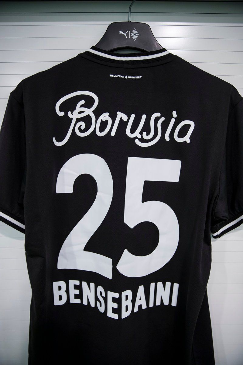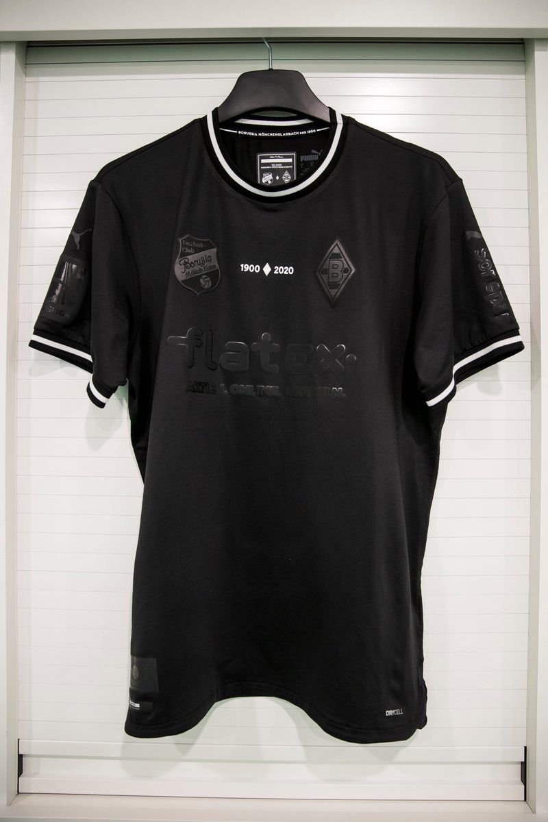 The shirt is total black and with two Borussia logos - also black - printed in the chest, and between the two, there is a tag with the club dates (1900-2020). On the edge of the sleeves there is a black and white trim as well as around the neck, and always on the sleeves all Bundesliga patches are imprinted in black. The shirt celebrates the basic color of the club, black, which together with white then defines the colors of Borussia. Another feature of the special kit is the italic write "Borussia" in the back of the shirt.