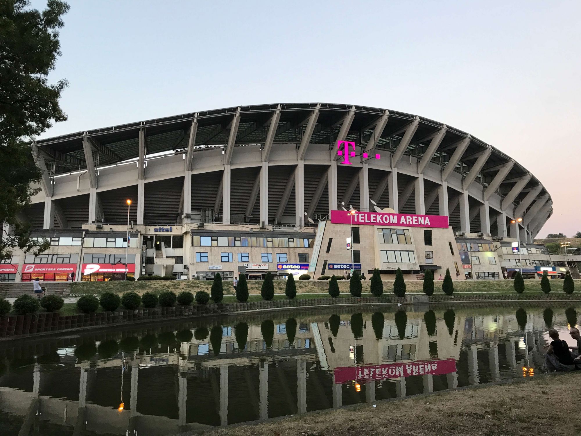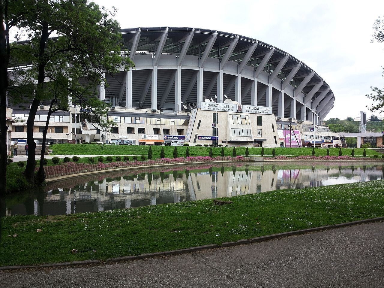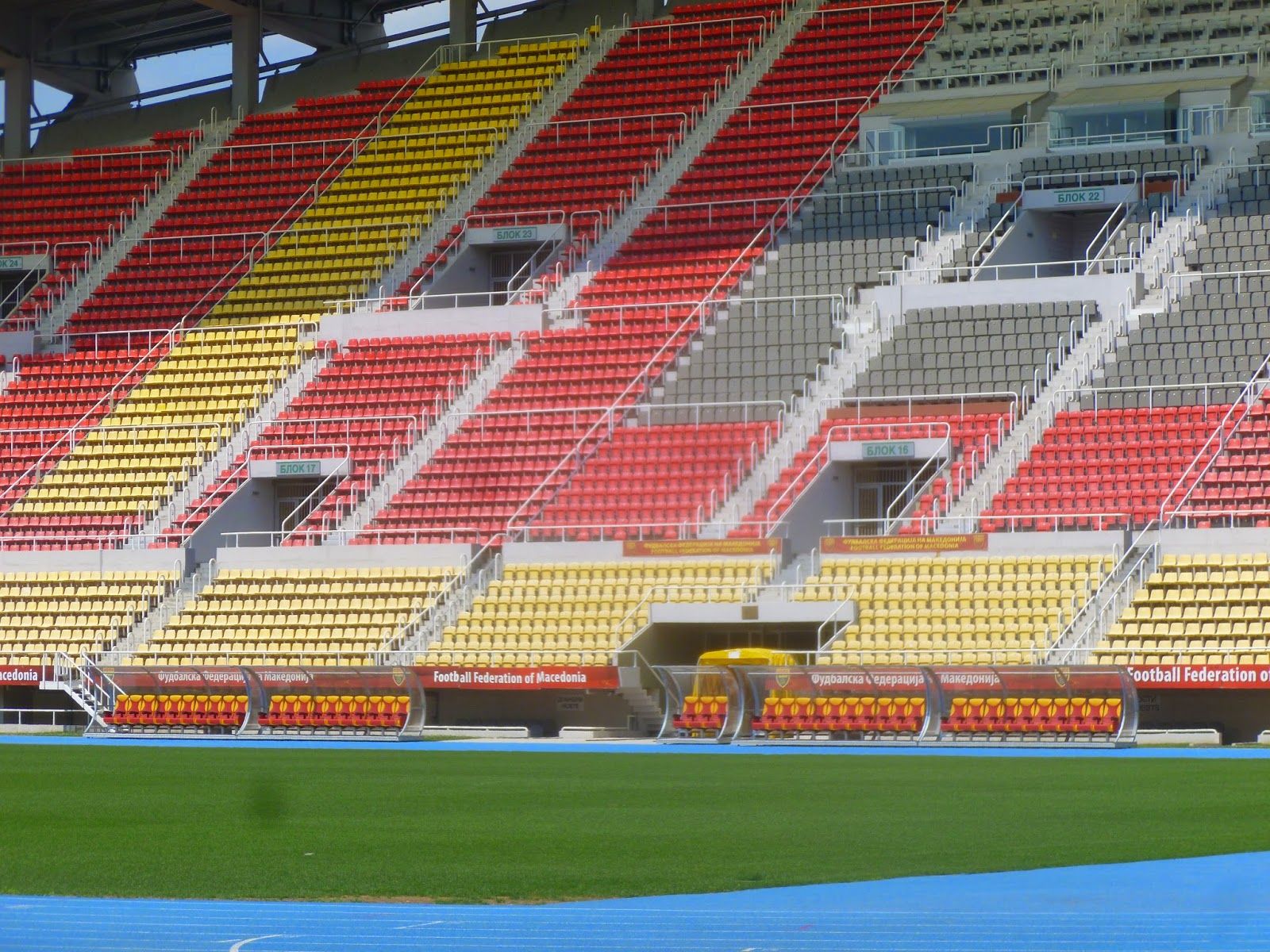 Named after Macedonian singer Toše Proeski, Skopje's stadium was renovated in 2009 as part of a major sequence of state works to reorganize the image of Macedonia (independent of Greece) and its internationalization. A fundamental feature is the grandstand of honor, which like other stadiums built with structuralist concepts stands on a surge of columns and steps. Initially, in addition to the grandstand, there was only a small ring around the stadium, while now two rings have been built that come back to the central stands. In addition, the skyline of the stands has a wave shape, which follows the large suspension arches. In 2017, it also hosted the European Super Cup final between Real Madrid and Manchester United and this led to a further improvement in the plant's services.
