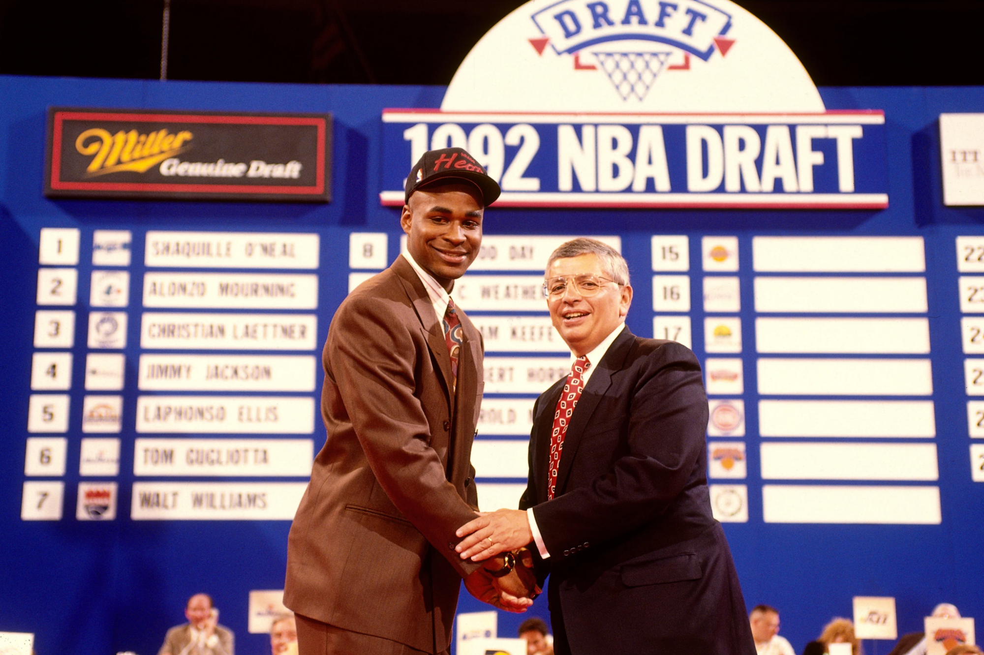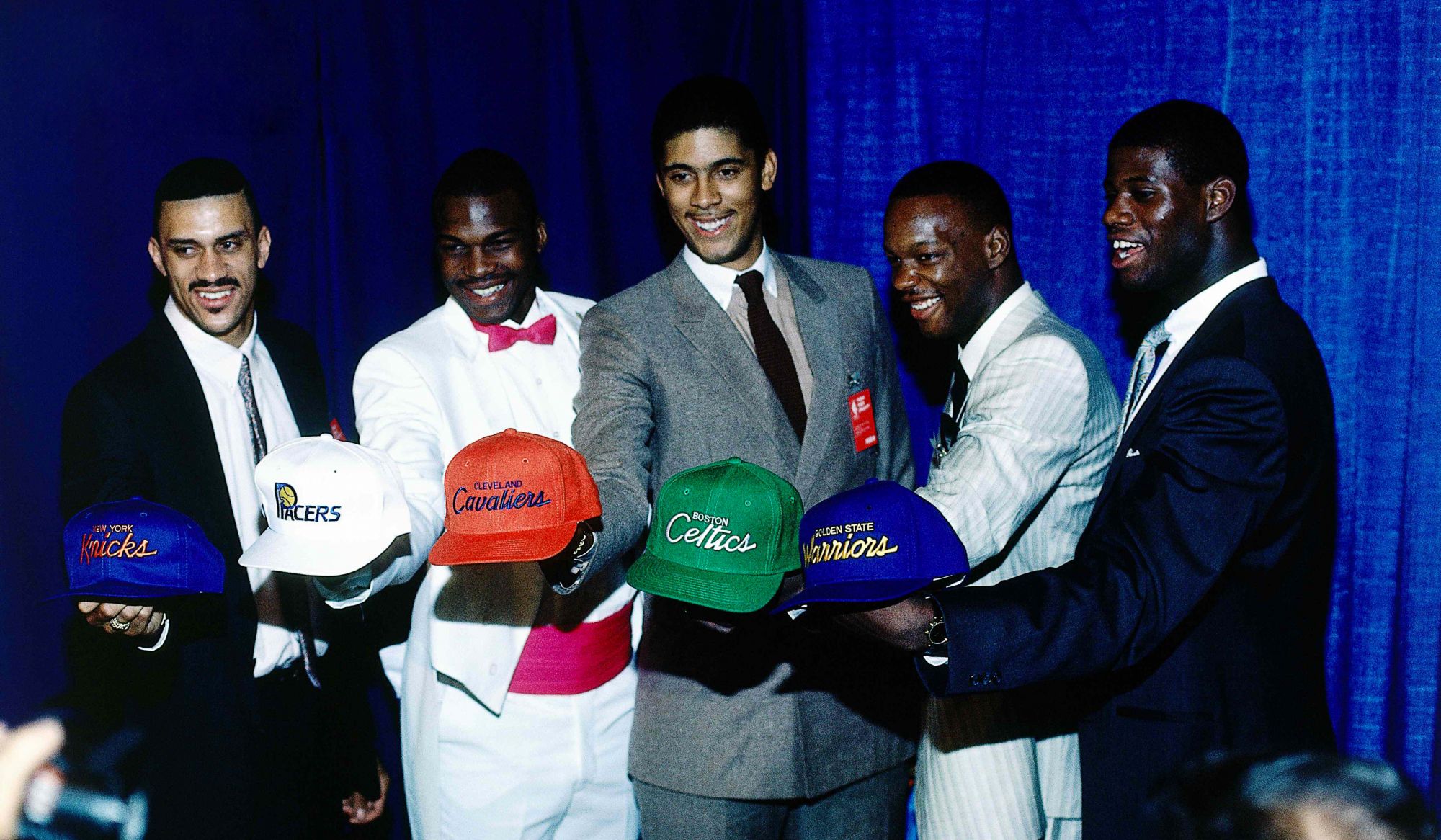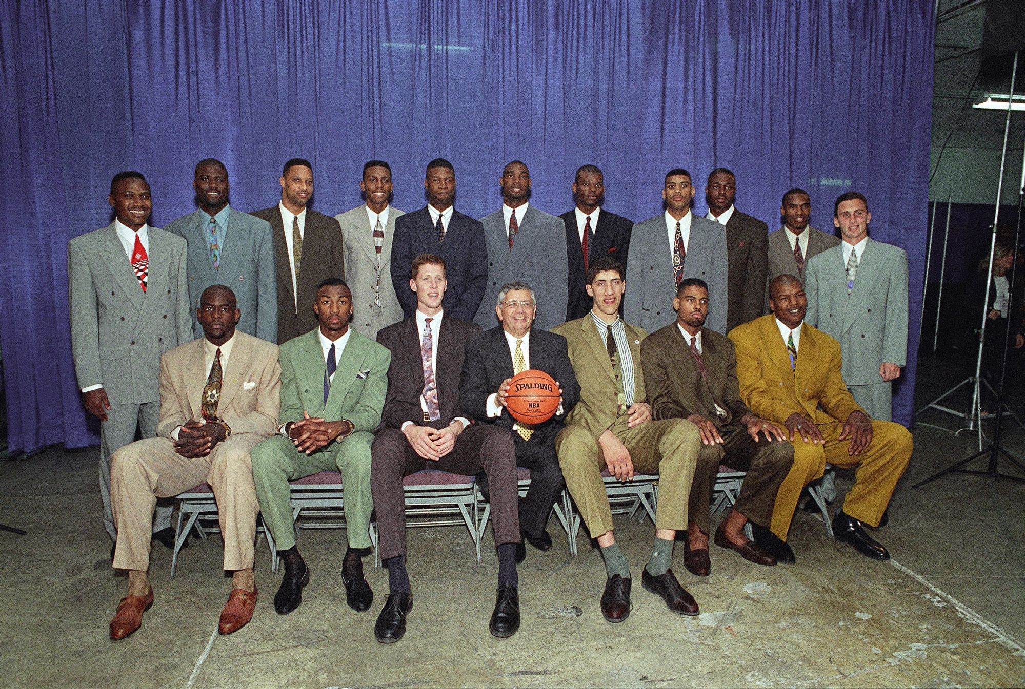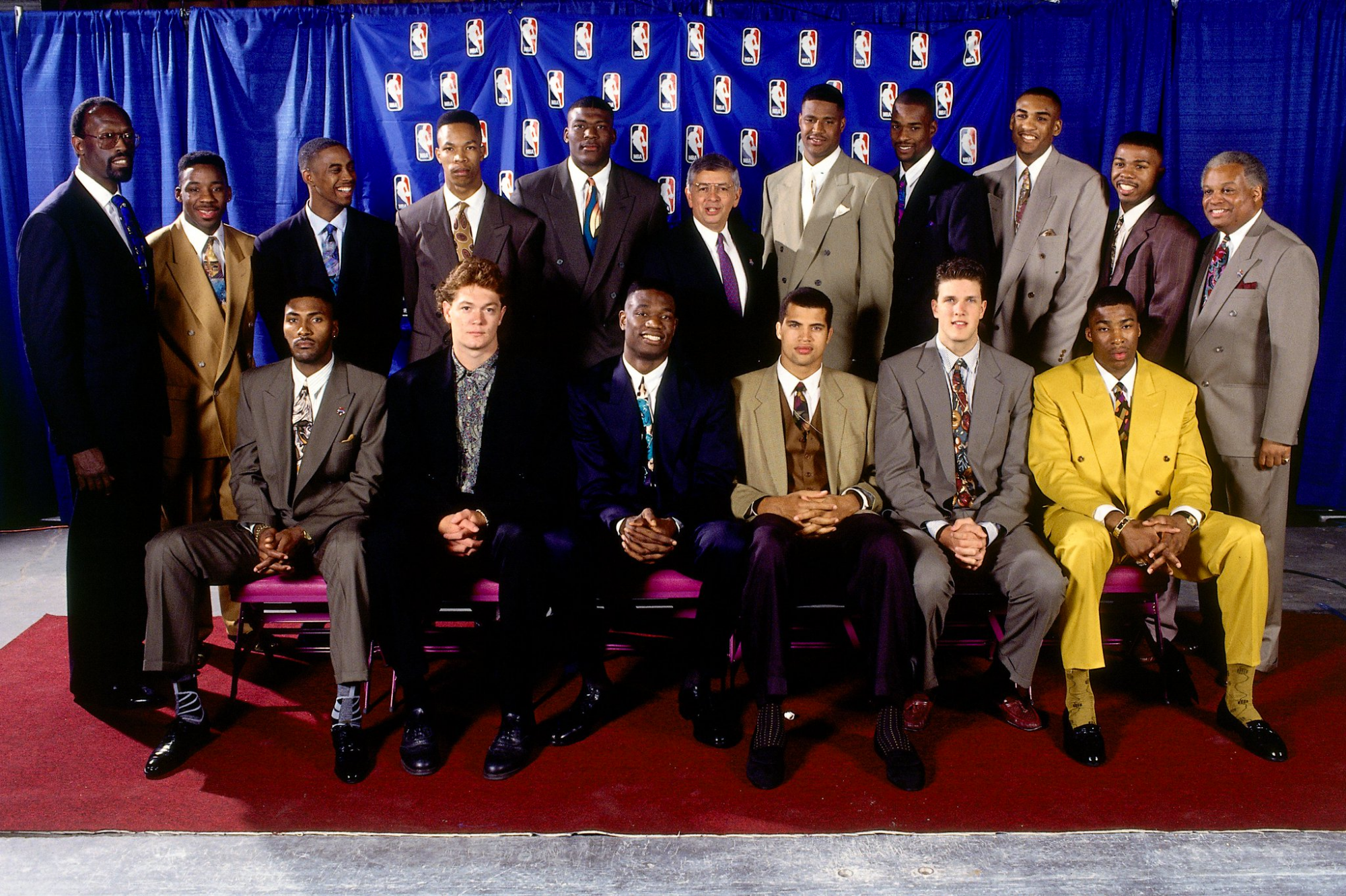 If the switch from soft colors to gaudy colors was not enough (with Jalen Rose who must like red), the ties complete a picture that in the 90s became extreme for the trends of the time. From Gary Payton to Kobe Bryant, passing through great thinkers and passers-by like Nash and Kidd, up to the aliens who answer to the name of Vince Carter and Kevin Garnett: everyone chooses impossible ties. A step above all, however, is Samaki Walker, choice of the Dallas Mavericks and as a new Texan player decides to show up with a bowler hat that would look better on the head of Christoph Waltz or Leonardo DiCaprio in Django Unchained.