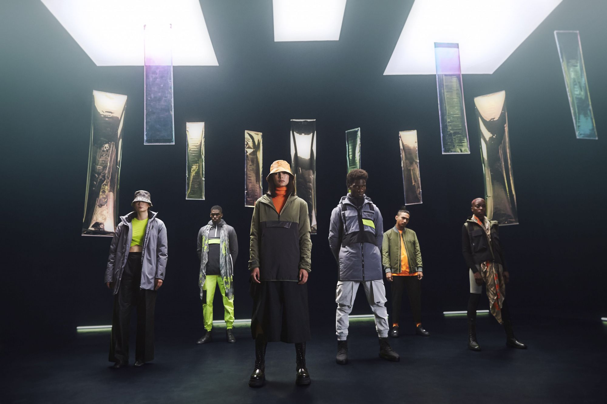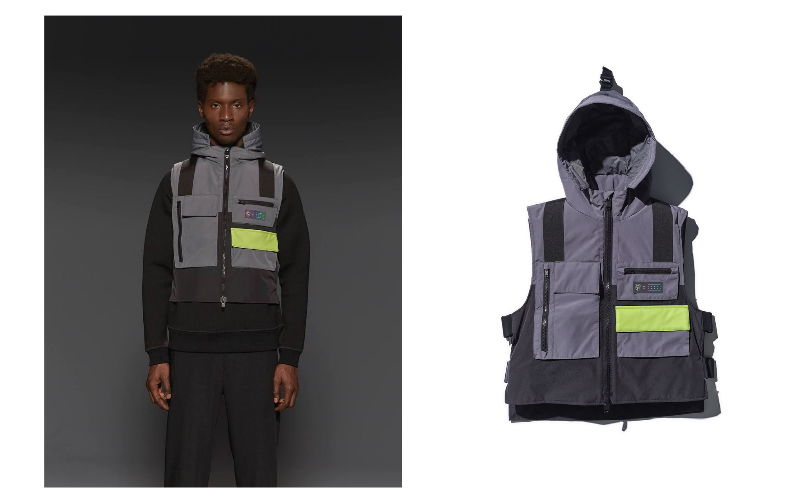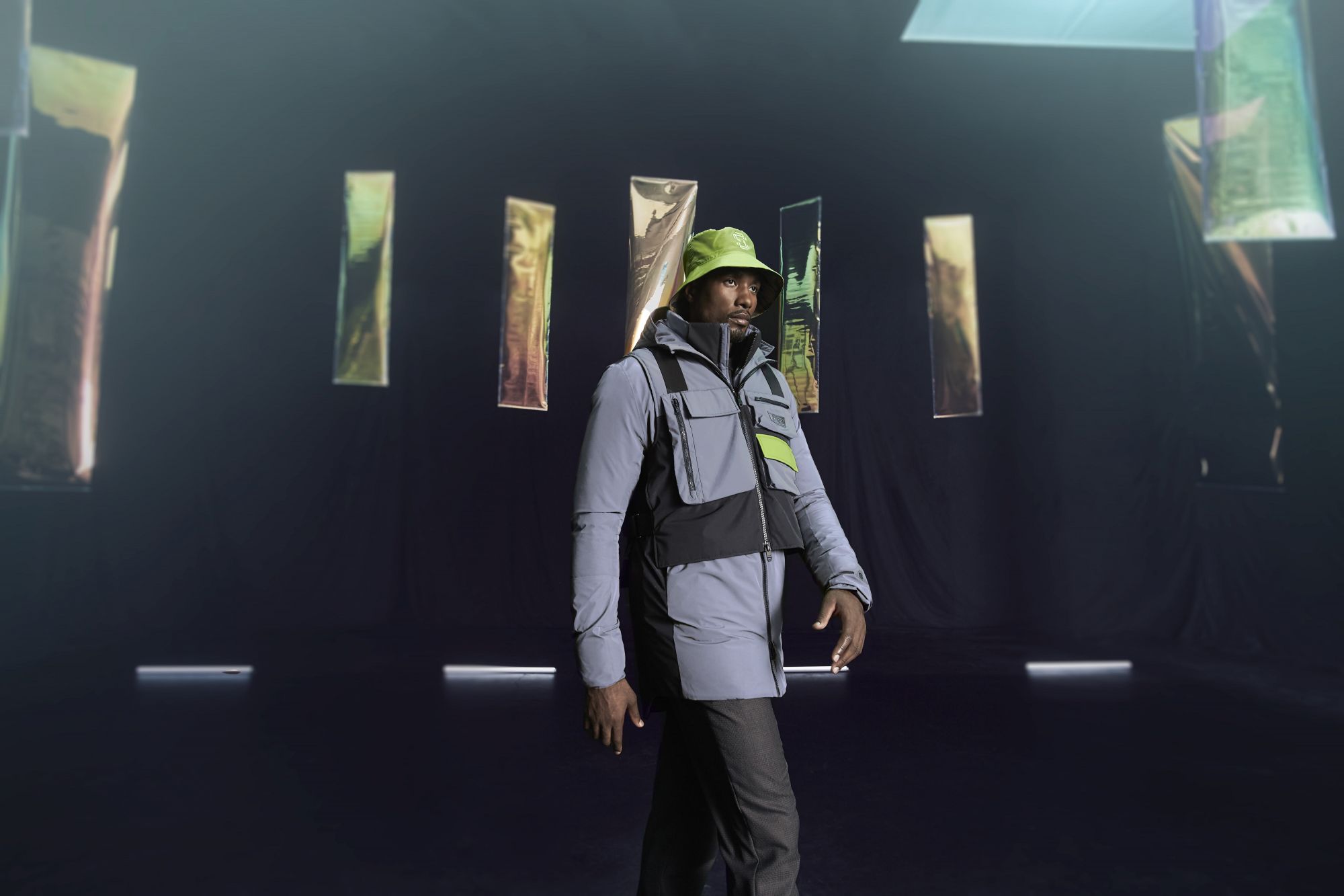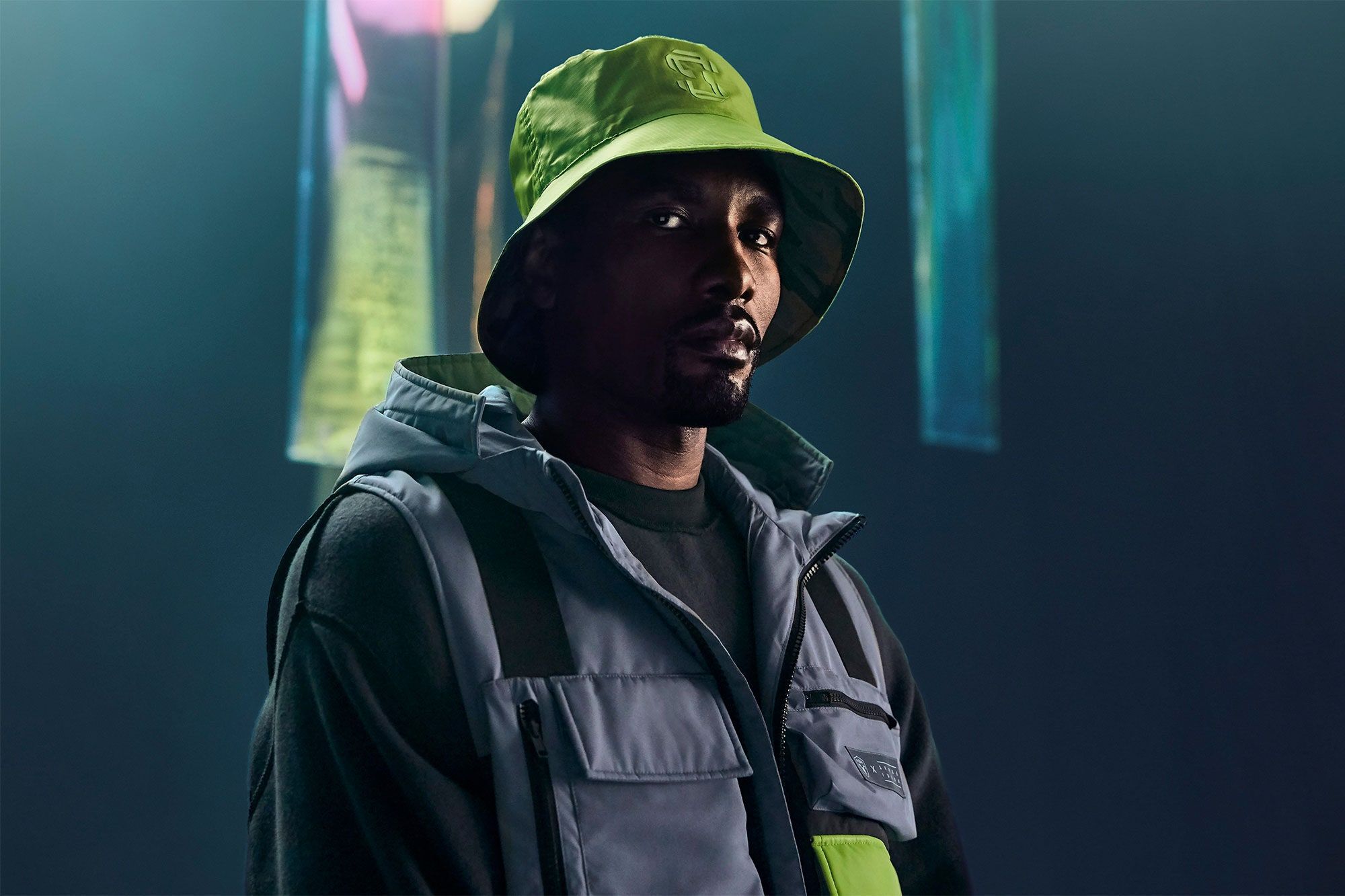 Among the items of the capsule, as mentioned, also scarves and buckets in ripstop nylon, with almost reflective details. The logos, in fact, are iridescent to allow greater visibility at night. On the scarf, on the other hand, the word "Mafuzzy" stands out, a catchphrase and new nickname of Ibaka after the DADJU hit.