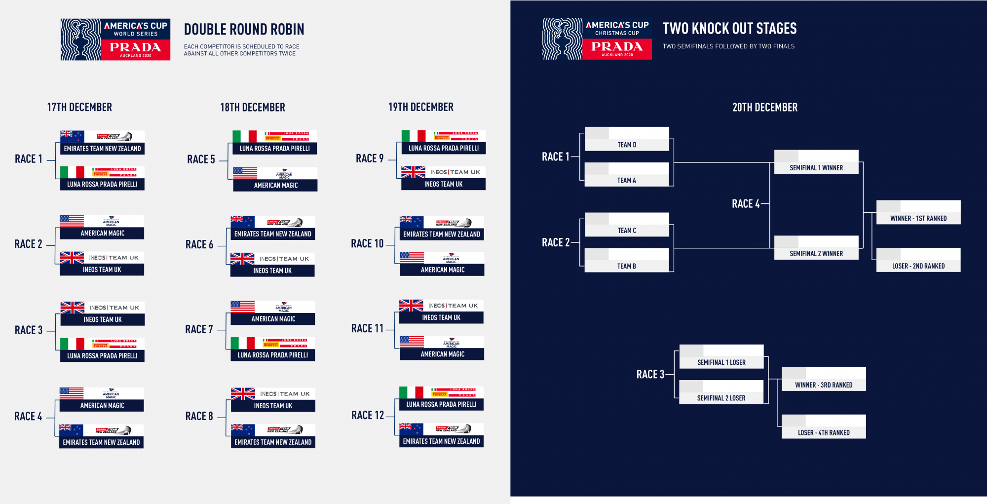 The competition is divided into two stages: one for the first three days - from 17 to 19, preliminary - and another for the last, the 20, when the tournament ends. The first match will be a few minutes after 15:00 between Emirates Team New Zealand and Luna Rossa Prada Pirelli Team, the second American Magic pairing against INEOS TEAM UK. For the first three days of the Prada Christmas Race in Auckland there will be four races a day so all four teams will face the others alternately (Round Robin), and therefore, all will compete twice a day. The second and final stage, that is, the fourth day (20 December), will have two knockout stages: the first stage consists of two one-on-one, whose winners will go to the final, while the losers will compete for third and fourth place. The pairing of the Prada Christmas Cup semi-finals will be decided on the basis of the results of the first tranche of matches.