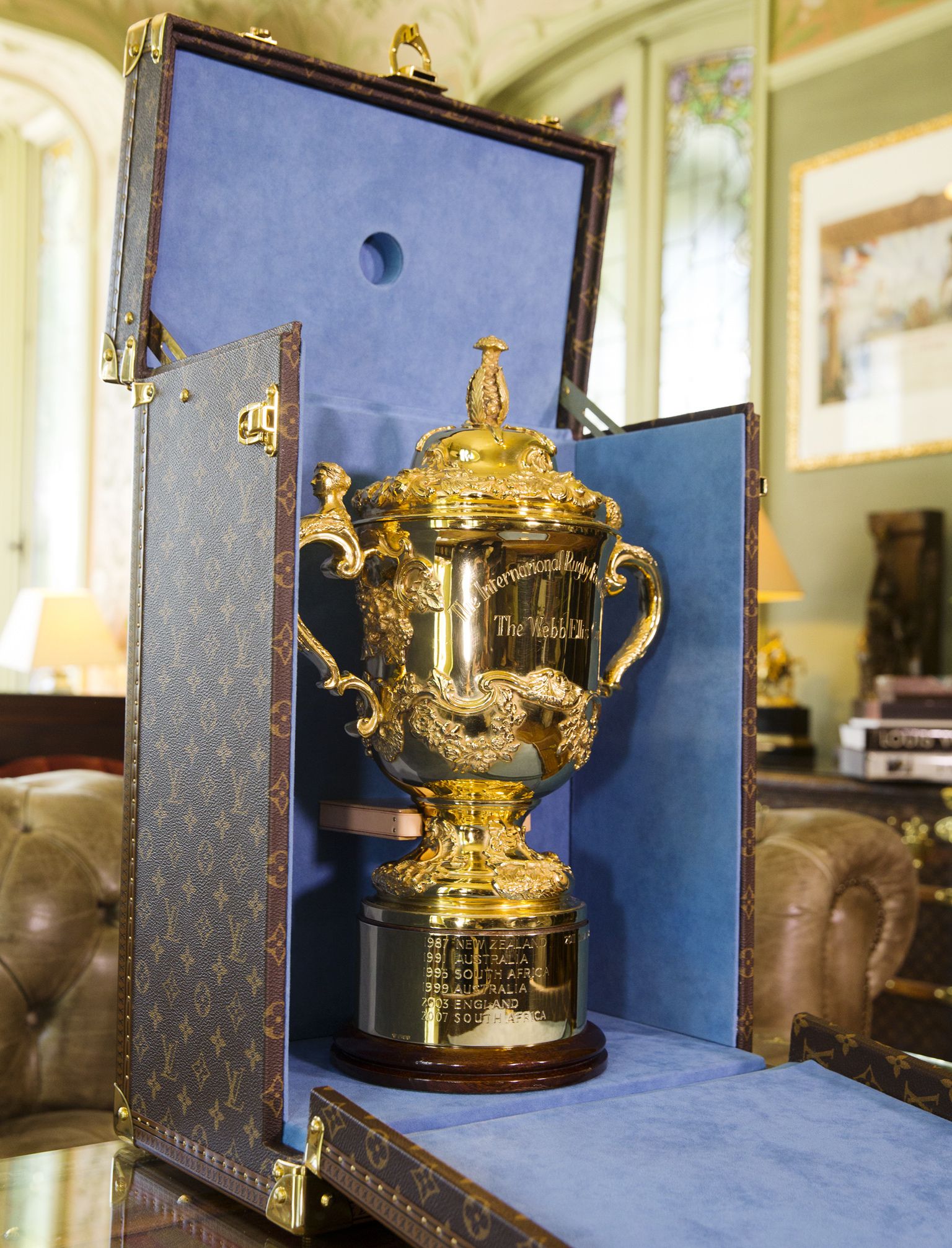 After football, basketball, tennis, and sailing, it's time for rugby, the noble sport par excellence. In 2015 Louis Vuitton was commissioned to build a special trophy case for the Webb Ellis Cup, the trophy that is awarded to the team that wins the rugby world cup. Held on October 31, 2015 in Twickenham, in front of more than 80.000 people, New Zealand and Australia fought to take home the most important prize. The case opens to the front and upwards, so that the trophy can be easily removed.