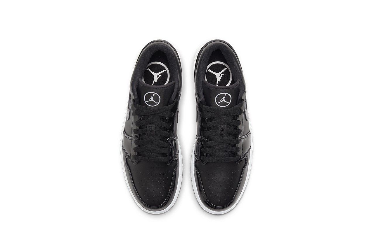 The shoe has a dark shade, a shape similar to total black if it were not for the white sole. Black, however, has different shades depending on the sections of the sneakers: the base layer is rougher and in matte black, while the overlapping finishes in glossy black. The Swoosh is also in glossy black, and the only white parts of the sneakers are the sole, the seams on the Nike symbol, the Jumpman symbol on the tongue and the contours of the Air Jordan logo behind, on the heel. Swoosh, in fact, also has characteristic traits. In fact, nike's symbol is embroidered with dots along the entire surface with diagonal patterns.