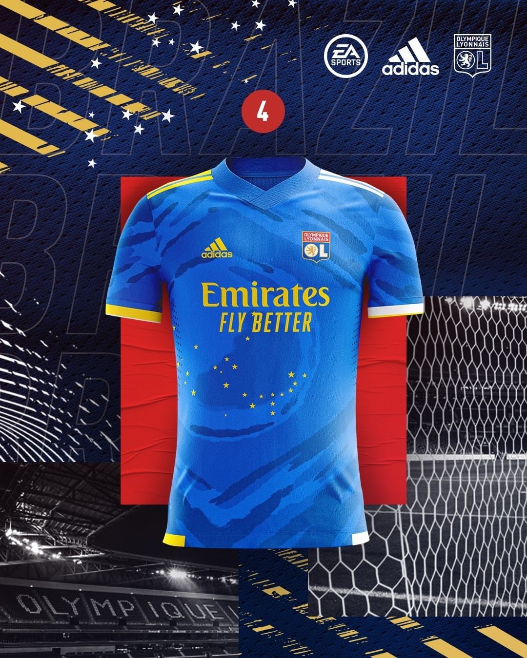 Juninho Pernambucano, Cris, Rafael, Claudio Cacapa and Fred, as well as the modern Paquetà and Thiago Mendes. Lyon is a team with a great relationship with Brazilian players, and in fact, the reason for the new kit is precisely the club's bond with Brazil. Each of the four jerseys contains a reference to Brazilian players and territories, but with the basic colors that re-propose some of the historical models used by Olympique Lyon in recent years. The optionable uniforms were the number 1, called 'Union', inspired by a model used in the nineties (gold background with a blue and red stripe in the center: in this case, the silhouette of Brazil was added), the number 2, 'Rio', dedicated to the Carnival of Rio De Janeiro (blue base, with a patterned template in specks between black and red) , number 3, 'Pernambuco', like the 'Home' model of the '89-90 season (with the fusion between the diamonds of the Brazilian flag and the lion, symbol of the French club); finally, the number 4, 'Etendard', completely blue like many models (also seen in recent years) of Lyon, in which the reference is to the Brazilian flag.