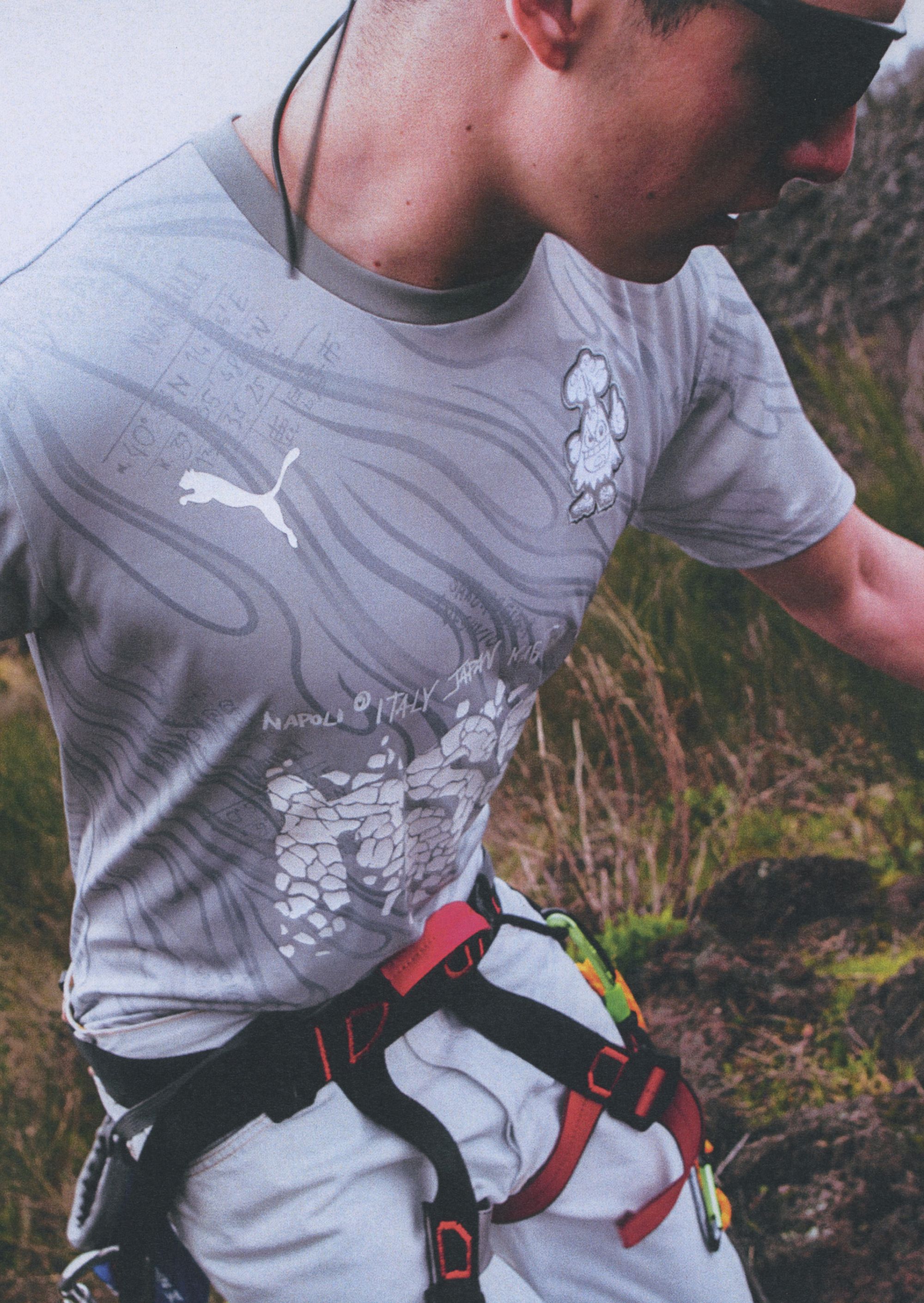 The slopes of the two "twins" are the editorial set - inspired by the gorpcore trend - shot in parallel in Japan and Italy, the first step to build a positive narrative that starts from Naples and reaches all over the world. The shirt - available on the nss store - is in slick gray and is populated by references to the aesthetics of Japanese football jerseys. The all-over graphic that symbolizes the fire and magma of the volcanoes is inspired by the pattern of the PUMA jerseys of the Japanese national team of the 90s. The emblem that recalls the nature of the two mountains and the nss sports logo that gives the impression of shattering as the rocks after an explosion. But it is the details that make the jersey unique: along the entire jersey there is a pattern with the names and coordinates of the volcanoes, in order to build an ideal geographical link between the two places.