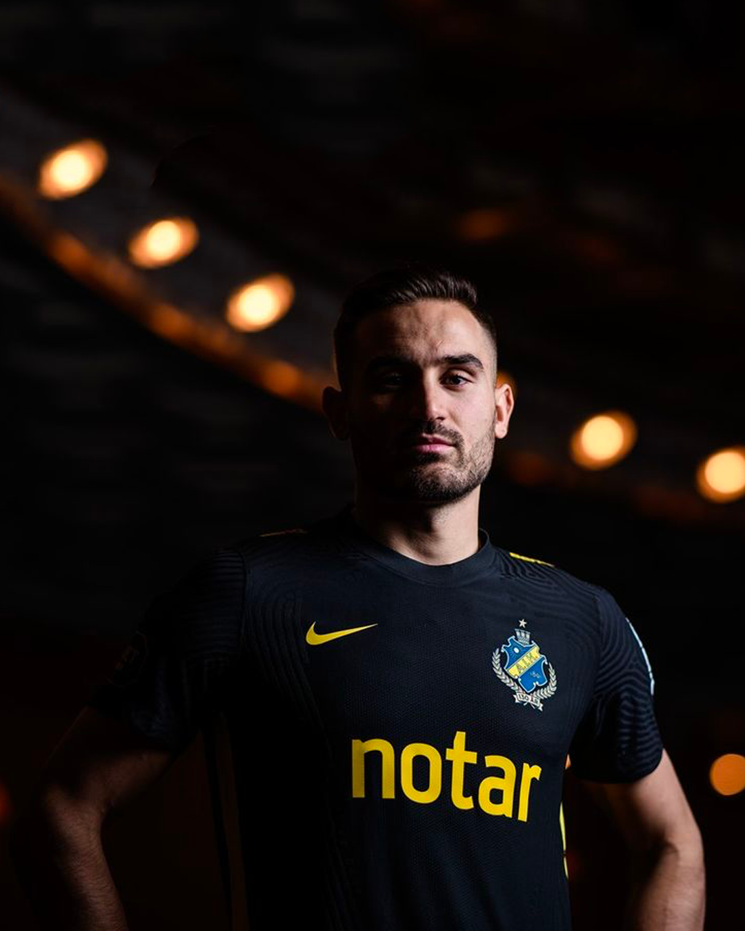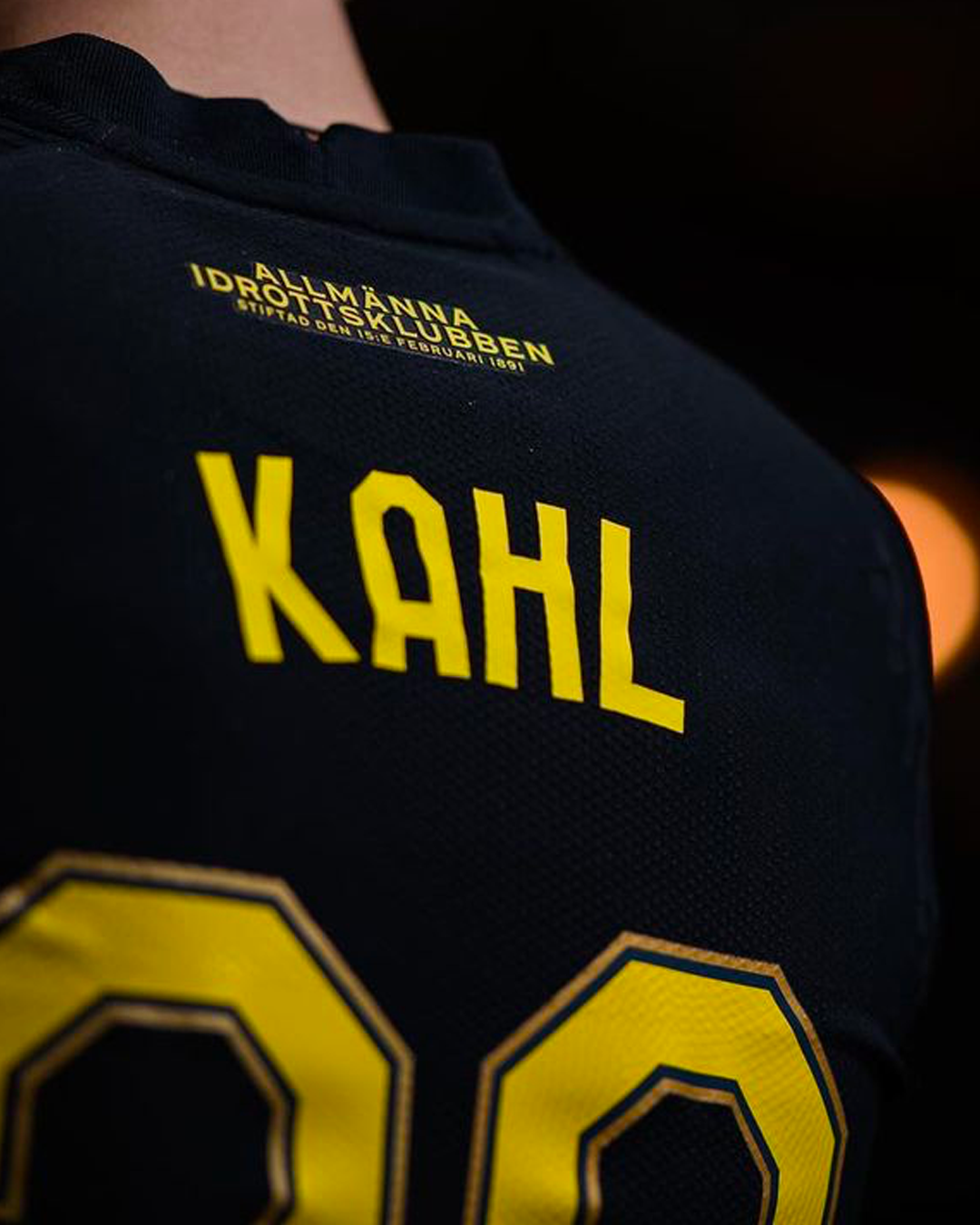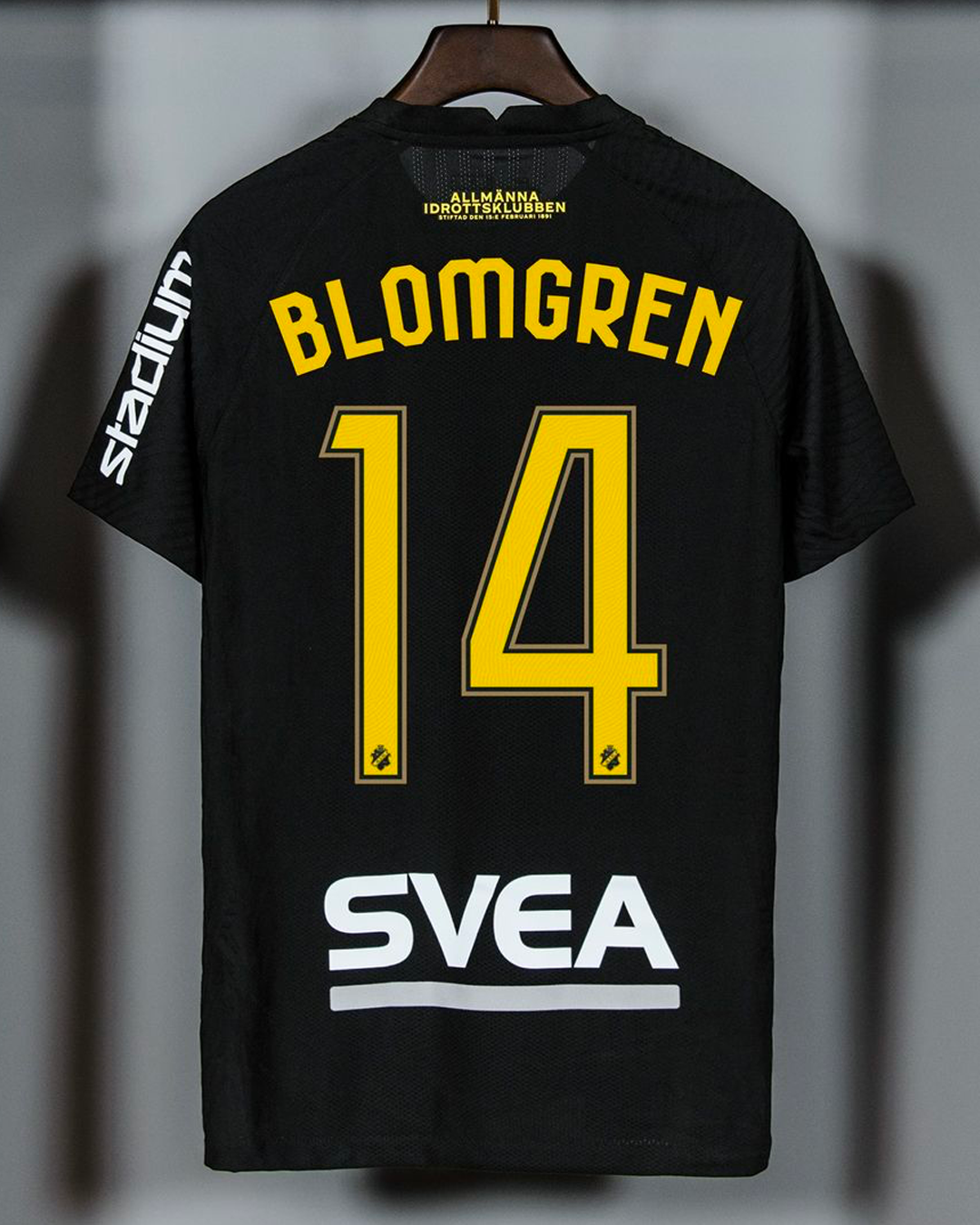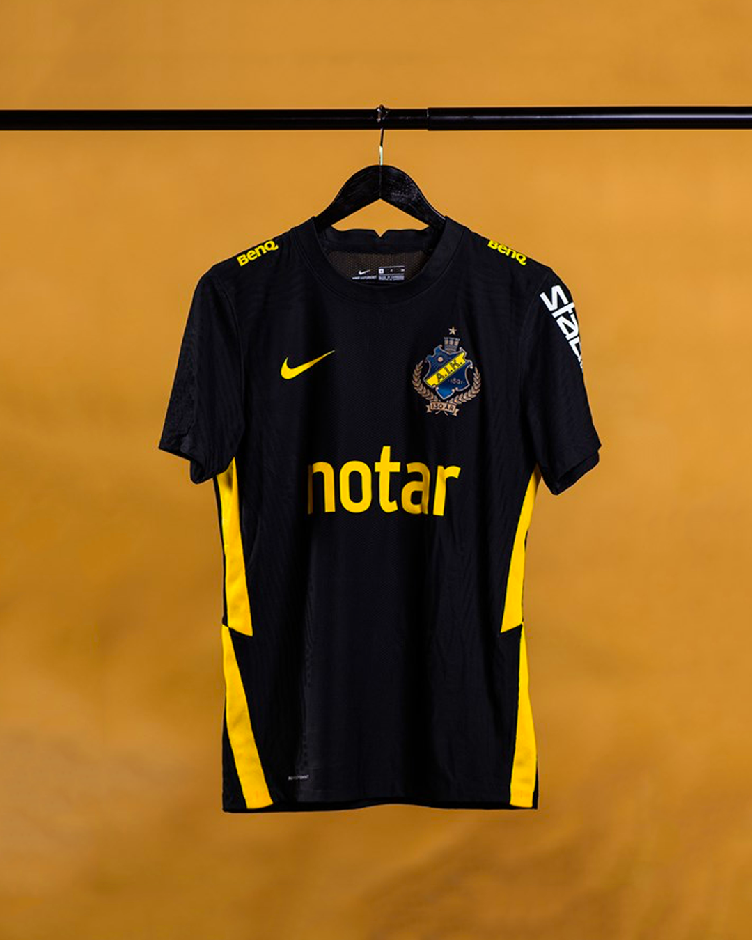 The jersey template is the classic Nike Vaporknit 3, introduced for the 2020-21 season and already used by club teams such as PSG, Tottenham and Atletico Madrid or by national teams such as Portugal, Holland, USA and England. As always, black is the dominant color while the details are in yellow. The front of the jersey features the club crest adapted for the special anniversary on the top left and the Swoosh on the top right, while inside the collar is written "Allmänna Idrottsklubben - stiftad den 15: e februari 1891". The kit is completed by white shorts and socks with black and yellow stripes.