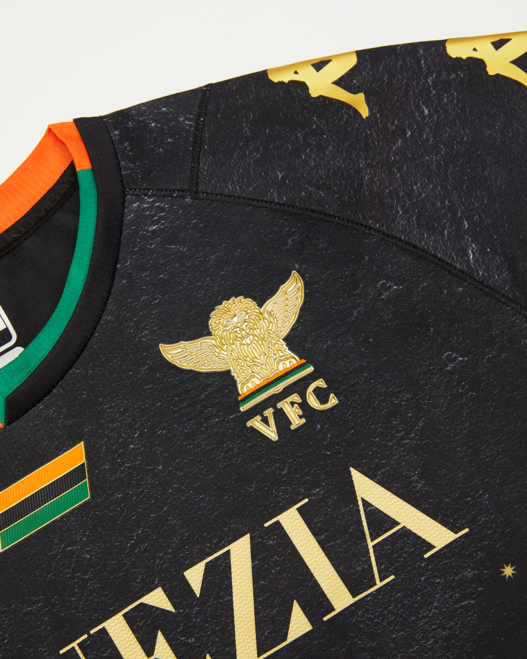 There is also space for the club's social colours, green and orange together with the black of the jersey emerge on a flag in the centre of the chest, on the collar and on the sleeves. The jersey designed by Kappa is full of details that embellish and sanction a unique bond between the club and the most iconic city in the world, with all the gold-coloured logos echoing the stars and the word Venezia. In difference to last year, the horizontal stripes are gone, replaced by a texture reminiscent of the lagoon, the design and development was handled by the New York-based creative agency, Fly Nowhere, in collaboration with Kappa.
