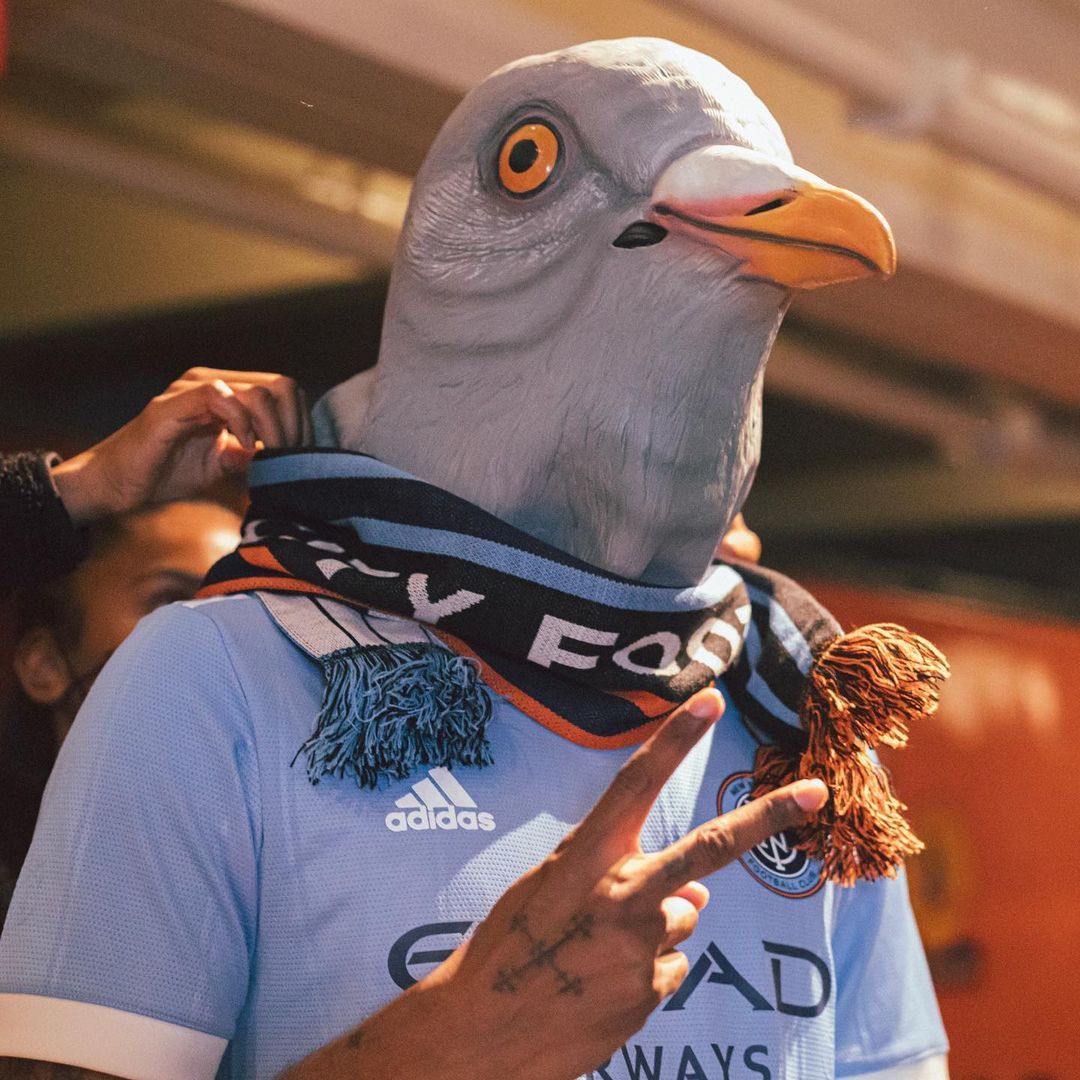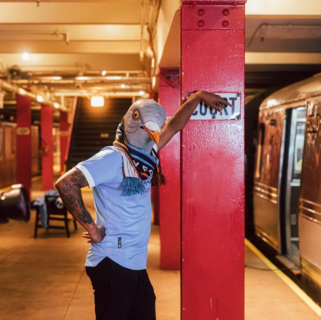 In addition to midfielder Jesús Medina, the campaign photos also feature New York City's iconic fan, Omari, who has been wearing a pigeon mask every time his team plays at Yankee Stadium since the first official game. The collaboration between Omari and Staple Pigeon came about by chance, from an obviously ironic tweet in which the fan applied for a position as a model. Said and done, the fan was immediately contacted and included in the launch campaign, with his now iconic mask.