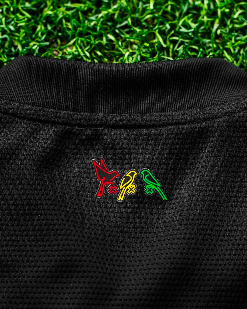 The shirt is in total black, with the only colored details given by the sponsor's red and the crest on the front and by the three stripes in green, yellow and red. The "Three Little Birds" are present on the back of the shirt, at the height of the collar, but the kit is contaminated by details and by the repetition of the three colors as on the socks, which combine those chromatic shades with the three Xs of Ajax. The launch also includes an adidas Samba model with a design that matches the colors of the jersey.