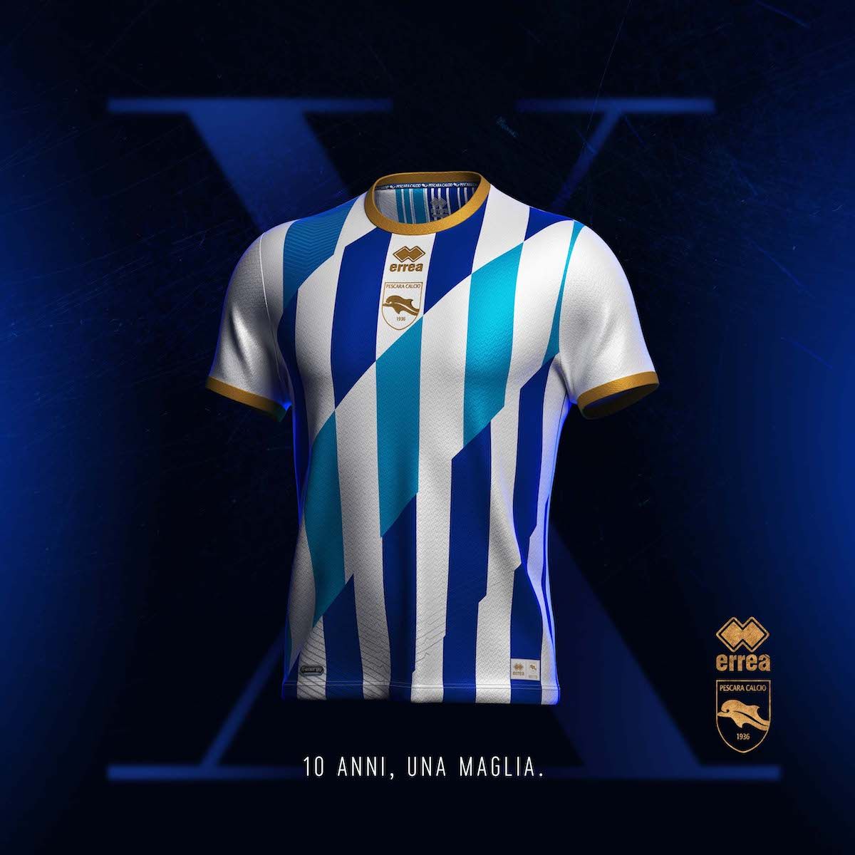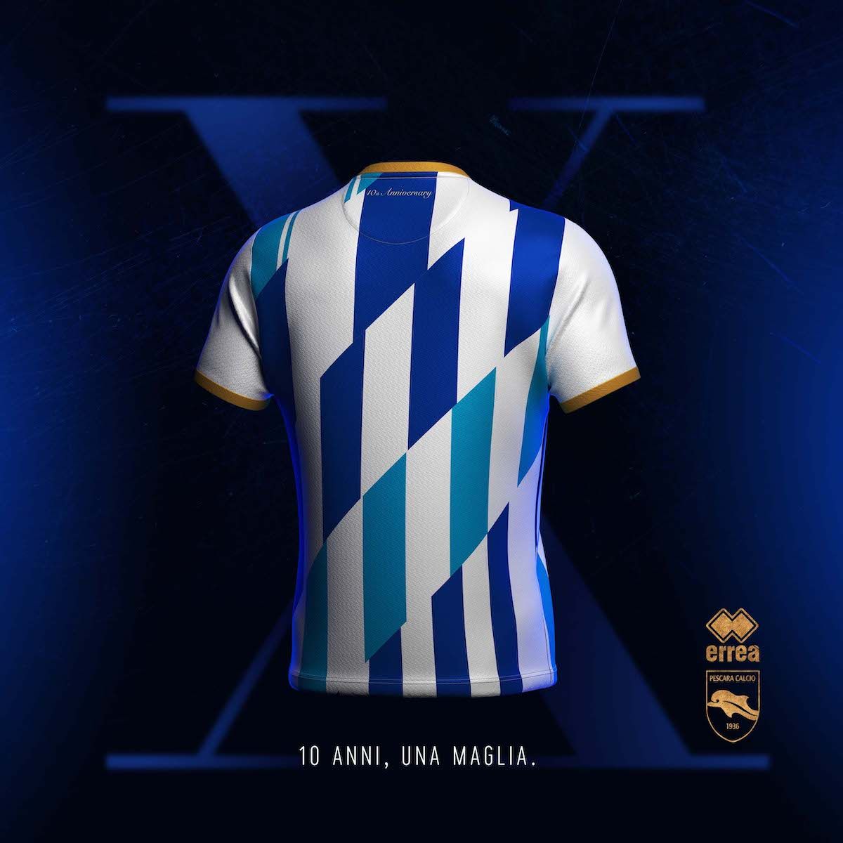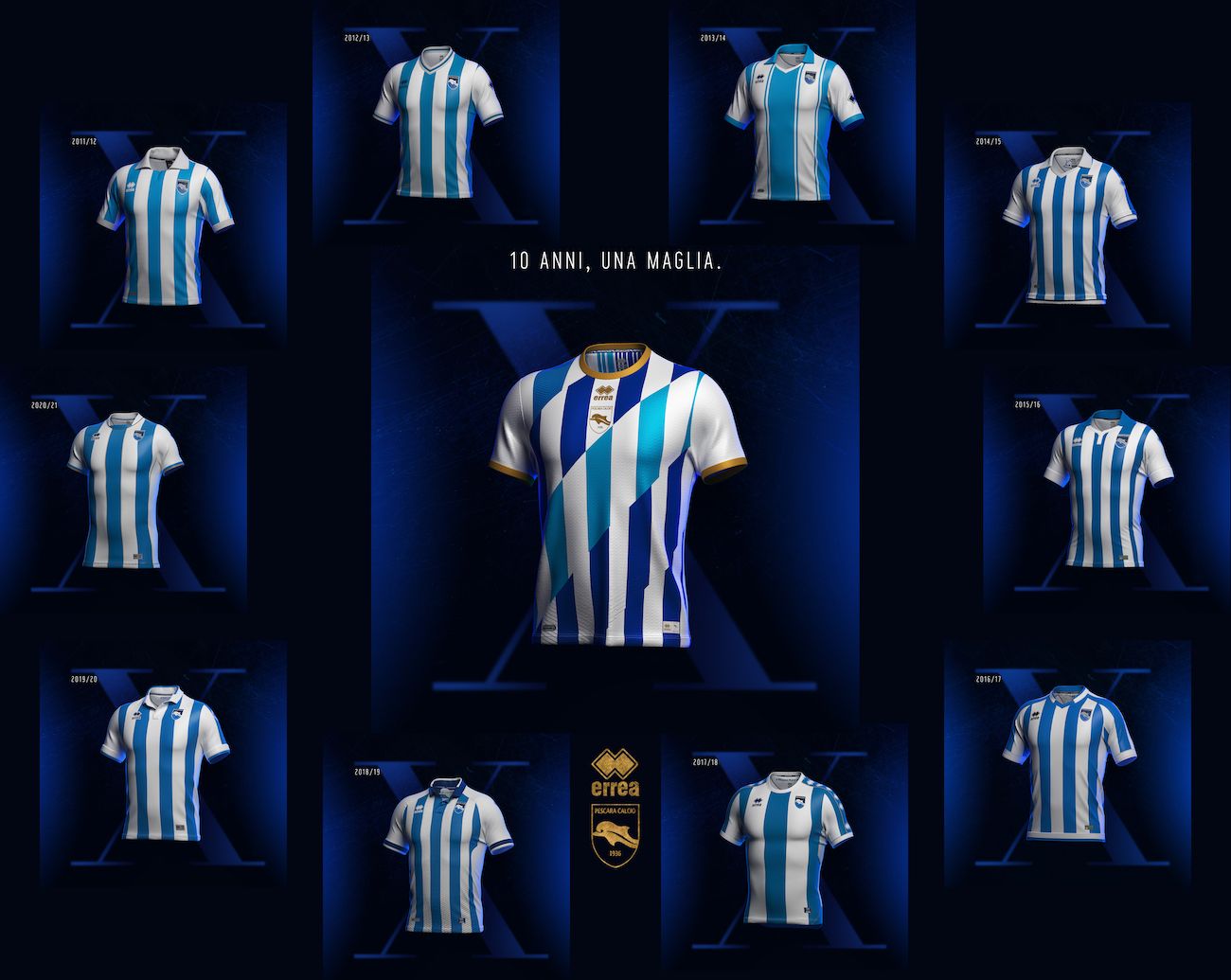 Pescara and Erreà mash-up jersey to celebrate 10 years together All the blue stripes made in the last ten years in one jersey