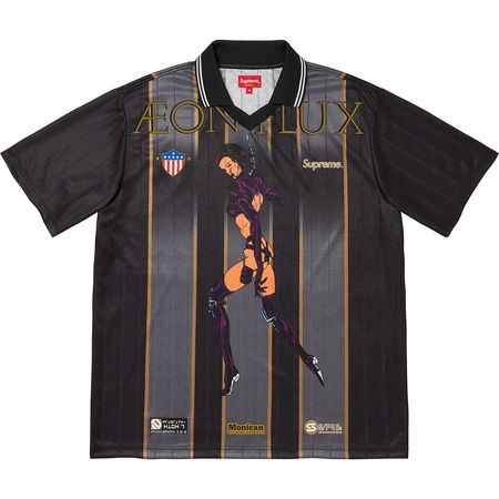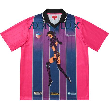 Supreme instead, not new to include soccer jerseys in its catalogs, has launched in the midst of its collaboration with the animated series Æon Flux a jersey that stands out for the classic wide cut that was very popular in the '90s, including the collar with two-tone border and logos on the chest. On one side the classic Supreme one and on the other a crest reminiscent of the White House one's that was already used on the last year's Arabic Jersey. Also in this case the jersey was made in two versions, a black one with golden stripes and one with the same pink, blue and purple tones as the Palace one.