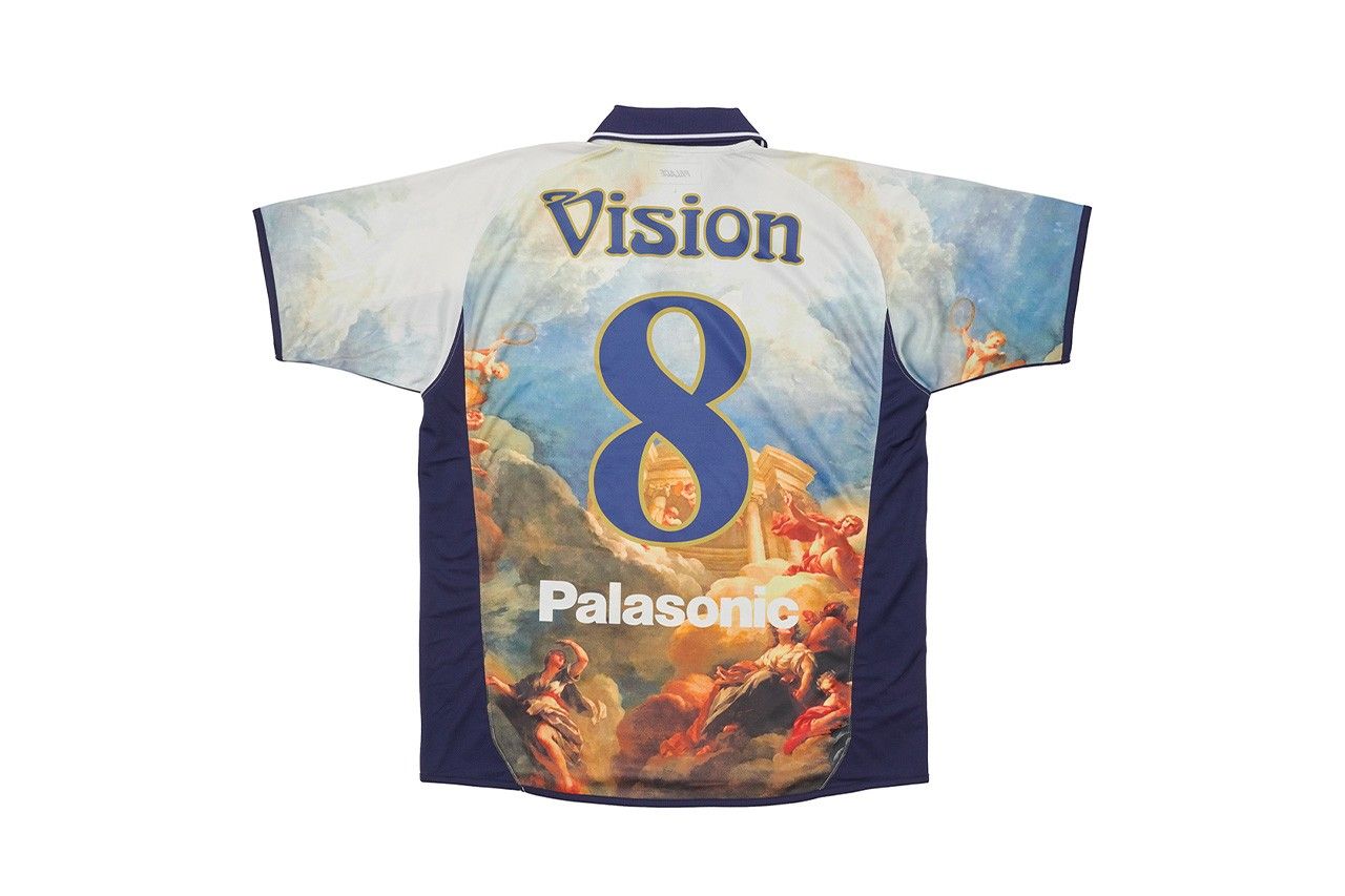 Palace has proposed a jersey characterized by the Persailles design, already used over the years in other items of various collections, which recovers in a street key a fresco of the Royal Palace of Versailles and continues the game of references, typical of the English brand, with the logo translated into French and two crests, the Tri-Ferg and the transalpine tricolor. On the back, the number eight surmounted by the word "Vision" and the now iconic Palasonic logo. Two versions have been created, one in blue and one in pink with a particular vaporwave taste.