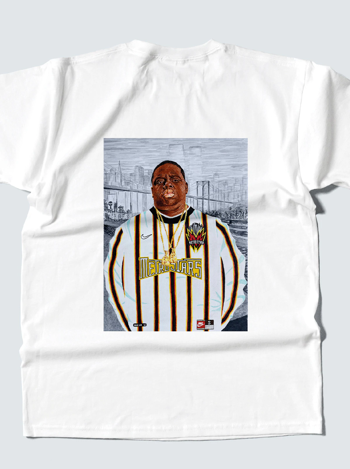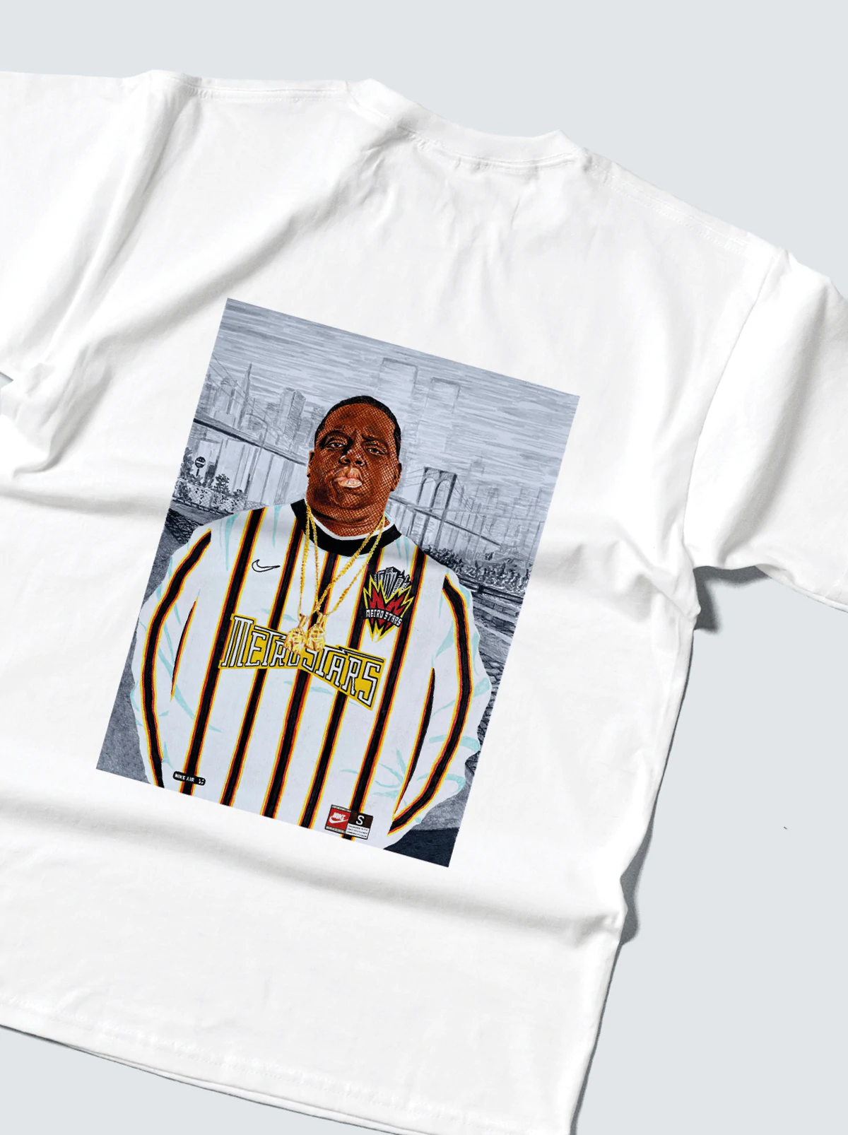 The team that has now been purchased by Red Bull had the merit in the 90s to bring soccer to New York, finding its way between basketball and baseball. And the best business card of the Metrostars were the game jerseys, which were produced until 2005 by Nike, and that Cult Kits with its new tee wants to pay homage. Along with the historical jerseys of the local team, here is used the white away jersey of 1998 with a harmonious use of orange that in fact Cult Kits has chosen the face of another legend of the Big Apple, the Brooklyn rapper better known as Christopher George Latore Wallace.