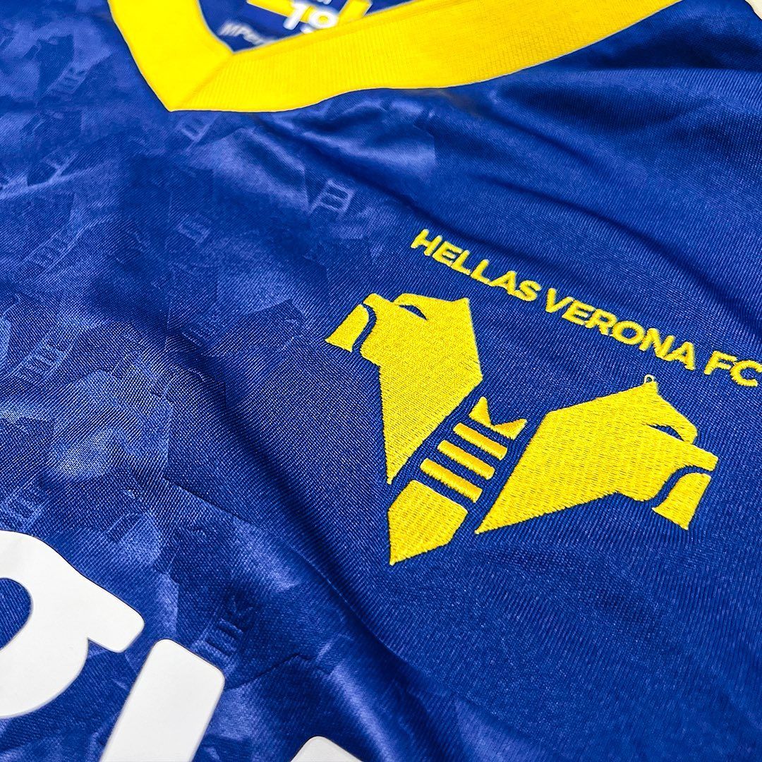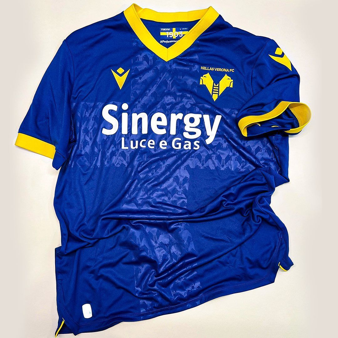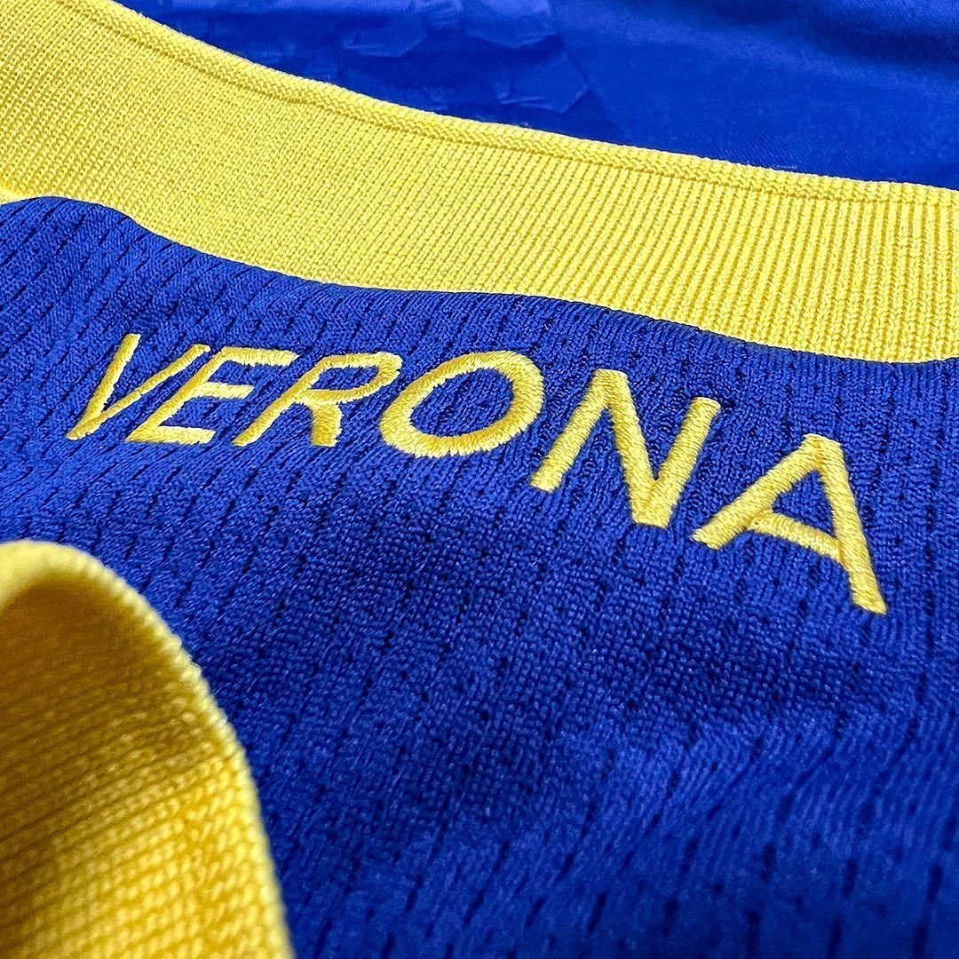 This morning Macron and Hellas Verona officially presented the new home shirt for the season created to underline the link with the city. Compared to last year there are few changes, the jersey is still dominated by Verona blue with a V-neck in knit and bordered in Verona yellow, but the biggest novelty of the kit is represented by the large cross that dominates the entire front of the jersey and that recalls the city banner of the city of Verona. On this jersey the cross is represented by the two mighty mastiffs that already make up the club's logo, here proposed in embossed graphics, tone on tone and repeated. The backneck is customised with the club's colours and its year of foundation, 1903, whose 120th anniversary will be celebrated during the new football season. On the backneck is embroidered, again in yellow, the word VERONA.