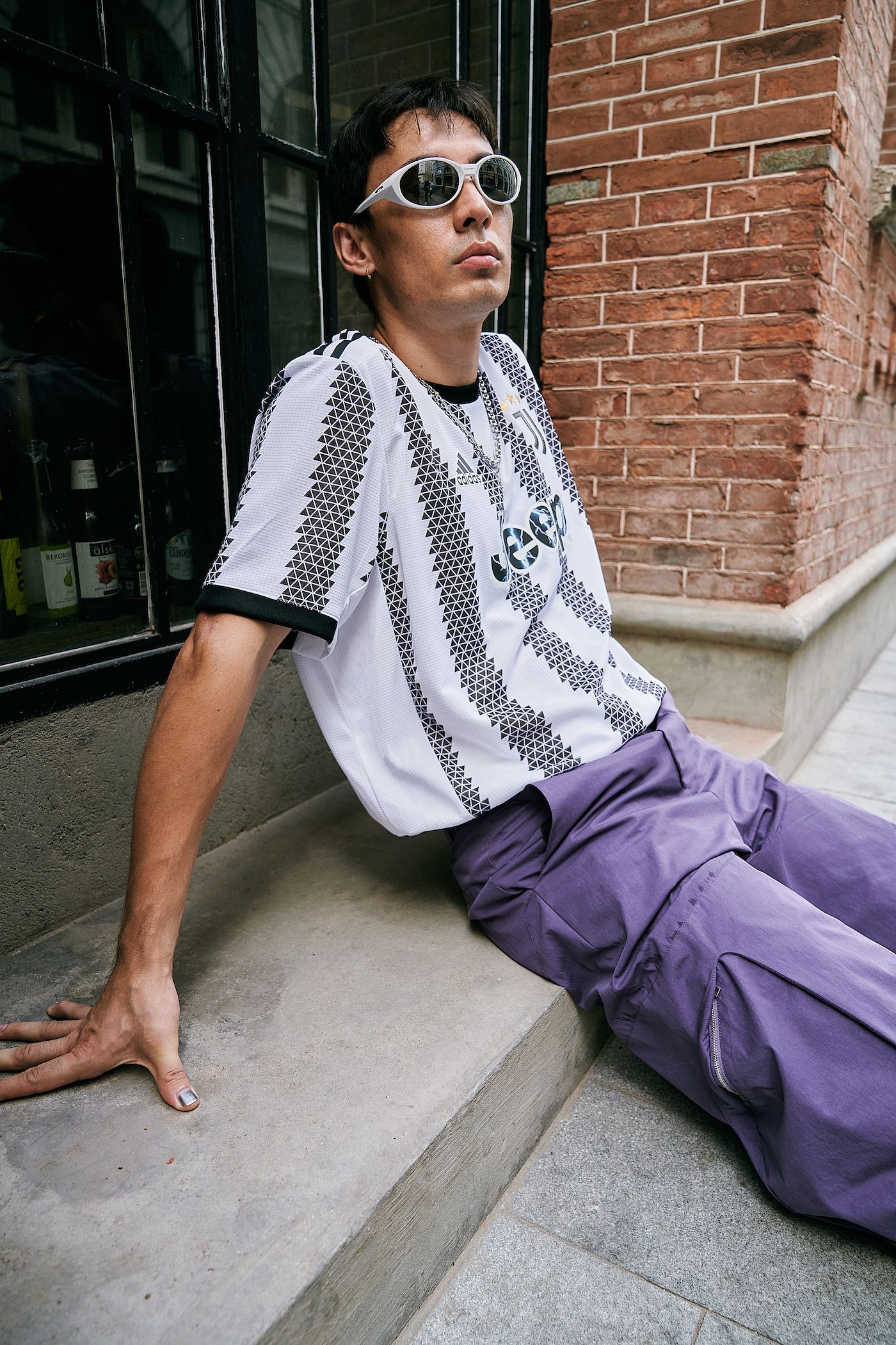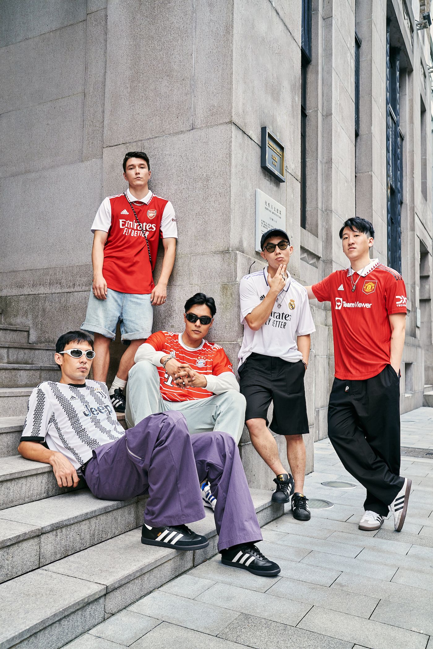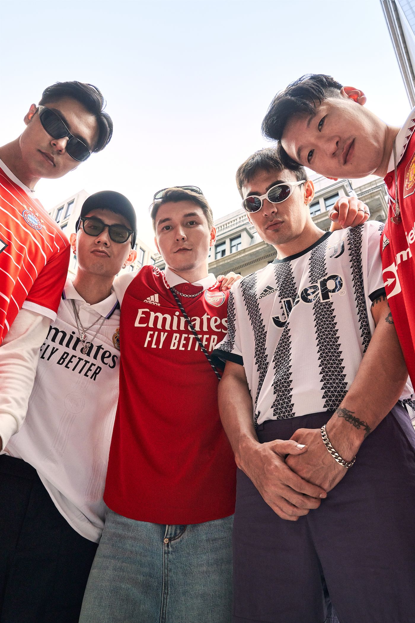 Football jerseys are undergoing a profound evolution, leaving the field of play to become an all-round lifestyle item thanks to two very strong trends. The first is the Bloke Core, defined as such on TikTok by @brandonlhuntly and already cleared through customs for years in stadiums all over the world, where the football jersey is combined with boot cut jeans and low effort trainers for an only apparently casual effect. It is a trend that ANAR FC, a Chinese collective and an open and inclusive team with players from Shanghai, Xinjiang, Beijing, Hong Kong, Taiwan, Paris and London, wanted to decline in its own way, to coincide with the start of the major European championships. The entire shoot was made with home and away jerseys from the 22/23 season designed by adidas for Arsenal, Manchester United, Bayern, Real Madrid and Juventus. 15 different jerseys testifying to the extent to which football has definitively moved out of its sporting bubble and into other markets.