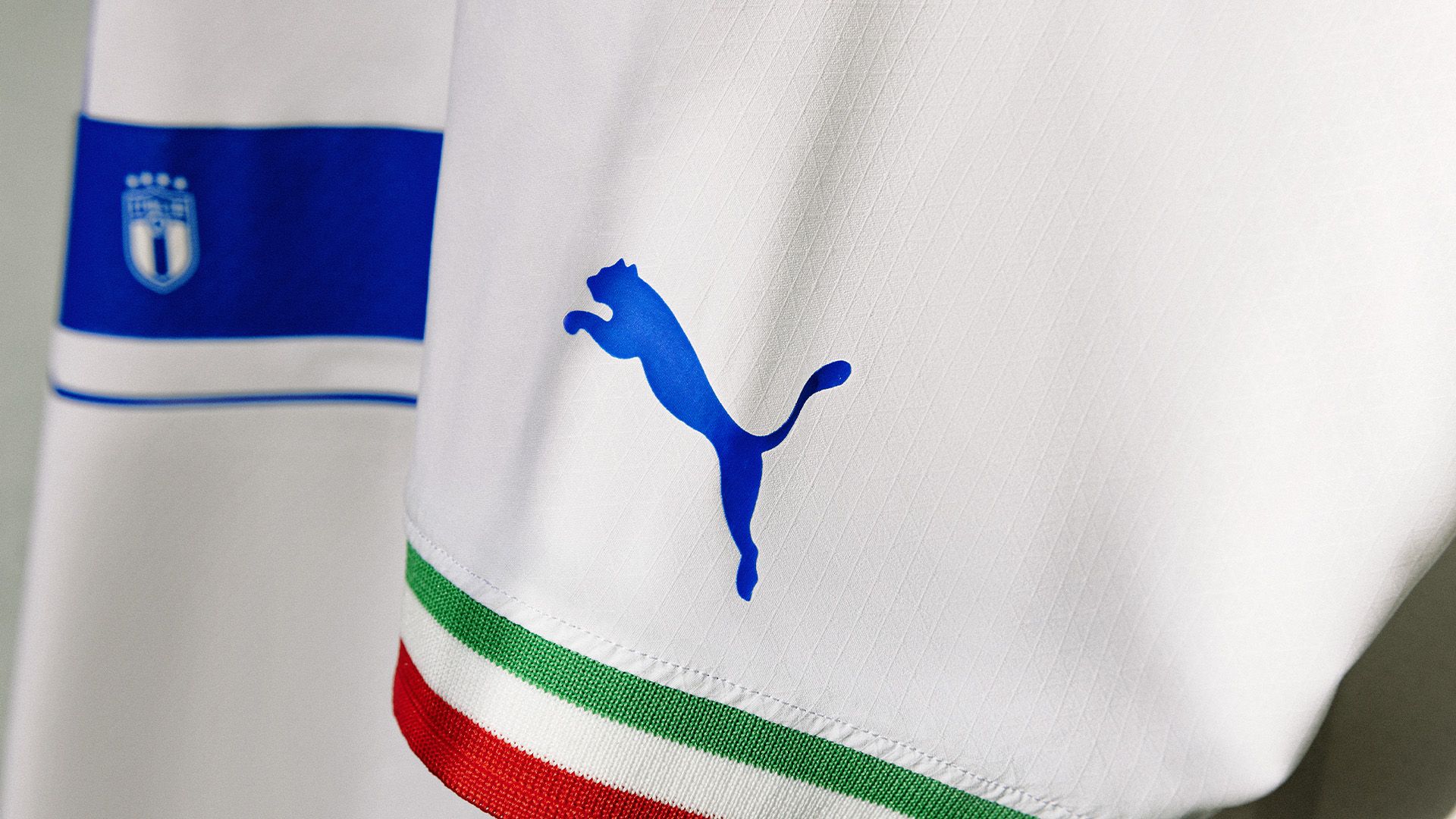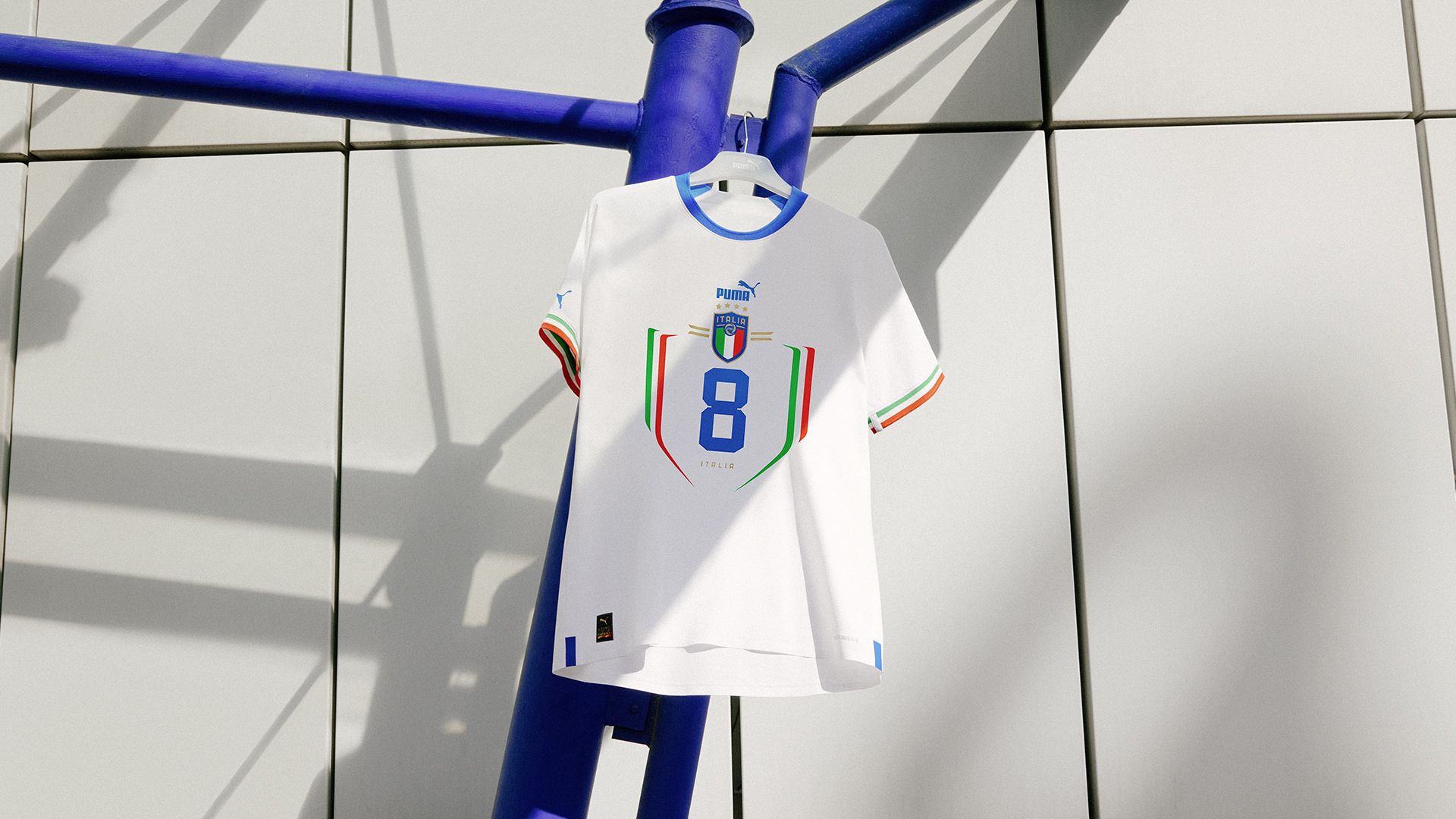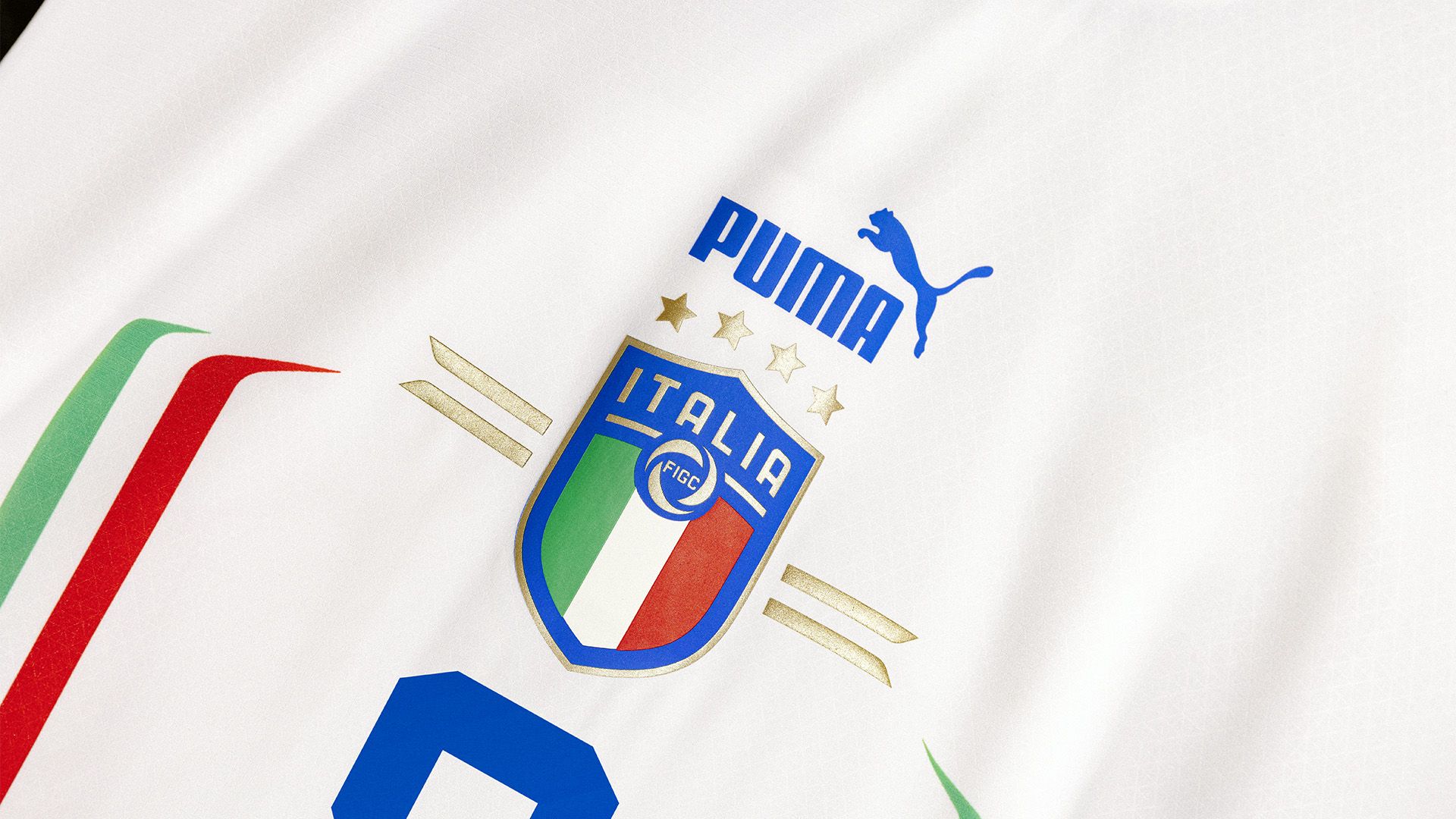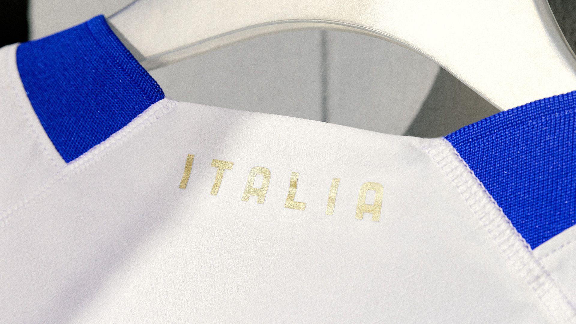 The chosen template features a shield formed by two tricolor bands, framing the game number, topped by the national team's logo above which the technical sponsor's logo is placed. The white-bottomed jersey, as is the tradition for away jerseys, also features the same tricolor bands on the sleeves while the back-neck features Italy lettering in gold. Details that PUMA chose to celebrate the identity of the flag and the golden age of the Azzurri national team.