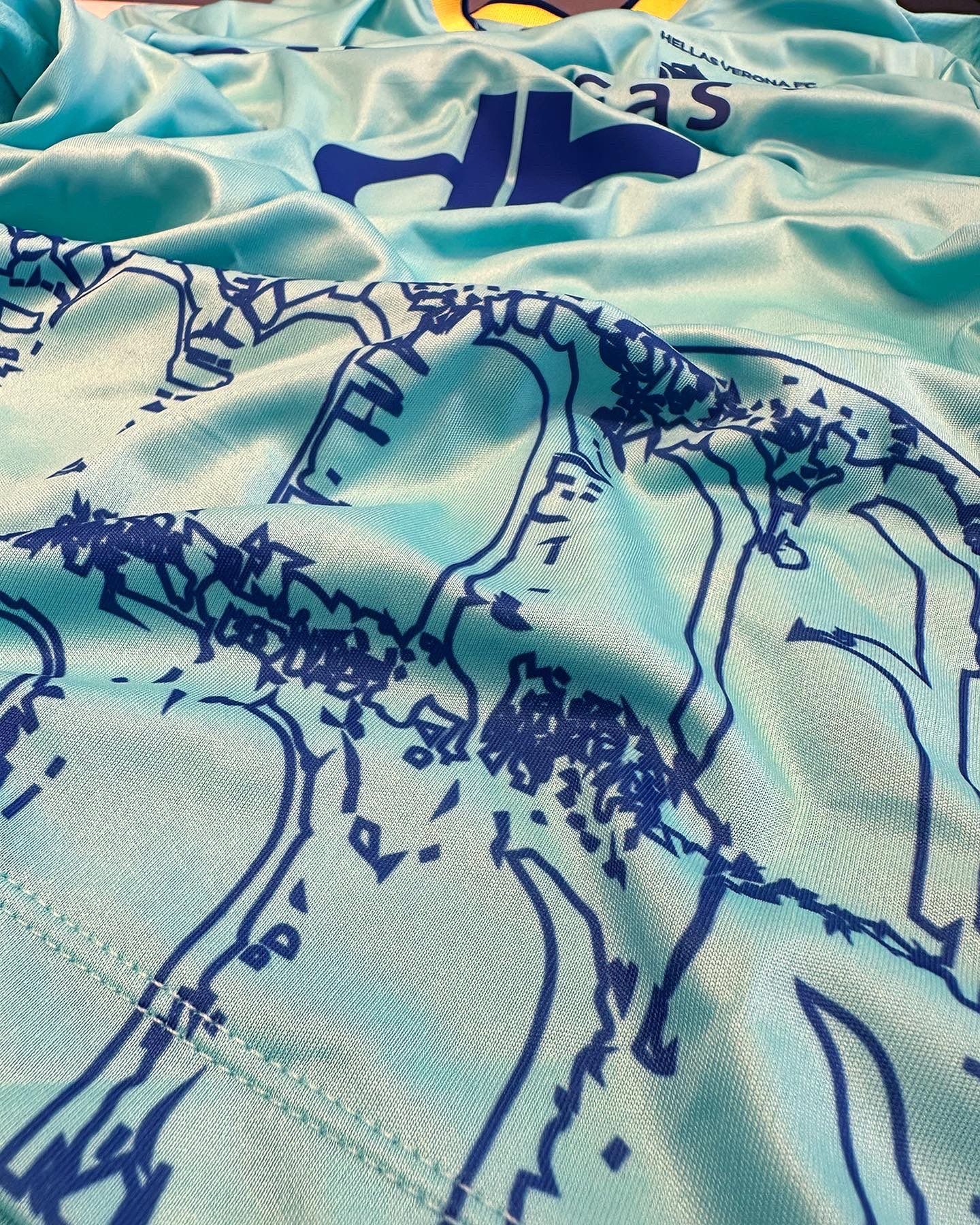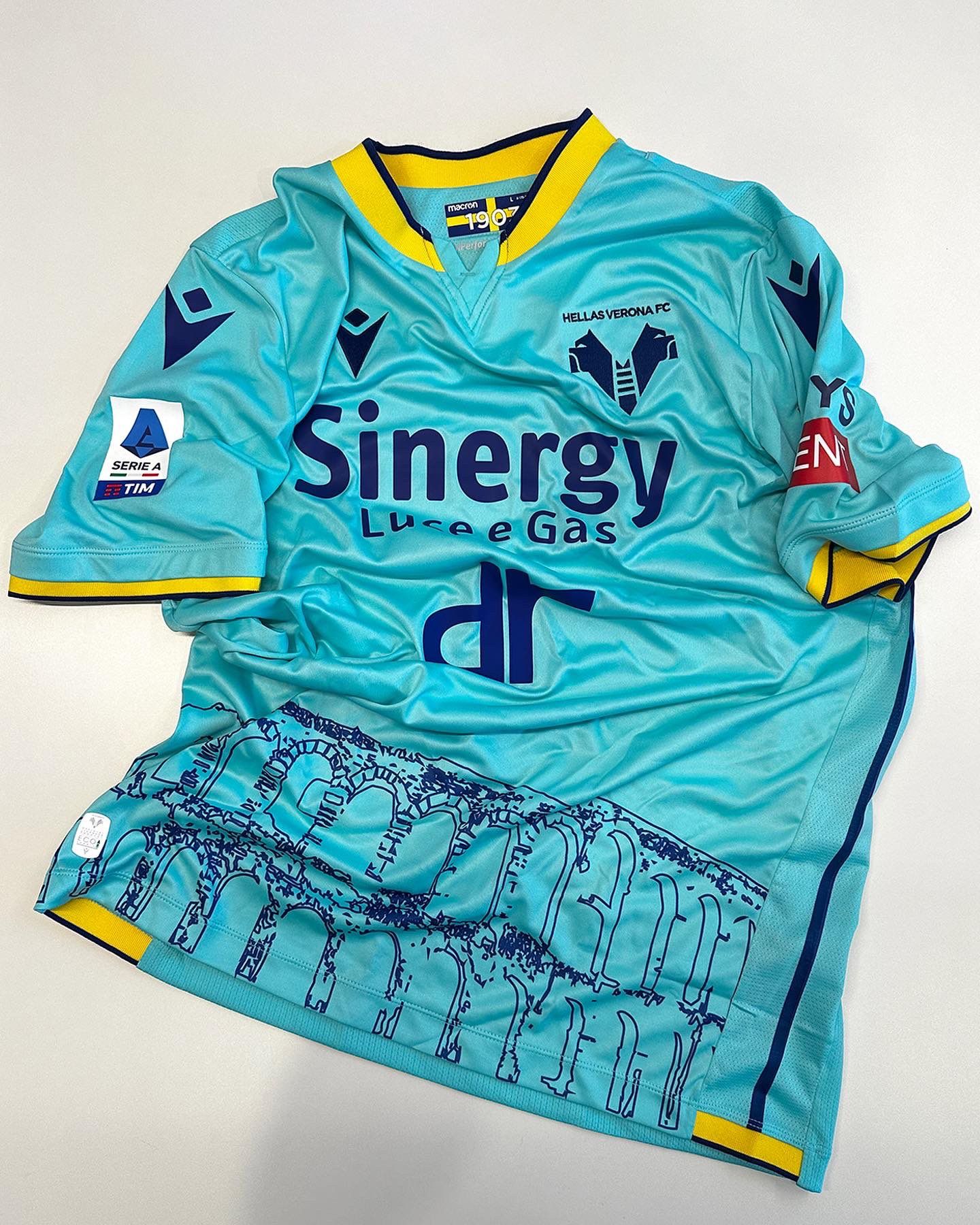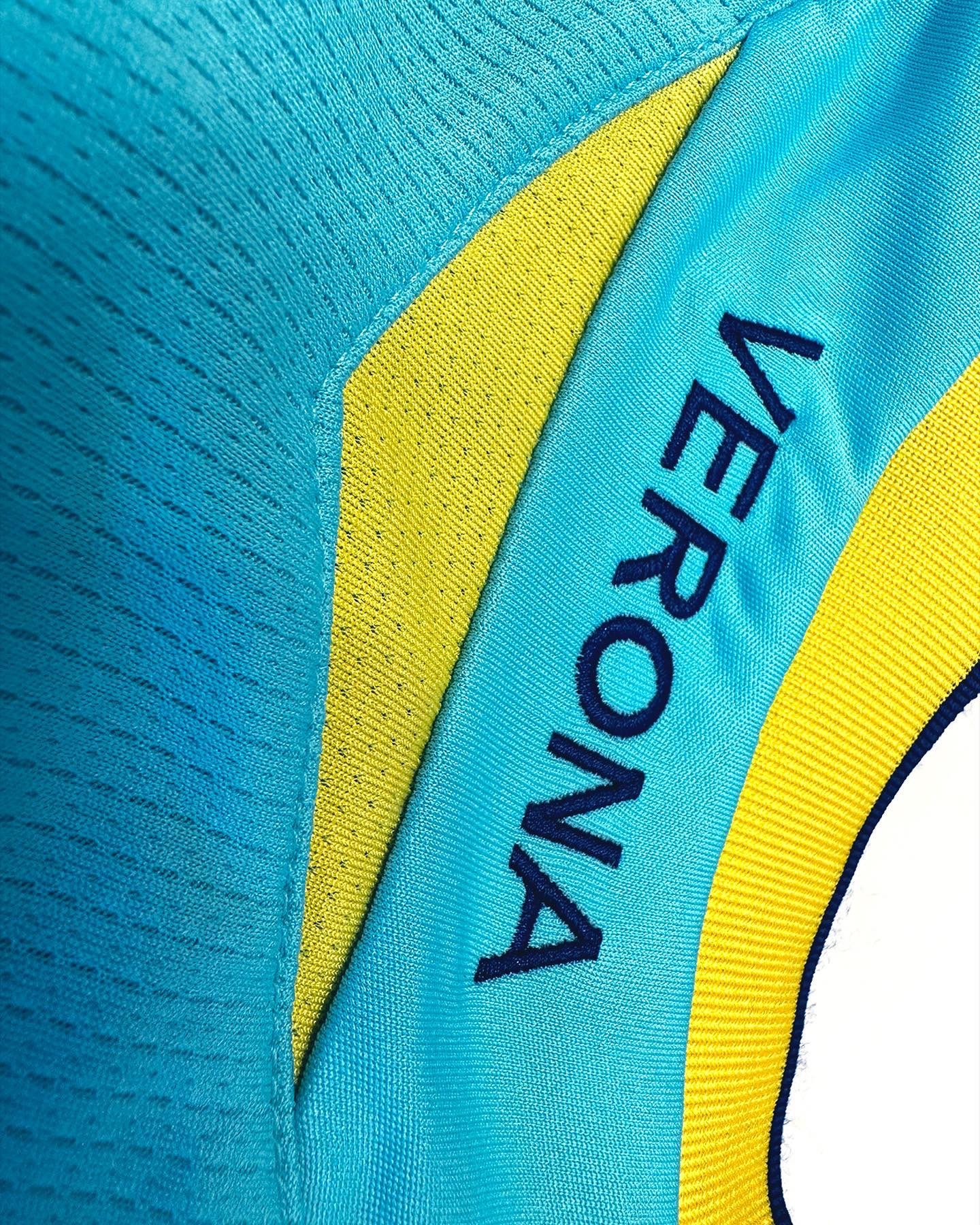 After creating two jerseys paying homage to the city of Verona and the Arc of Gavi, for two thousand years among the most important and significant symbols of the city from the Roman era and built in the first century A.D., Macron's choice for the third kit fell on the Arena of Verona, one of the world's most famous concert sites. The world's best-preserved Roman amphitheater, which has defined the city's identity for 2,000 years, has been designed at the base of the jersey, with two sets of arches printed on a turquoise base while the neckline is shaped in knitwear with yellow-blue borders. The backneck is personalized with the club's colors and its founding year, 1903, embroidered, in Verona blue, the word VERONA, as usual for this year's kits made by Macron.