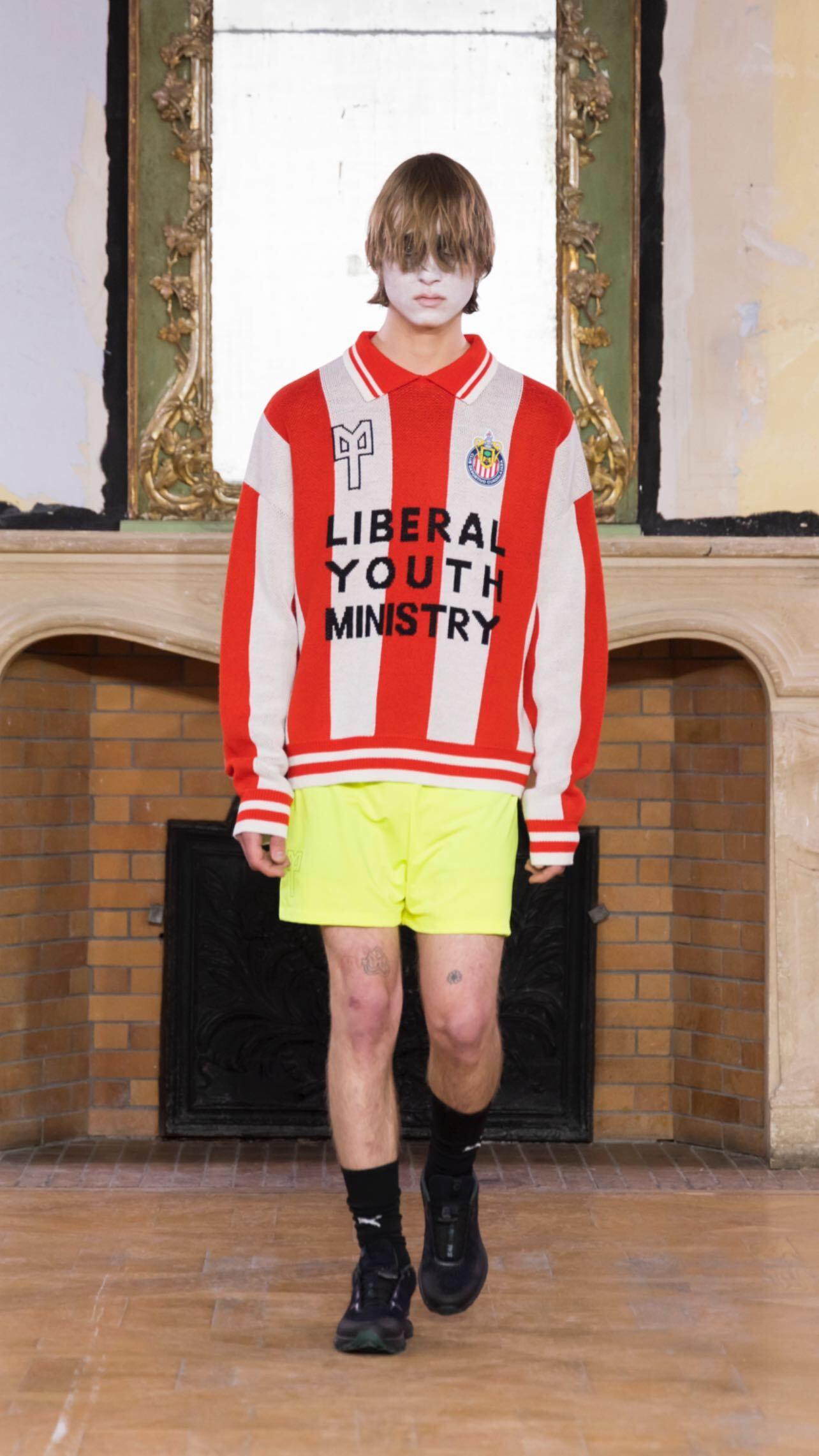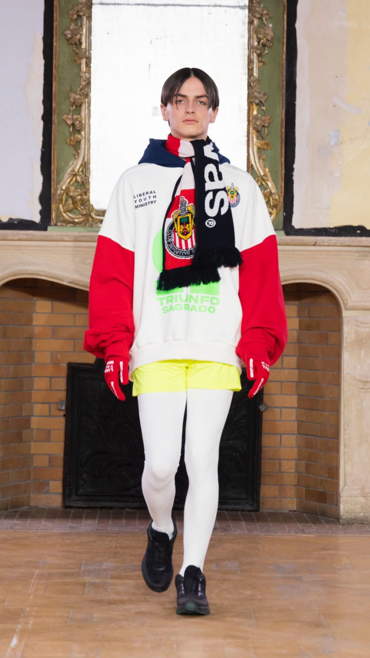 So for his first collection at Paris Fashion Week, he decided to pay homage to his favourite team with his garments. This collaboration combines the heritage of one of the historic clubs of the first Mexican league with the punk and spiritual aesthetic that characterises Liberal Youth Ministry's previous creations. The collaboration featured a wide range of garments prominently displaying Chivas' club colours and crest, including a series of footballs that accompanied the models on their outings as accessories to the fashion show.