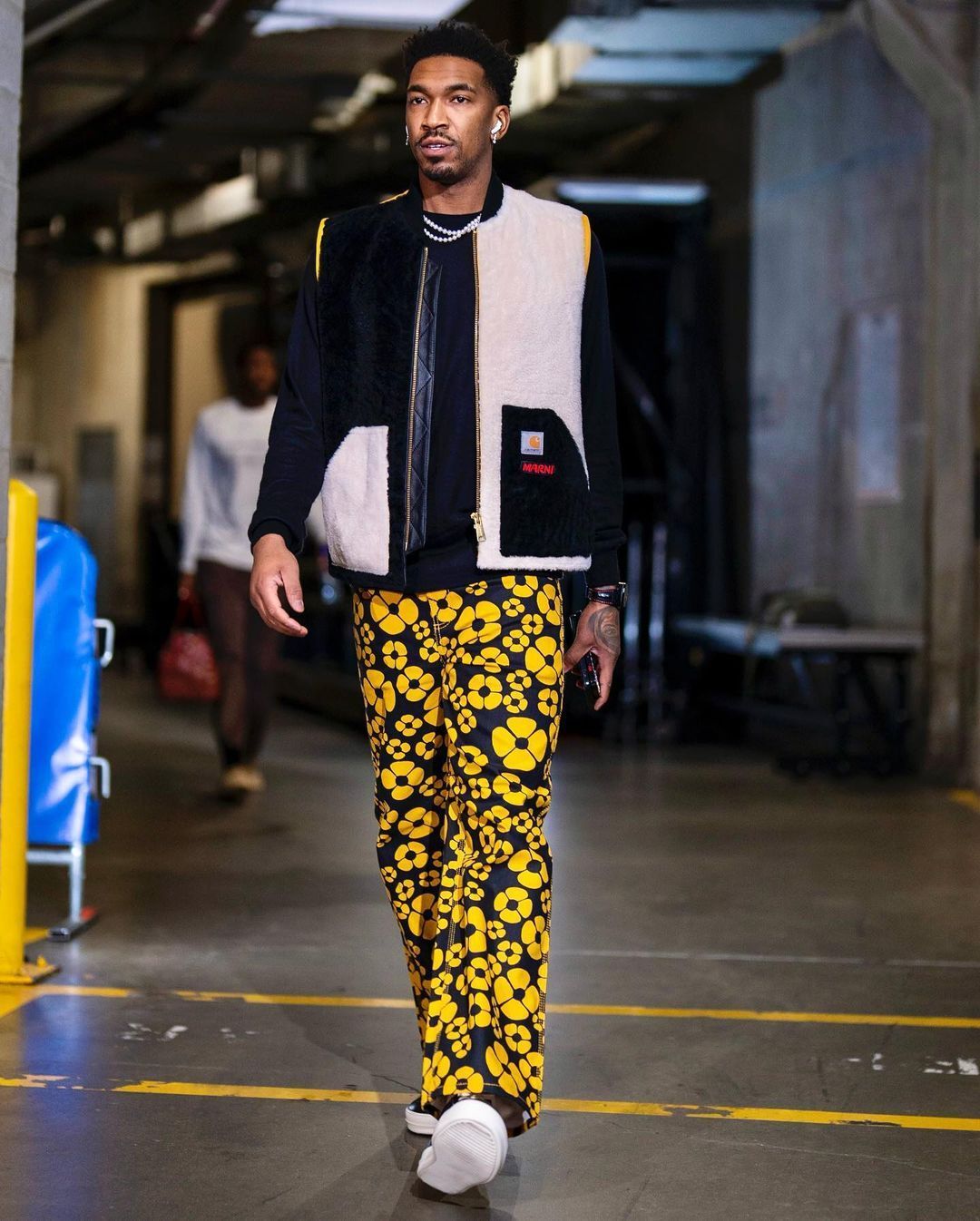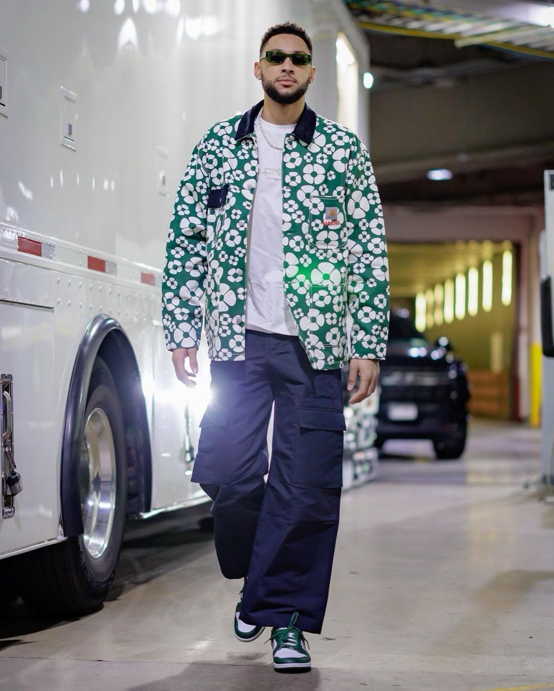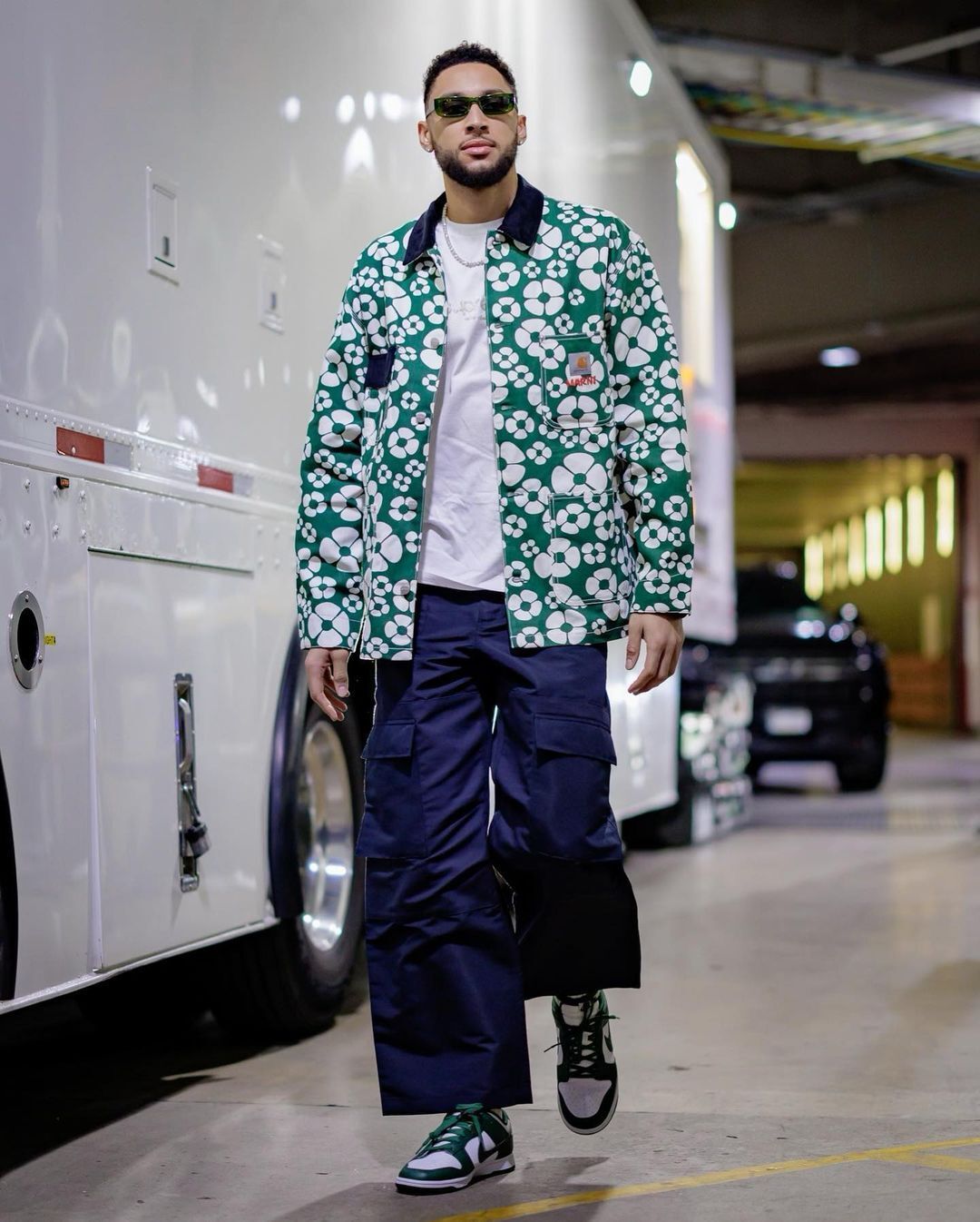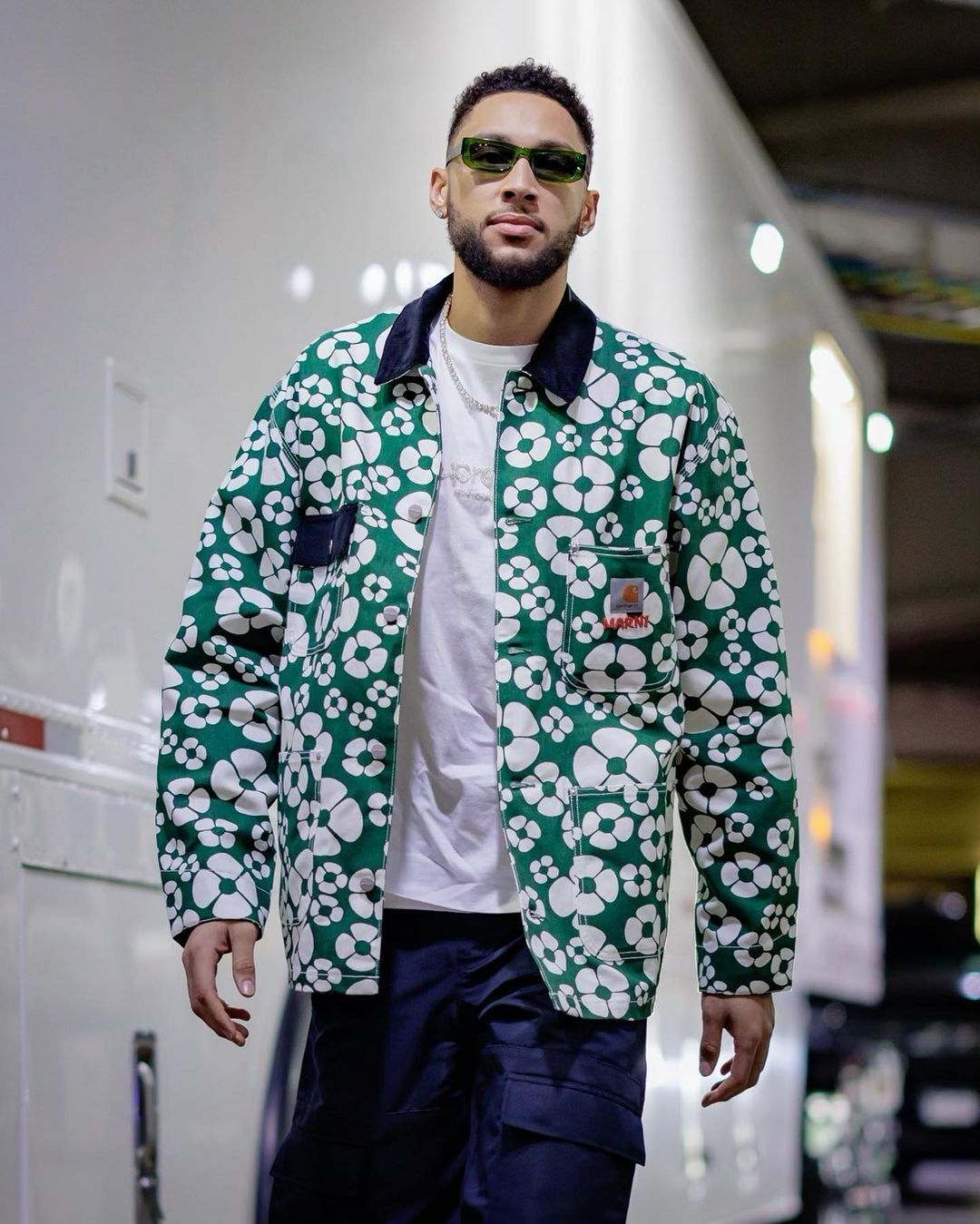 The collection, which combines American workwear and Italian elegance, was worn by everyone who came to the game last week as if there was a group chat where everyone voted on how to dress. Ben Simmons wore the floral jacket in green, Malik Monk opted for trousers in yellow and black, P.J. Tucker went for the twin suit, while Karl-Anthony Towns dressed his 210 centimetres in colour-blocking trousers and a three-quarter length jacket with the same colour scheme, obviously signed Marni x Carhartt.