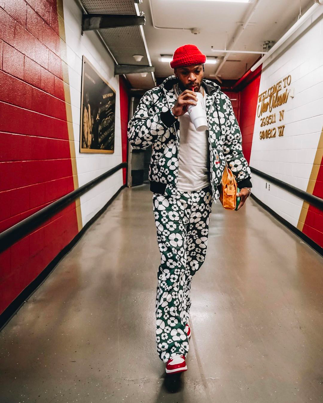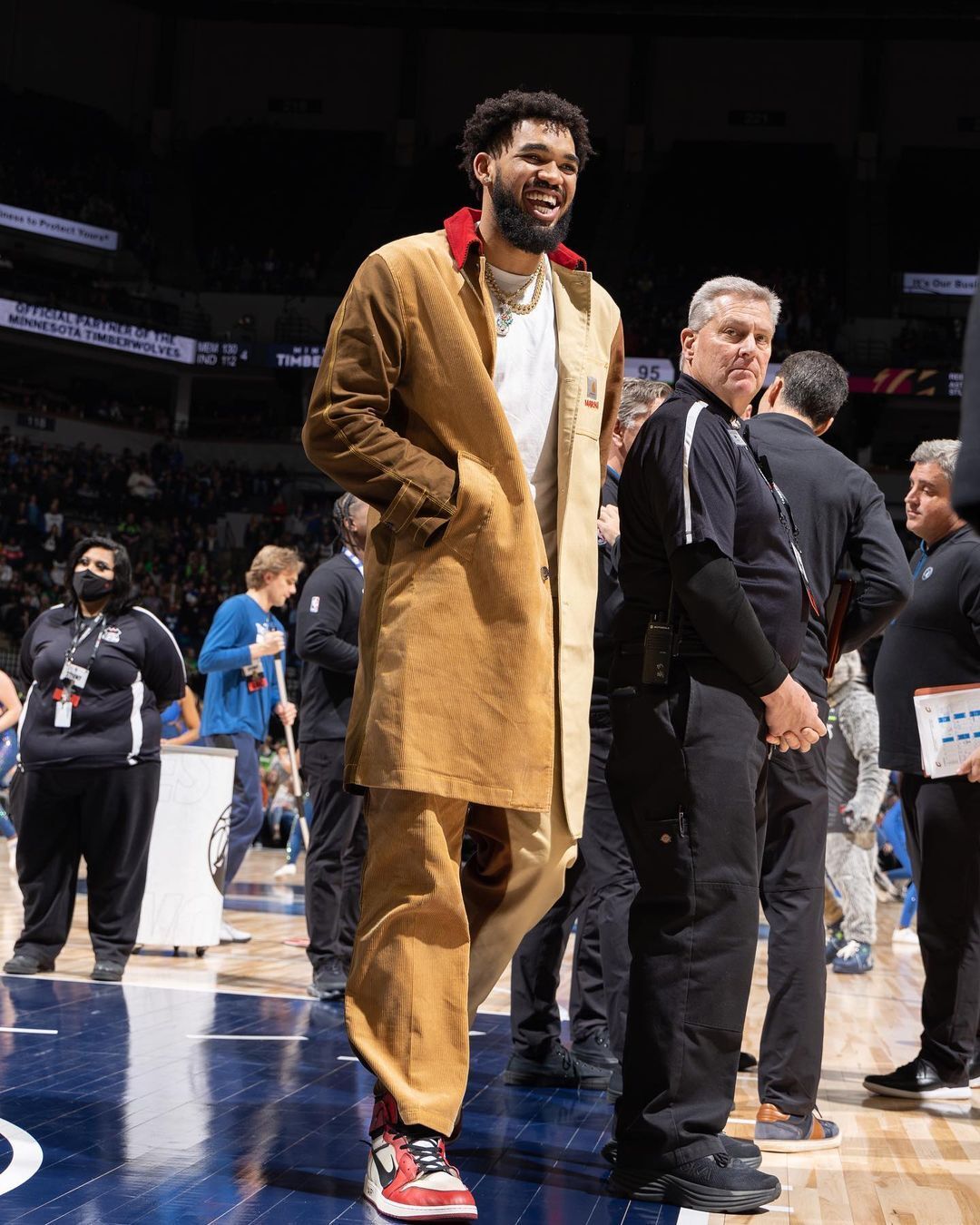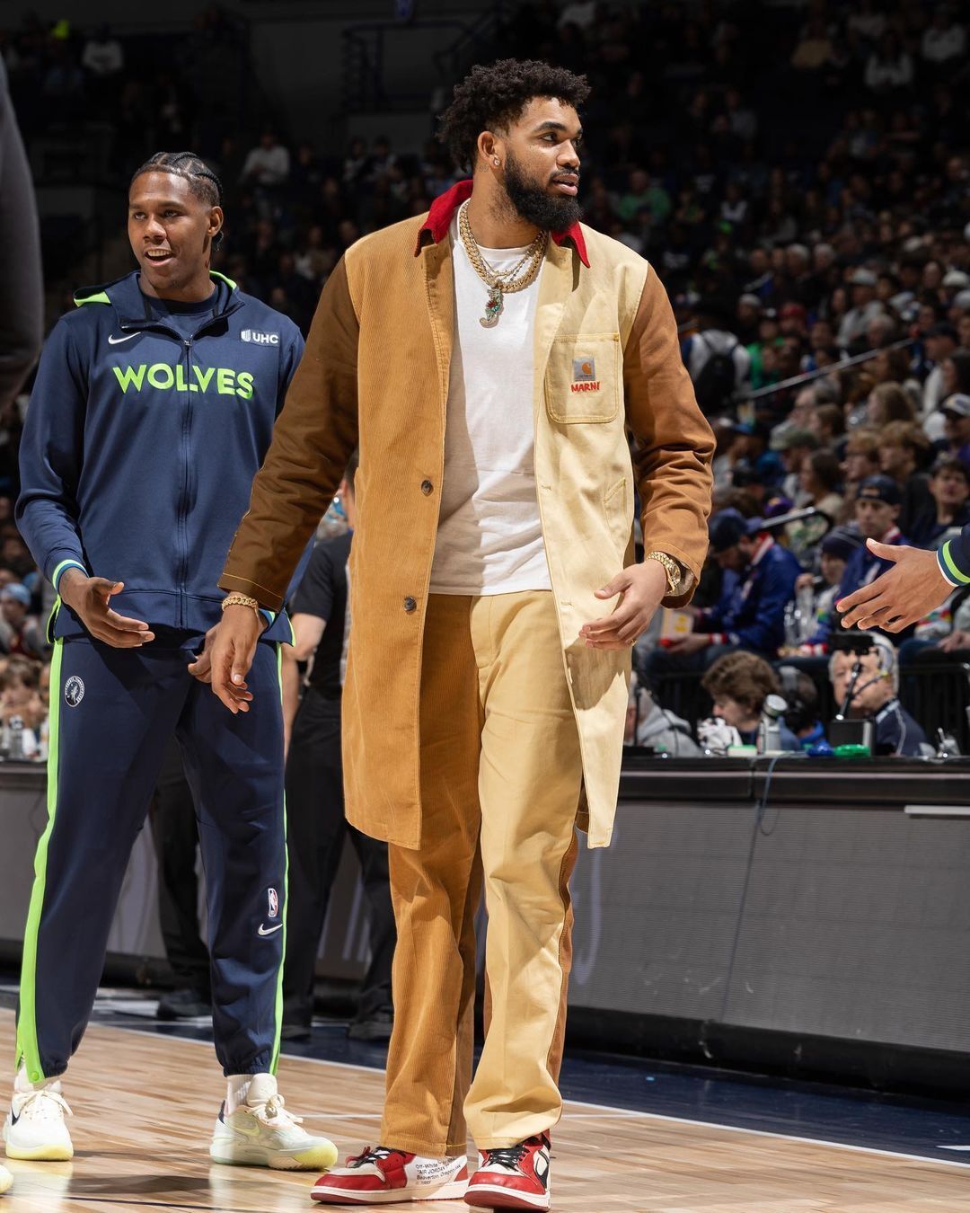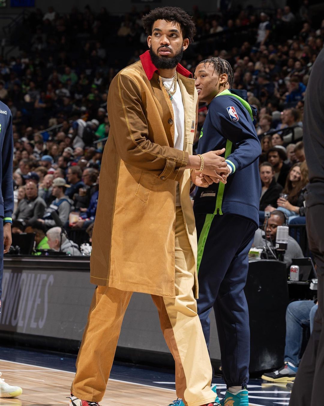 The collection, which combines American workwear and Italian elegance, was worn by everyone who came to the game last week as if there was a group chat where everyone voted on how to dress. Ben Simmons wore the floral jacket in green, Malik Monk opted for trousers in yellow and black, P.J. Tucker went for the twin suit, while Karl-Anthony Towns dressed his 210 centimetres in colour-blocking trousers and a three-quarter length jacket with the same colour scheme, obviously signed Marni x Carhartt.