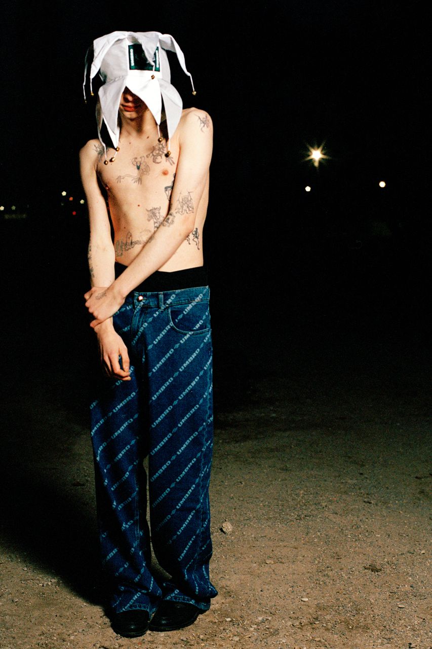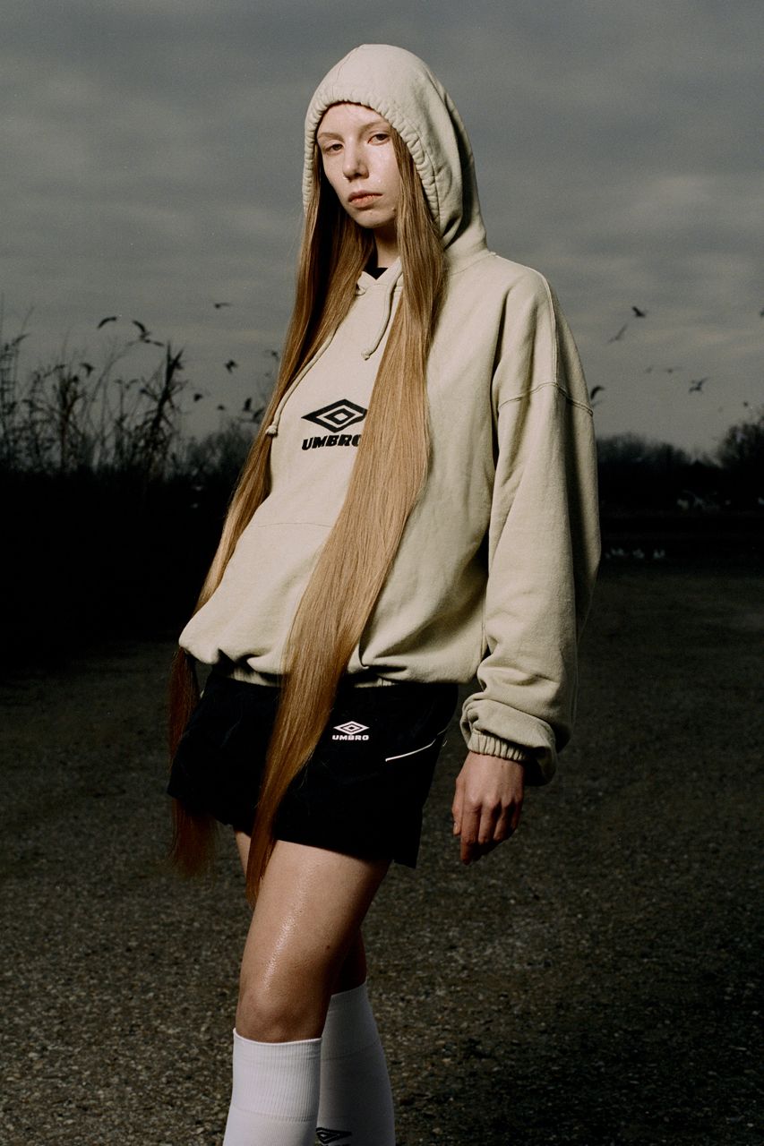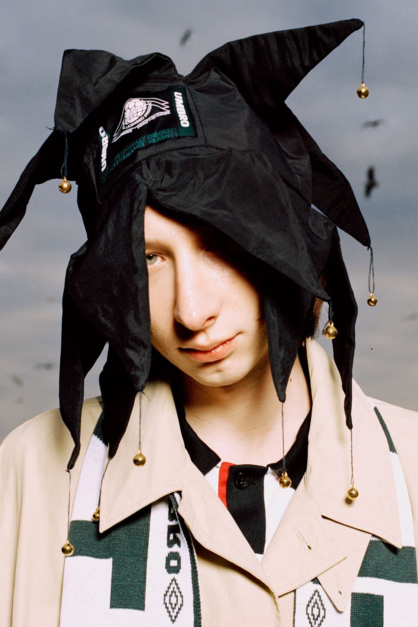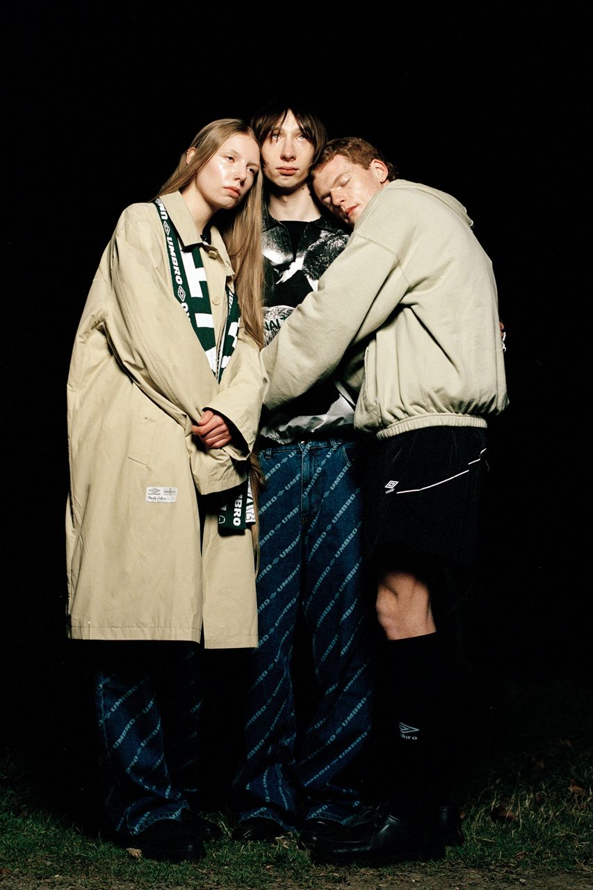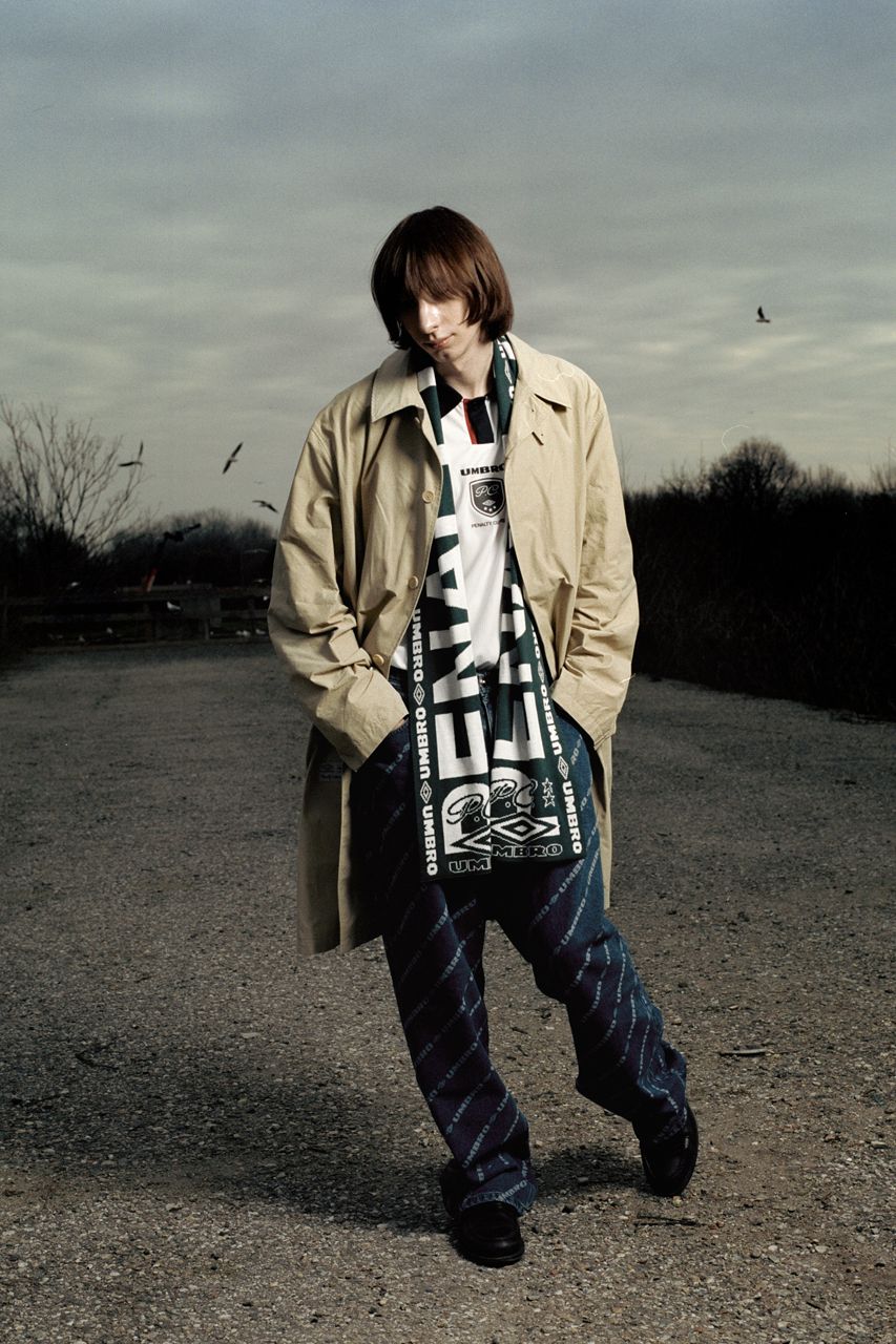 The collection is rounded off by football scarves with an intarsia pattern in green and white with the same 'Penalty Culture' motif, while the jester caps pay homage to a time when football culture was not so welcoming in the 80s and 90s. A unique collaboration, Benini explains: 'We are very happy to partner with Umbro. We have the opportunity to immerse ourselves in an incredible heritage of football culture to celebrate and develop dialogue with our communities'.