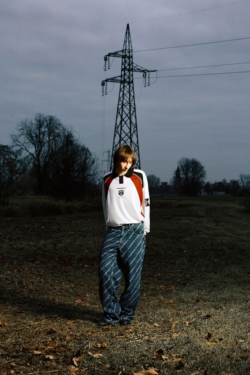 The jersey, inspired by the jerseys worn by the England national team during the Umbro sponsorship period, is in red, cream and black and features the words 'Penalty Culture' on the front, as well as the personalised 'P.C.' crest and the brand's trademark. The same claim was used for the bomber jacket, which features a print with a black and white photo of young footballers meeting to talk tactics, which can also be found on the back of one of the T-shirts. Also included in the collection are classic stadium dresses, a trench coat, jumpers, shorts and pullovers, and a pair of jeans with the Umbro logo running the length of the leg.