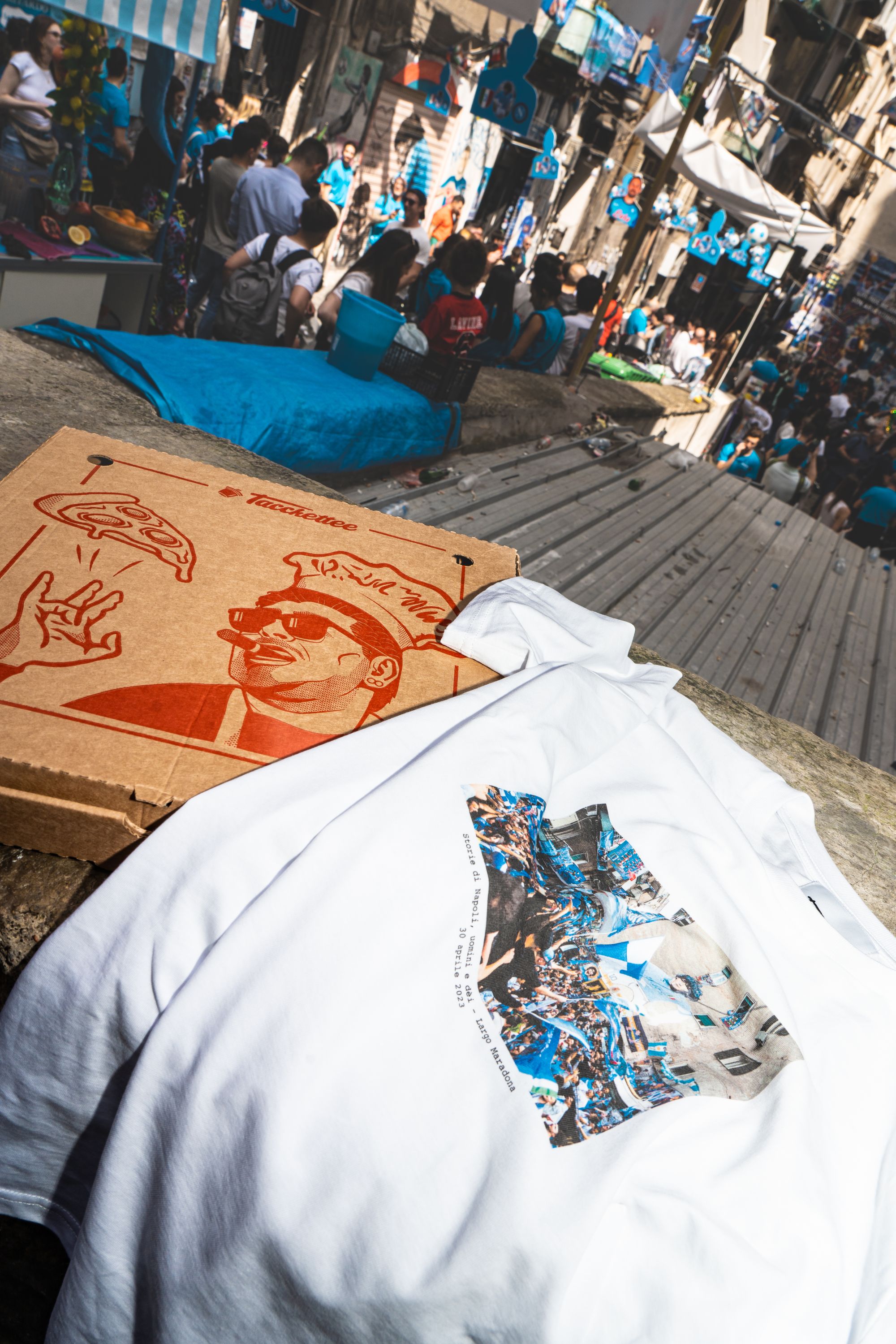 The new Tacchettee and nss sports jersey taken in the streets of the city portrays one of the many moments experienced at Largo Maradona, which encapsulates all the essence of this Scudetto and the happiness of an entire city. The print on the white jersey depicts a view of the mural, under which a tide of Azzurri fans celebrate with flags and Italian flag, also waving from the balconies, celebrating a moment that Neapolitan citizens will hardly forget. A pizza box, as much a symbol of joy in Naples as Osimhen's goals, was designed as a commemorative tee box.