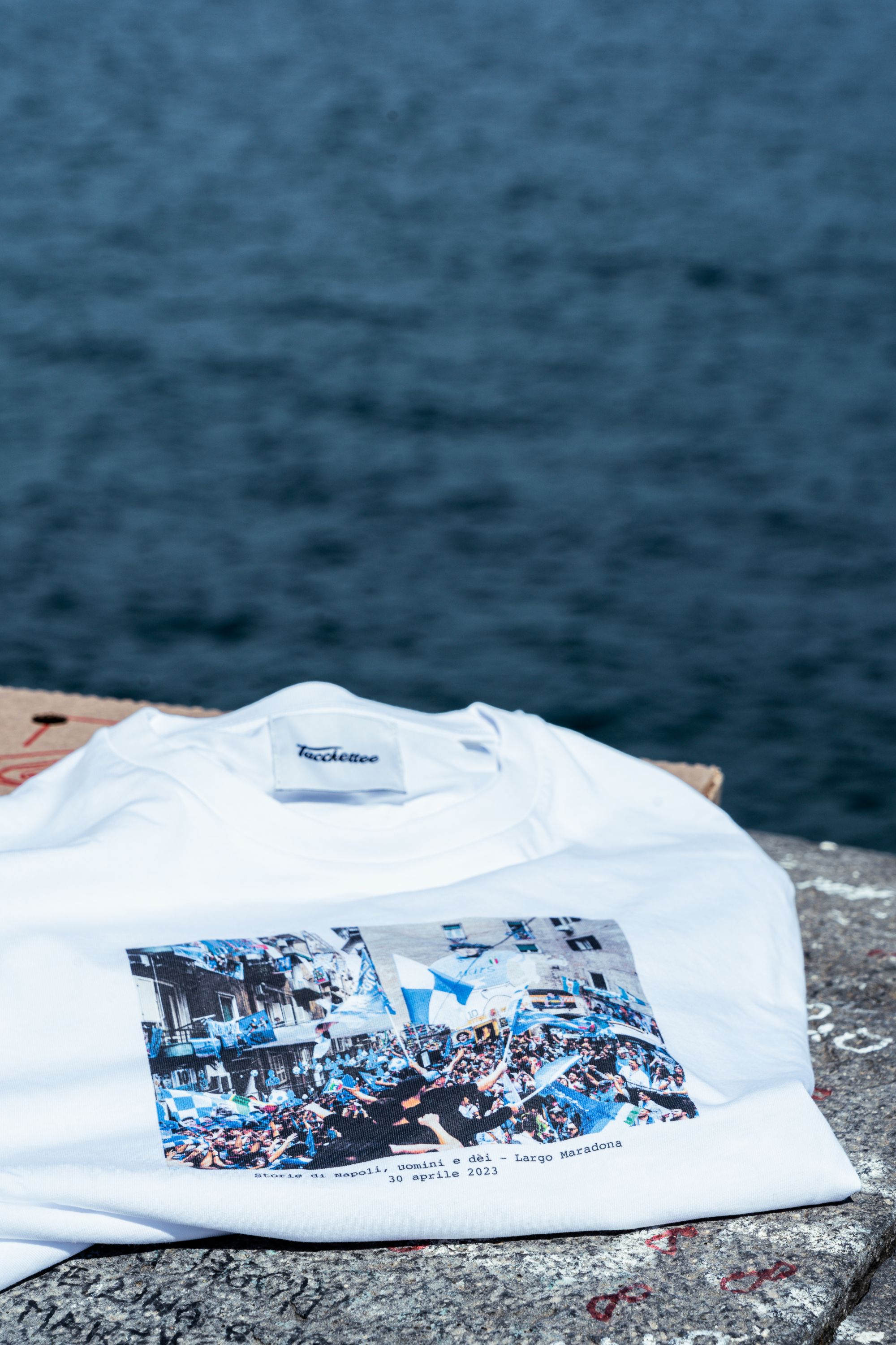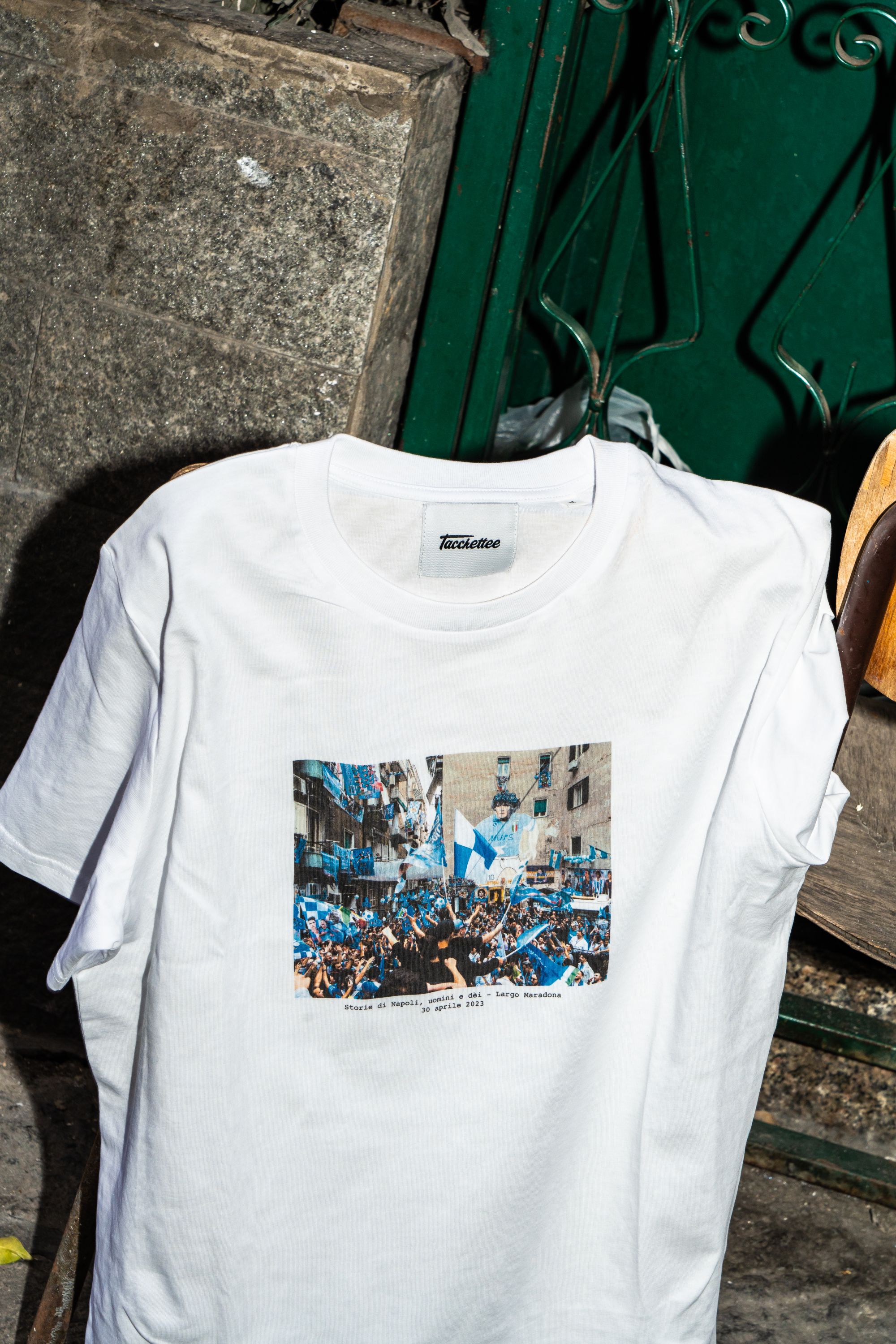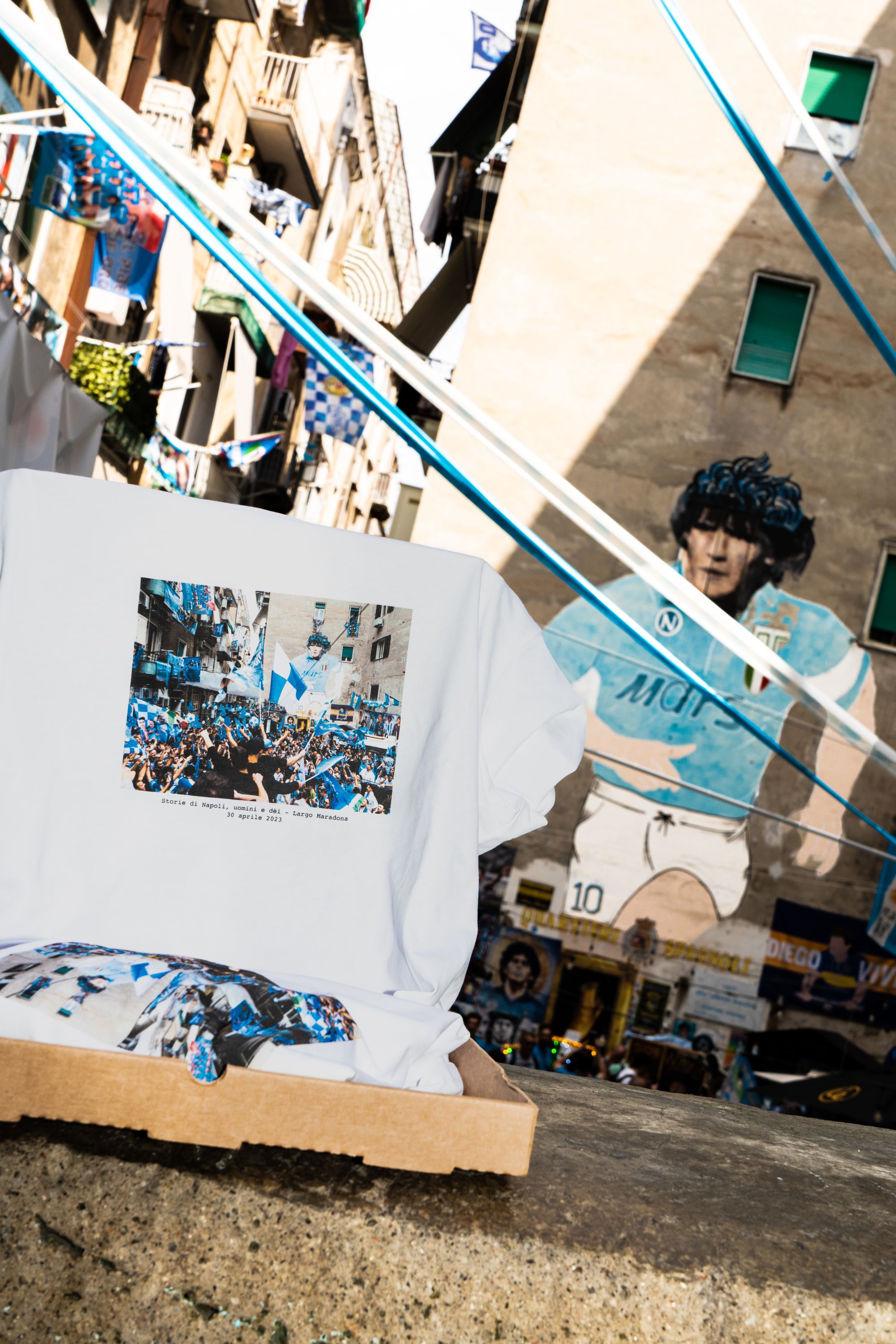 After the first t-shirt launched a few weeks ago and dedicated to the Scudetto won by Napoli in 1990, nss sports and Tacchettee have launched a new t-shirt, celebrating the title awaited for 33 years. The celebration on the streets of Naples was huge and will continue in the coming weeks, from the Lungomare Caracciolo to the Quartieri Spagnoli, where crowds of fans rushed to worship the footballing legend Maradona under the famous mural that represents him and gave his name to the square named after him.