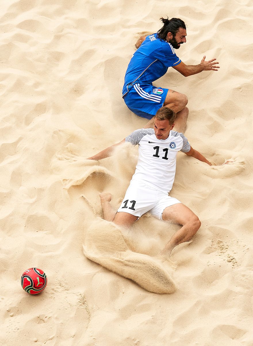 In beach soccer, the dimension of the space in which the ball travels also changes. Actions in which the ball is held high and the touches are made on the fly are opposed to the ball on the ground and short touches, certainly to counteract the unpredictability of the dunes, but also because otherwise how would one be able to do overhead kicks? Before traditional football was very much influenced by the pitch and by the clods of land, now at a certain level the ground is no longer such a relevant discriminator, as if perfection were placed at the service of the gesture and the ball thrown into a black hole where there is no friction. On the other hand, in beach soccer you play with dunes, they are used to kick and to raise sand that disturbs the opponents, to defend the ball and for stability.