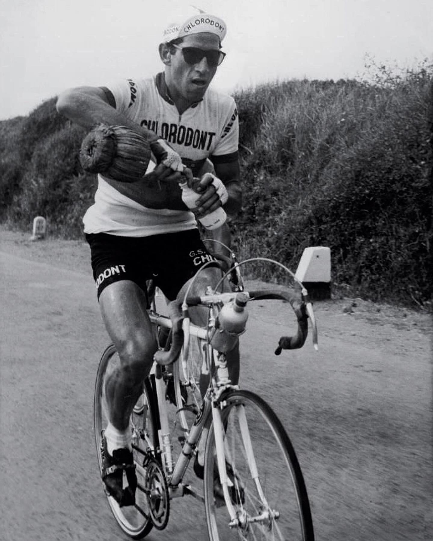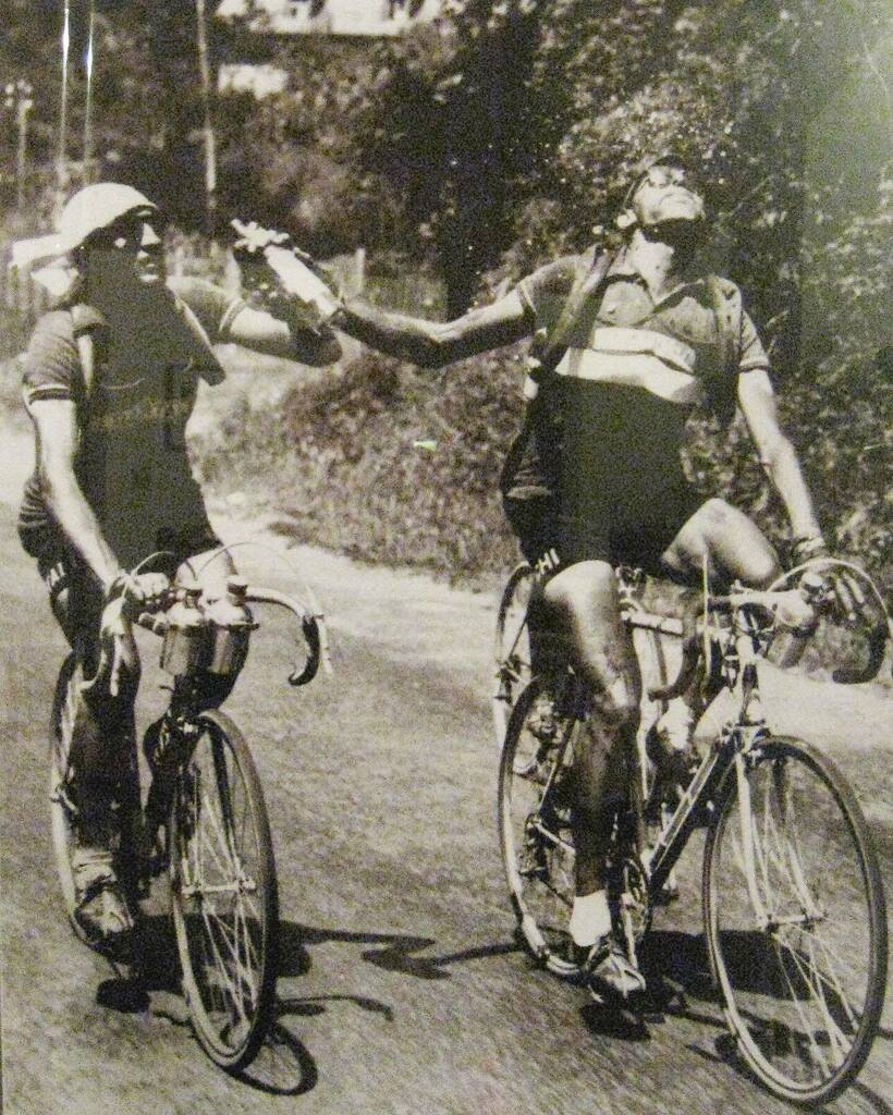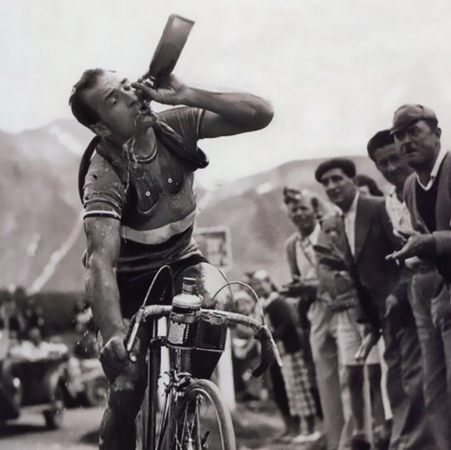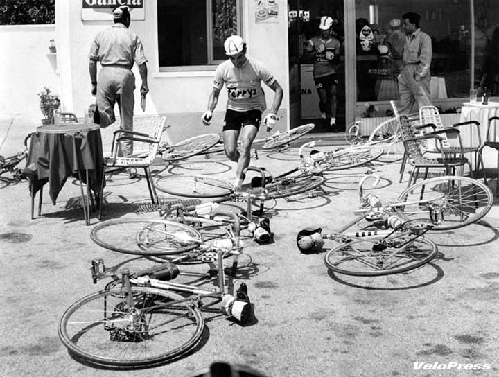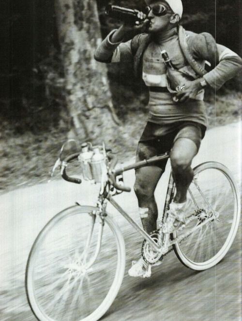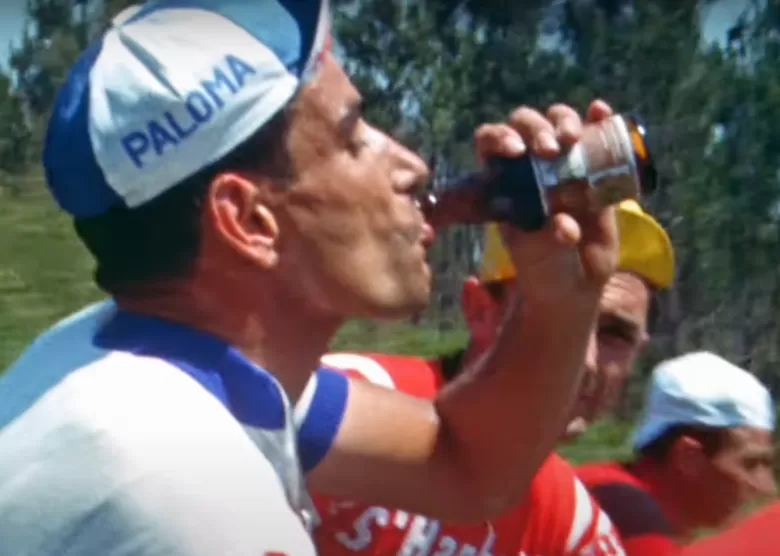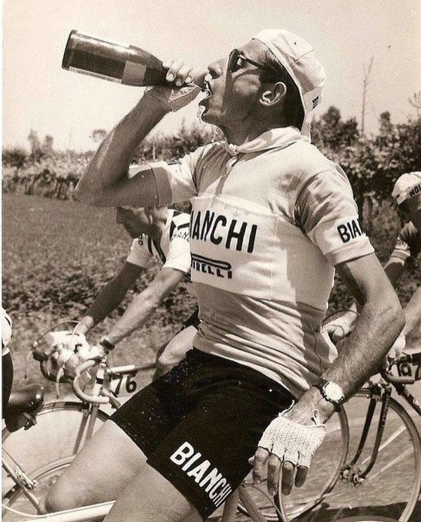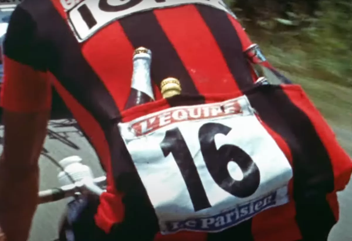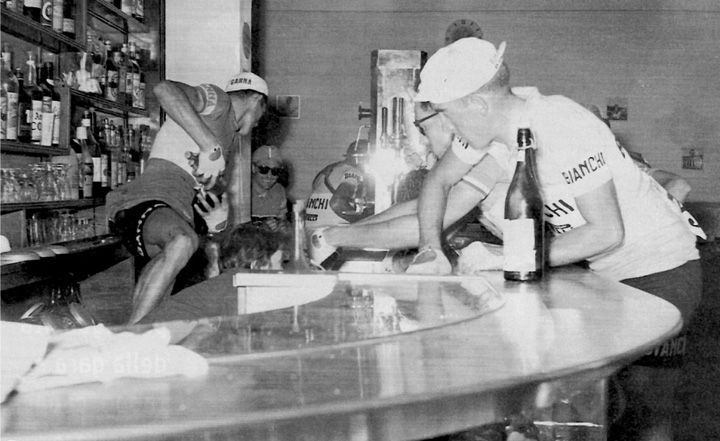 Which is why the concept of the Café Raids during the 1950s-60s Tour de France and Giro d’Italia races is so brilliantly ludicrous when looked back on today. Yes, the top athletes of their day would raid local café’s and bars mid-race. Alcohol was something cyclists would drink during races from the inception of the sport. Safer to drink than water from roadside wells, but also supposedly very good at numbing pain and muscle discomfort, but it was also during a time where the amount of fluid cyclists could receive was controlled. According to 1962’s ‘Vive le Tour’ the “drinking raid” was “one of the most important moments of the Tour” – in short riders would fly off their bikes when approaching a bar or café, shoving anyone and anything out of their way before ransacking the bar of all it’s drinks: red wine, champagne, beer and sometimes water but only “if there’s nothing better.” They would then vanish as quickly as they entered, back pockets bulging with glinting glass bottles and silver foiled champagne bottles poking out of the top. The need was simple, all that riding in the heat means a lot of fluid and weight lost in the body that needed to be recouped “so you have to drink and drink” as the 1962 doc would tell us.