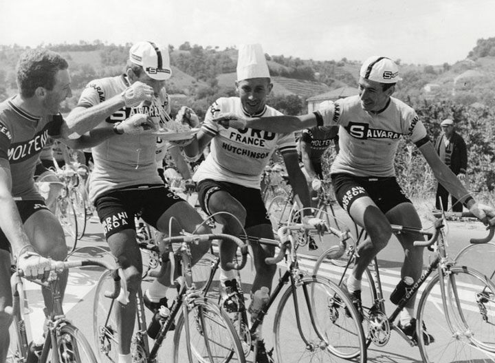 Not technically considered theft, as even though the riders made off without paying, the Tour organisers would receive a hefty bill to cover the costs at the end of the race. The proprietor of the bar would also be left with a story he'd only be happy to retell for many years to come. It’s hard to imagine that the alcohol made the riders faster or improved their performance, quite the opposite would be true. The organisers of the Tour have put an end to the Café Raids thanks to a better understanding of the importance of hydration. These days electrolyte drinks, power bars and gels have replaced the need for cyclists to binge on champagne, as well as teams of chefs and nutritionists following the riders throughout the stages of the Tour. But could there be more fitting imagery for its time than slickly uniformed Tour de France riders in the 1960s raiding bars for wine and Champagne?