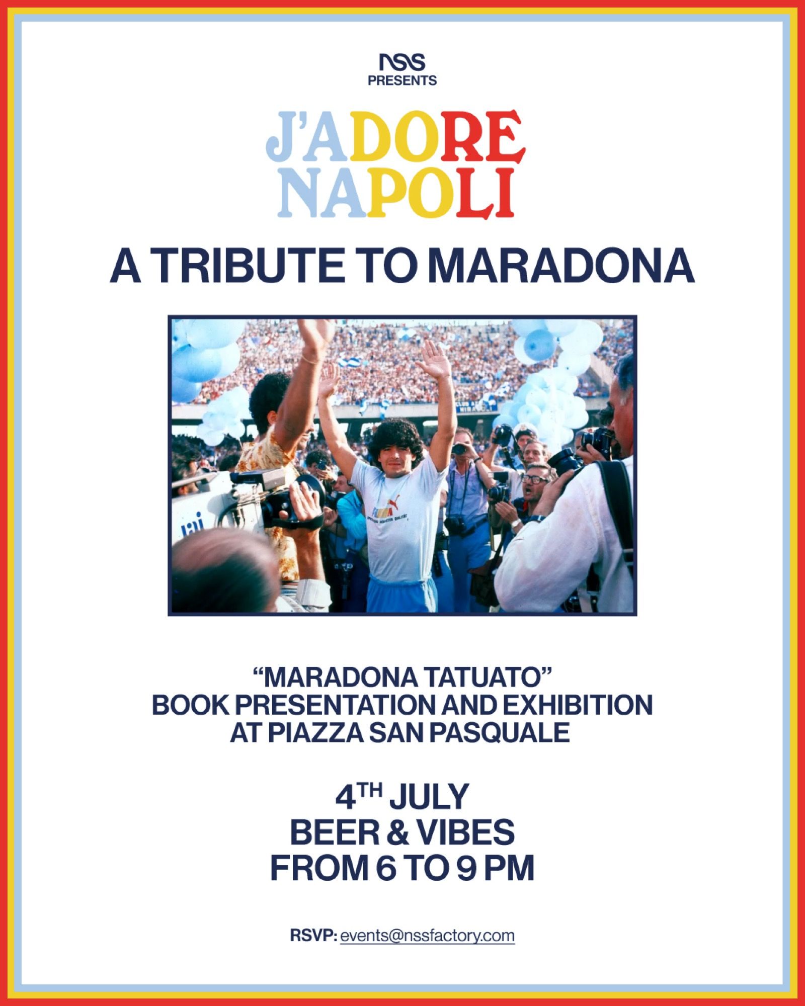 On July 5, 1984, at the San Paolo Stadium in Naples, Diego Armando Maradona was presented for the first time wearing the blue jersey, welcomed by approximately 80,000 spectators who paid the symbolic fee of 1000 lire to see him step onto the pitch. It was an epochal event, a day when many Napoli fans found a new deity to believe in. July 4, 2024 marks 40 years since that special date: nss sports chooses to celebrate it with various initiatives between Largo Maradona and Piazza San Pasquale. NSS Sports' initiatives are diverse: from the launch of the book Maradona Tatuato, to a photographic exhibition featuring images from the book. These include a selection of collectible cards and a commemorative shirt reminiscent of the colors that adorned Diego Armando Maradona's PUMA t-shirt on July 4, 1984. Finally, also the screening of a documentary on D10S. You can register here.